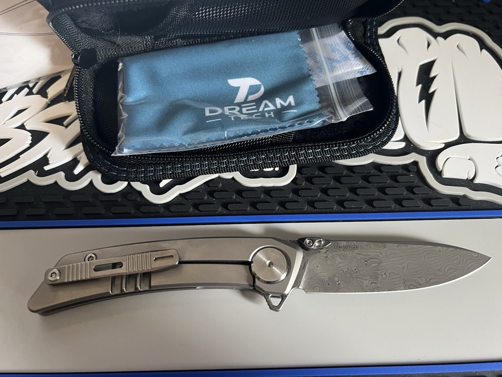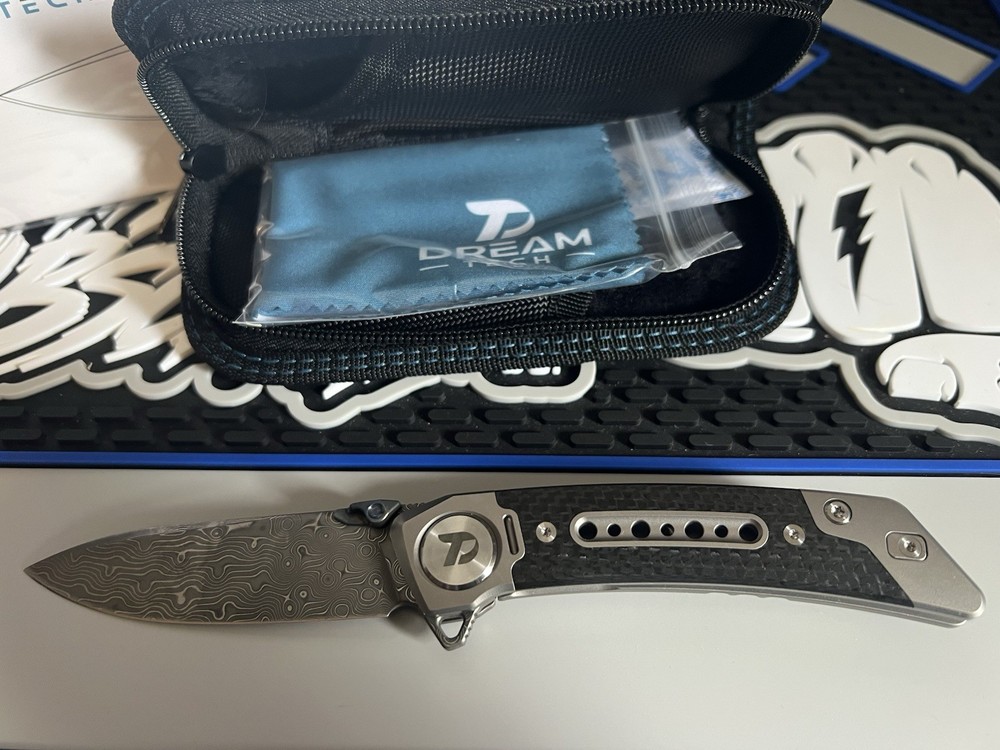 Brand new. Never used, cut, or carried. The Dreamtech Folding Knife with a 3.25" Damascus Steel Blade and Titanium/Carbon Fiber Handle is a modern, collectible pocketknife designed for both left and right-handed users. The extended tang and drop point blade ensure precision and reliability, while the manual opening mechanism and frame lock provide security. The gray color and sleek design make it a stylish and functional addition to any knife collection. With a durable construction and original features like a thumb disk and pocket clip, this knife is a high-quality product from Dreamtech.