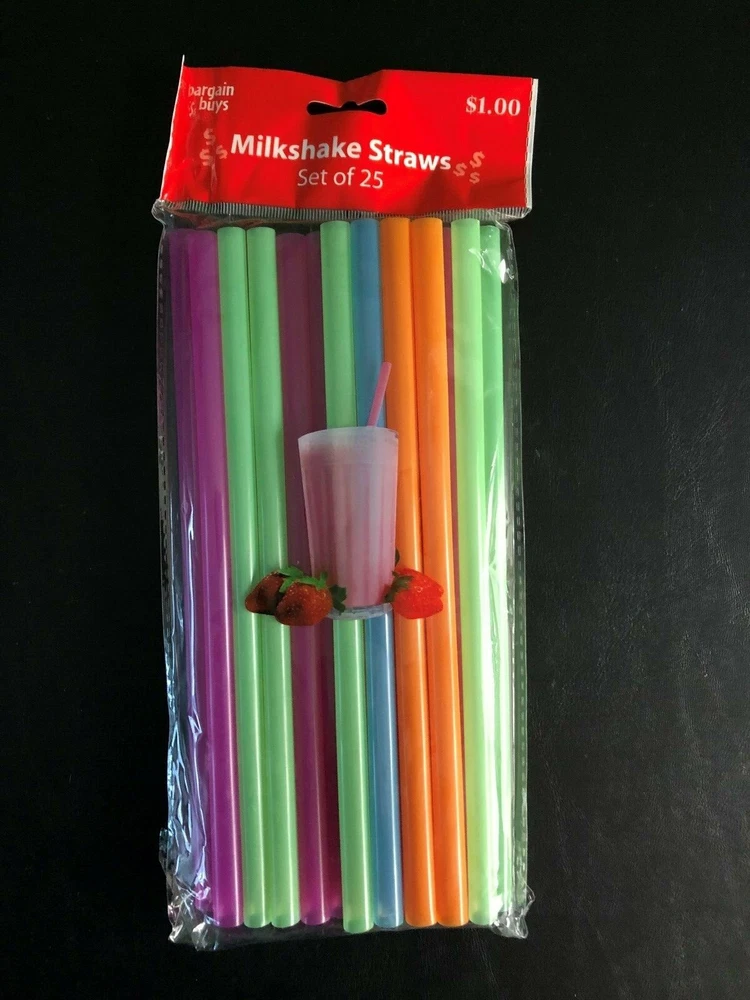 Drinking Straw Assortment 2 packs of 25 milkshake straws (50). 2 packs of 10 paper straws (20). 2 packs of 6 star straws (12). 1 pack of 100 flexible drinking straws