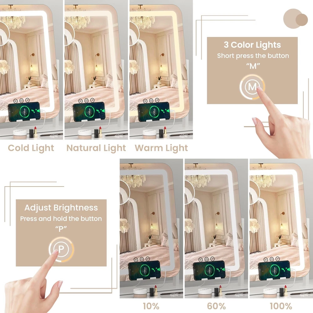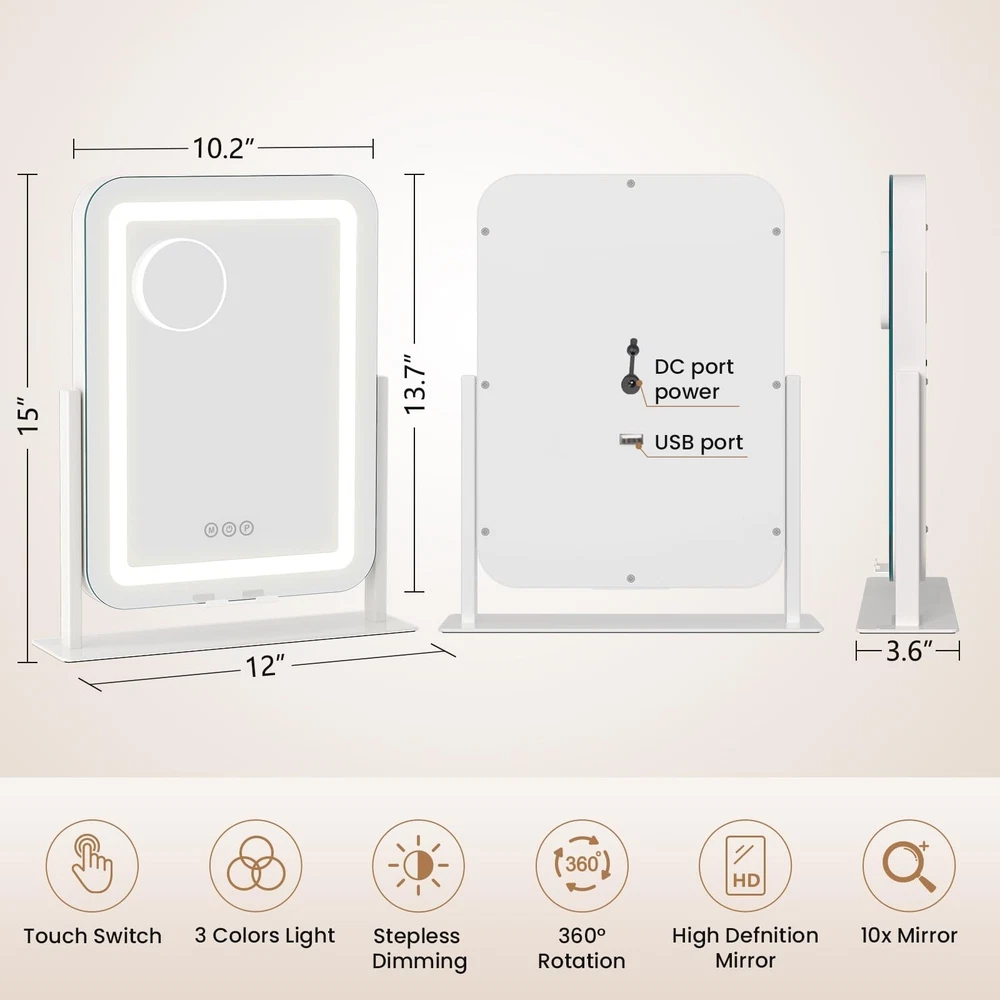 Dripex LED Lighted Makeup Mirror with USB Charging Port 3 Colors Dimmable 15"x12" Vanity Mirror with Lights Smart Touch Phone Holder 10X Magnification for Vanity Desk Product Details Color: White-usb Charging Size: 15"L x 12"W Brand: Dripex MPN: DV UPC: Does not apply EAN: Does not apply Brand: Dripex Room Type: dressroom Shape: Rectangular Product Dimensions: 15"L x 12"W Frame Material: Metal Brand: Dripex Room Type: dressroom Shape: Rectangular Product Dimensions: 15"L x 12"W Frame Material: Metal Style: Modern Mounting Type: Dresser Mount Finish Type: Polished Surface Recommendation: Glass Special Feature: Corded Color: White-usb Charging Number of Items: 1 Material: Metal Frame Type: Framed Assembly Required: Yes Frame Color: white Manufacturer: OunuoDirect Size: 15"L x 12"W Item Weight: 5.52 pounds Item model number: DV Date First Available: September 30, 2024 Mobile Phone Charging is ConvenientThe USB charging and phone holder of the LED lighted makeup mirror will provide great assistance when we watch tutorial videos for a long time to learn makeup. They can keep the phone fully charged and free your hands Perfect Makeup Angle360rotating large vanity mirror with lights can help us find the most perfect visual angle to enjoy the makeup process, the detachable 10x magnifying round mirror allows us to easily adjust eyeliner, eyebrows, lipstick; Bedroom dressing room dorm room essentials for girls Comfortable and Safe Lighting EffectsWe can adjust the light up mirror brightness from 10% to 100% by long pressing the P button, and select 6000k cold, 4000k natural or 3000k warm by short pressing the M button; CRI>90 eye protection LED light strip with 120 lamp beads, service life of 50,000 hours, We can experience the most realistic makeup We Can Trust The Dripex Vanity Mirrors MaterialDripex HD makeup mirror uses aluminum alloy frame and base, explosion-proof tempered glass, and eye-protection LED light strip. The base with non-slip rubber makes the mirror stable. Excellent material, solid structure, safe and beautiful We Can Trust Dripexs Services After SalesDripex lighted cosmetic tabletop mirror is not only a mirror, but also your beautiful decoration of the dressing room and the bedroom. If you received a defective product, please do not hesitate to contact us to solve the issue for you.