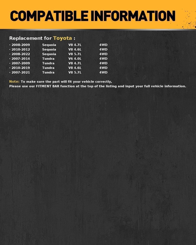 CV axles serve as the final link between the engine and the wheels, transferring power from the vehicle's transmission and differential to the wheels to drive the vehicle forward Increased transmission flexibility: With our half shafts, you can increase transmission efficiency by reducing unnecessary friction and energy losses Value for Money: Our steering gear offers excellent value for your investment, providing reliable performance at an affordable price Features: In order to ensure proper fit.Axle is measured 100% after assembly. Threads are precision rolled to ensure proper fit when axle nut is installed. Boot clamps are pneumatically crimped creating a perfect seal between the boot and housing. We Select Engineered (CSE) Technology ensures that all CV axles meet or exceed O.E. form, fit and function. High quality grease withstands high-temperature and high-torque demands to ensure long-lasting, reliable performance. Transmission seal diameter is precision-machined after heat treatment to ensure correct surface finish, promoting long seal life. Splines are precision rolled to ensure proper fit of axle into the mating hub and transmission, which eliminates installation hassles. Features & Details Machine Type: Car Items Included: 1x Front Left or Right cv axle shaft - 66-5252HD Manufacturer Part Number: Does not apply UPC: Does not apply Quantity: 1 Output Shaft Spline Count: 36 Superseded Part Number: 665252HD Input Shaft Spline Count: 34 Placement on Vehicle: 前左或前右 Brand: KAC Type: CV Axle Joint Shaft Assembly Interchange Part Number: 665252HD Axle Nut Included: Yes OE/OEM Part Number: 434300C020 Manufacturer Warranty: 10 Years ABS Ring Included: No Compressor Length(IN): 27.56in Key Benefits - Designed for compatibility with Toyota models, ensuring a perfect fit for 2007-2021 Toyota Tundra V8 5.7L and 2008-2022 Toyota Sequoia V8 5.7L. - Built with high-quality materials to deliver durability and long-lasting performance. - Features a 10-year warranty, reflecting the confidence in product longevity and reliability. - Includes an axle nut, streamlining the installation process. Compatibility For Toyota: Toyota Tundra 2007-2009 V8 4.7L (DriveType:4WD) Toyota Tundra 2007-2014 V6 4.0L (DriveType:4WD) Toyota Tundra 2010-2019 V8 4.6L (DriveType:4WD) Toyota Tundra 2007-2021 V8 5.7L (DriveType:4WD) Toyota Sequoia 2008-2009 V8 4.7L (DriveType:4WD) Toyota Sequoia 2010-2012 V8 4.6L (DriveType:4WD) Toyota Sequoia 2008-2022 V8 5.7L (DriveType:4WD) What's Included 1x Front Left or Right cv axle shaft - 66-5252HD Installation Guide - Ensure the vehicle is securely lifted and properly supported on jack stands. - Locate the original CV axle on the vehicle; remove the axle nut and any retaining clips. - Gently detach the old CV axle from the hub and differential. - Align the new CV axle with the hub and differential, ensuring the spline count matches (36 output and 34 input). - Secure the new CV axle in place with the included axle nut. - Double-check all connections and torque specifications before lowering the vehicle. Important Notes - This CV axle is designed to fit for front left or right placement on specified vehicle models. - Ensure compatibility by matching the OE numbers (434300C020, 665252HD) with your existing part. - Professional installation is recommended to guarantee safety and optimal performance. - This product does not include an ABS ring, ensure compatibility with your vehicle's ABS system if applicable. Payment Shipping Return Policy Contact Us Important Points 1) we accepts all major credit cards via PayPal: MasterCard, Visa, American Express and Discover. 2) We will only ship to the confirmed PayPal shipping address given with the payment. Please make sure your PayPal and eBay address is correct. If not, please correct it before payment. Thank you. 3) If you want to ship to another address, please change your PayPal shipping address before you make payment. 4) To avoid initiating an unpaid item claim, please pay within 7 days. 5) Custom duties, taxes, or charges are not included in the cost you pay to us. We only ship this item to United States ! 1. We ship to your eBay address. Each package will be shipped by UPS or Fedex with tracking number. 2. Ship within 1 business day once payment completed. Orders placed on weekend will be shipped within 3 days. 4. Seriously promise: Refund or resend will be offered if item still not arrive in 7-10 business days. Just send us an email ,we will give you a satisfied solution as soon as possible. If you send us an e-mail, it will be answered within 48 hours during our working hours. Please feel free to contact us if you have any questions: Dear my friend,we appreciate your support.And our goal is service you well and give you a pleasant shopping time in our store. ✅Dear customer, when you want to return or exchange goods (Please contact us first, instead of directly initiating a dispute) 1: Contact the seller first 2: Send pictures: outer packaging&scanned labels&item itself&with complete accessories, etc necessary condition Rule A: The original packaging of the item is in an unused state. Rule B: The outer packaging must not have any damage. 3: Obtain return label 4: Delivered Projects - Payment Repayment ✅A 15% restocking and shelving fee will be charged for returns or exchanges that are not caused by the seller and are in good condition. Exchange will not charge restocking fees or shipping fees due to transportation errors ✅Priority In case of the following reasons, the freight will be borne by the buyer 1: Unexpected order 2: Find a better price 3: Change your mind 4: Buy more items/make mistakes/misread model information ✅Please note Missing accessories/quality issues/transportation damage, etc Please contact us first to obtain a good solution, rather than directly opening a return dispute. Thank you very much for your understanding. I hope we have a pleasant cooperation! Contact us if you have any question, Give us 