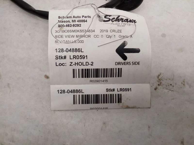 Store Home About Us Customer Resources Feedback Contact Us Driver Left Side View Mirror 39125813 Fits 16-19 Cruze 2901415 Free Shipping - 90 Day Warranty - Est. 1923 Description Elevate Your Vehicle's Look and Safety: Quality Exterior Mirror Schram Auto and Truck Parts - Exterior Mirror At Schram Auto and Truck Parts, Inc., a trusted name since 1923, we're dedicated to providing reliable automotive solutions. Our Exterior Mirror does more than reflect—it enhances both your vehicle's appearance and safety. With decades of experience in the automotive recycling industry, we offer you top-tier original equipment components, meticulously inspected and tested to ensure perfect functionality. Rest assured that all our mirrors are meticulously inspected and tested, guaranteeing they're in perfect working condition. While some scuffs, scratches, and rock chips from normal use may be present, they reflect the mirror's history and reliability. Please note that color matching isn't guaranteed. To ensure a seamless match, assume that this mirror may need to be repainted to directly match your vehicle's color. Fitment Matters For precise compatibility, please consult the 'Fitment Guide' section of this listing. We recommend confirming that this is the correct mirror for your vehicle before making a purchase. While we take every measure to provide accurate fitment details, verifying compatibility based on your vehicle's VIN is strongly recommended to avoid any potential misunderstandings. Your Questions Are Valued We're here to support you. If you have any inquiries or uncertainties, feel free to reach out to us through eBay or by giving us a call. Chad, our knowledgeable specialist, is ready to equip you with all the details you need for a confident purchase decision. Enhance your vehicle's look and safety with a reliable Exterior Mirror from Schram Auto and Truck Parts, Inc. Join us in our commitment to responsible automotive solutions while elevating both your vehicle's aesthetics and your driving experience. Your Satisfaction is Our Priority Our team is devoted to ensuring your satisfaction. Don't hesitate to ask us any questions or seek further assistance. Chad and our specialists are here to guide you through the process and provide the insights necessary for a successful purchase. Vehicle 2019 CRUZE Mileage 80000 Part Grade A What's this? Conditions SLV,GAN,LS,OF1, Fitment Guide This item will fit the following vehicles / applications: CRUZE 16 Power; VIN B (4th digit, New Style), w/o turn signal; w/o heated; (power, opt DWV), L. CRUZE 17 Power, w/o turn signal; w/o heated; (power, opt DWV), L. CRUZE 18 w/o turn signal; w/o heated; (power, opt DWV), L. CRUZE 19 (without turn signal), w/o heated; (power, opt DWV), L. R# 2901415 Stk# LR0591 Holl# 128-04886L More Parts for 2019 CRUZE » More Parts from this exact vehicle. » Accessories Brakes and suspension Cooling Systems Electrical and Lighting Engine and Drivetrain Exterior Parts & Sheet Metal Interior Parts Wheels and Tires Customer Service Payments Shipping International Returns FAQs Contact Us Quick Links Store Home About Us Feedback
