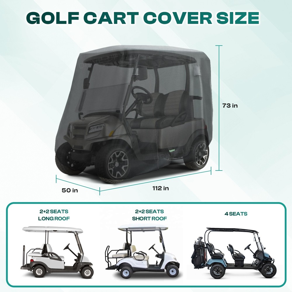 STORE HOME ALL ITEMS ABOUT US FEEDBACK CONTACT US click thumbnails above to enlarge Drive-up Golf Cart Cover 2/4Passengers for Yamaha EZGO Club Car 420D Polyester 【Product Specifications】 Golf cart cover 112'' long x 50'' wide x 73'' high, suitable for 2-4 passenger Yamaha, Club Car, EZGO gas and electric golf carts. And it can be used as EZGO golf cart cover, Club Car golf cart cover and Yamaha golf cart cover 【420D High-Density Polyester Fiber】 2/4 Passenger golf cart cover made of 420D high-density polyester fiber with a maximum tensile strength of up to 20 MPA. High-density polyester material is tear-resistant, more durable and stronger 【Strong Windproof Effect】 Golf cart covers adopt a precise stitching design, which greatly increases the durability of the cover. The annular elastic on the edge and windproof adjustment buckle can better fix it on the golf cart; even in the face of various bad weather, it can also protect your golf cart 【All-Weather Protection】 Drive-up golf cart cover is designed with a waterproof coating and a UV-resistant coating overlay, which can better cope with damage from snow, rain, frost, UV, dust, leaves, etc 【Golf Cart Cover】 Easy to install. A storage bag is included in the package, which is convenient for daily folding and storage. There are 3 waterproof zipper doors on the side for easy access to items. 4 ventilation holes for easy gas circulation, prevent stuffiness, and keep the car dry High quality and durable A new driving experience Upgrade your golf cart Easy to install Delivery Terms of return After-sale Payment Delivery -Our warehouse located in GA, US. -We will process your package within 1-2 business days after your payment. It will take about 2-7 working days to reach to you. -Gentle Reminder: the following addresses are not available for delivery - Alaska, Guam, Hawaii, Puerto Rico. APO/FPO, US Protectorates. Terms of return -Return within 30 days from the purchase date - item must be unused and in original condition (packaging + tag included) -We will offer refund or replacement according to you massage left after received and have the returned item checked. After-sale -Comes with 1 year warranty. -We will always stand behind our products and strive to provide more variety of cart parts and golf accessories. -Please feel free to turn to us for any question regarding installation or the product. Payment -We accept payment through PayPal and all other Ebay approved forms of payment. -Payment must be made within 8 Working days after the auction/bid ends, or eBay will open Unpaid Item case automatically later. -When you have any questions about payment, shipping or product, Please send us an ebay message.Thank you. PRODUCT CATEGORIES Club Car Part YAMAHA Part EZGO Part Universal Part ABOUT DRIVE-UP 2018 Founded in 2018 73+ professional employees 15+ manufacturing years 3000+ factory area 80+ global sales country WHY CHOOSE DRIVE-UP ? Free shipping Free shipping on all domestic (u.s.) deliveries - no more extra charge included Professional service and guidance Provide installation guidance service After-sale Comes with 1 year warranty. USEFUL LINK STORE HOME HOT ITEMS ABOUT US FEEDBACK CONTACT US Copyright © DRIVE-UP. All Rights Reserved. PAYMENT
