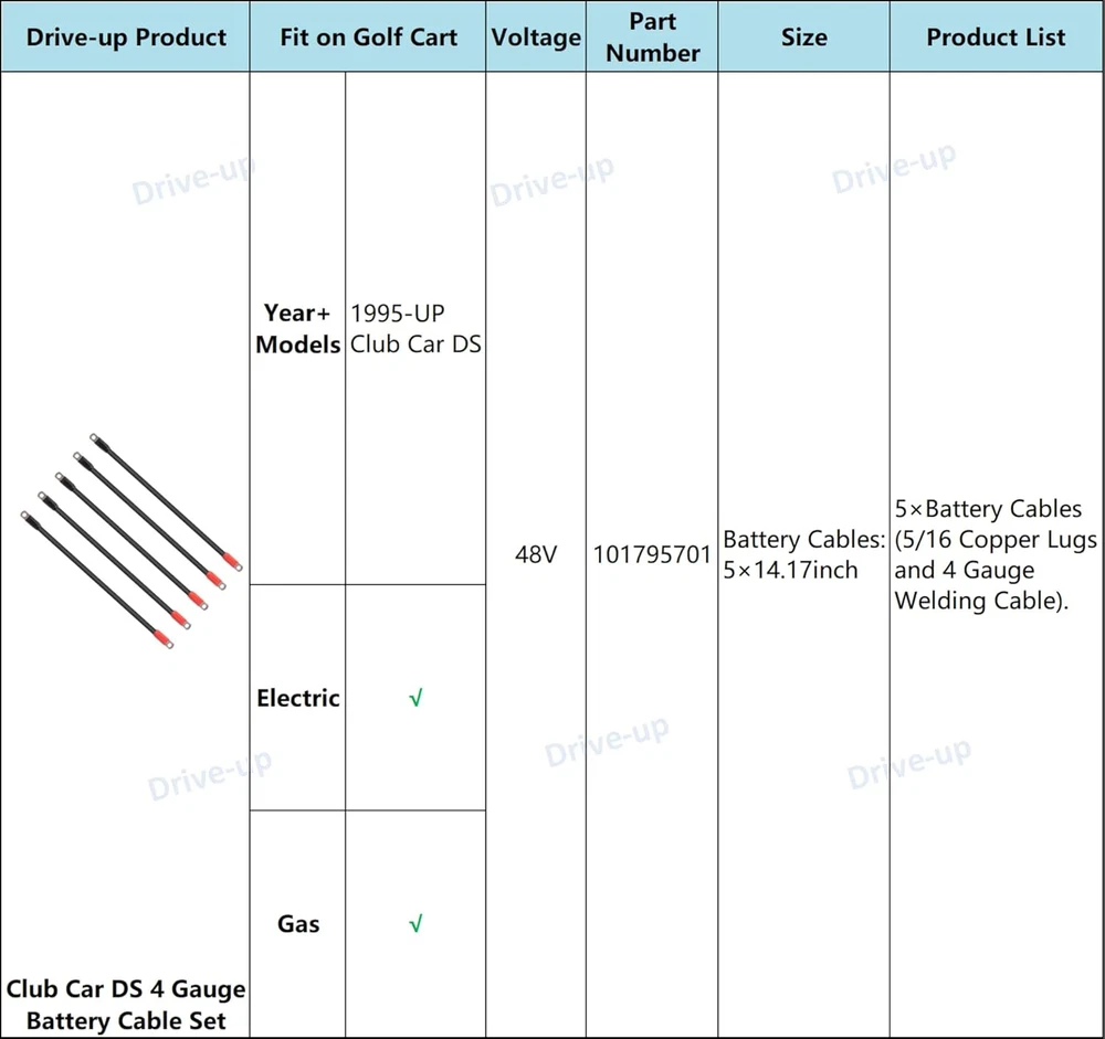 Fast Shipping Great Customer Support Satisfaction Guaranteed DESCRIPTION Shipping Shipping Shipping All domestic packages are shipped for Free (Unless other shipping method was selected during the checkout) Most items ship and arrive much sooner than the estimate delivery date. Usually within 2-3 days from payment. However, we have longer estimates to compensate for the occasional delay or supply chain breakdown. We do not accept P.O. BOXES - PLEASE PROVIDE A PHYSICAL ADDRESS Return Return Return In the event that you would like to return your purchase, we allow returns that are processed within the defined return date (the return date is to be found in the return policy/shipping and handling section) Please contact us for a return authorization and the return shipping address. Payment Payment Payment PayPal is our preferred method of payments it's the quickest, easiest and most secure way to pay for your goods or services online. PayPal offers buyer and seller protection should there be a problem. If you do not have a PayPal account, to get started and buy your first item with us is very easy. Simply click on the 'Buy It Now' button and follow the eBay checkout steps. Select PayPal as the payment method you then will be given the chance to enter your card details in to PayPal's secure checkout in order to pay for your order. Once the payment has been made, you will then be given the opportunity to make your own PayPal account to make paying for your items in the future very easy. Should there be a problem with payment please do let us know. Feedback Feedback Feedback Customer satisfaction is very important to us. If you have any problem with your order,please contact us and we will do our best to make you satisfied, please do not leave a negative feedback before we resolve your problem. We guarantee that your issue will be solved quickly. As long as you are happy with your purchase of , please leave us a positive feedback. Your feedback is very important to us it affects our search placement on eBay. We will leave a positive feedback for you in return automatically once we receive your feedback. Contact Us Contact Us Contact Us If you have any queries, please contact us via ebay. We usually respond within 24 hours on weekdays. Thank you for visiting our ebay store! This Club Car Battery Cables:(5) 14.17inch cables included, 5/16 Copper Lugs and 4 Gauge welding cable.Each club car ds battery cable replacement part number:101795701. Fits the Following Cart(s): 1995-Up Club Car DS (48 Volt) models with (6) 8 Volt batteries Club Car Battery Cables: Double wall heat shrink helps protect the cable ends from corrosion. Battery Cables for Club Car: These 4 gauge cables have better resistance to wear and corrosion over your stock cables. Reliable Support: Easy installation. Drive-up professional support team will always stand behind our products and strive to provide you with a more variety of golf cart accessories. Drive-up Golf Cart Battery Cable Set for Club Car DS 1995-Up 48 Volt 4 Gauge Set Click here to see description Fast Shipping Great Customer Support Satisfaction Guaranteed DESCRIPTION Shipping All domestic packages are shipped for Free (Unless other shipping method was selected during the checkout) We ship within two business days of payment, usually sooner Standard FREE shipping takes between 3-5 business days Expedited shipping takes between 2-3 business days Overnight shipping takes between 1-2 business days We do not accept P.O. BOXES - PLEASE PROVIDE A PHYSICAL ADDRESS We Ship Globally using ebay's GSP, the item is sent to a logistic center in KY and shipped from there to the rest of the world. International customers are responsible for all duties and taxes Contact your local authority for questions related to the amount of duties or taxes you will be responsible for Return In the event that you would like to return your purchase, we allow returns that are processed within the defined return date (the return date is to be found in the return policy/shipping and handling section) Please contact us for a return authorization and the return shipping address. Please contact us for a Return Merchandise Authorization (RMA) number. We advise you to use a reputable carrier service when returning your goods. Please pack all returns appropriately. We ship globally Via eBay's global shipping program (GSP). Thus we don't cover returns for items shipped globally. Buyers returning such items will be refunded ONLY for the item's cost and not for the shipping. please check the Voltage information and make sure it matches the one in your country. In case it's not stated in the description, do ask us. Payment PayPal is our preferred method of payments it's the quickest, easiest and most secure way to pay for your goods or services online. PayPal offers buyer and seller protection should there be a problem. If you do not have a PayPal account, to get started and buy your first item with us is very easy. Simply click on the 'Buy It Now' button and follow the eBay checkout steps. Select PayPal as the payment method you then will be given the chance to enter your card details in to PayPal's secure checkout in order to pay for your order. Once the payment has been made, you will then be given the opportunity to make your own PayPal account to make paying for your items in the future very easy. Should there be a problem with payment please do let us know. Feedback Customer satisfaction is very important to us. If you have any problem with your order,please contact us and we will do our best to make you satisfied, please do not leave a negative feedback before we resolve your problem. We guarantee that your issue will be solved quickly. As long as you are happy with your purchase of , please leave us a positive feedback. Your feedback is very important to us it affects our search placement on eBay. We will leave a positive feedback for you in return automatically once we receive your feedback. Contact 