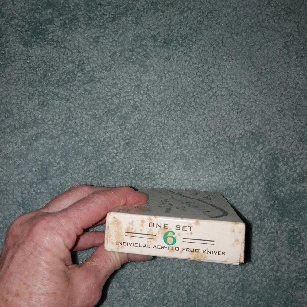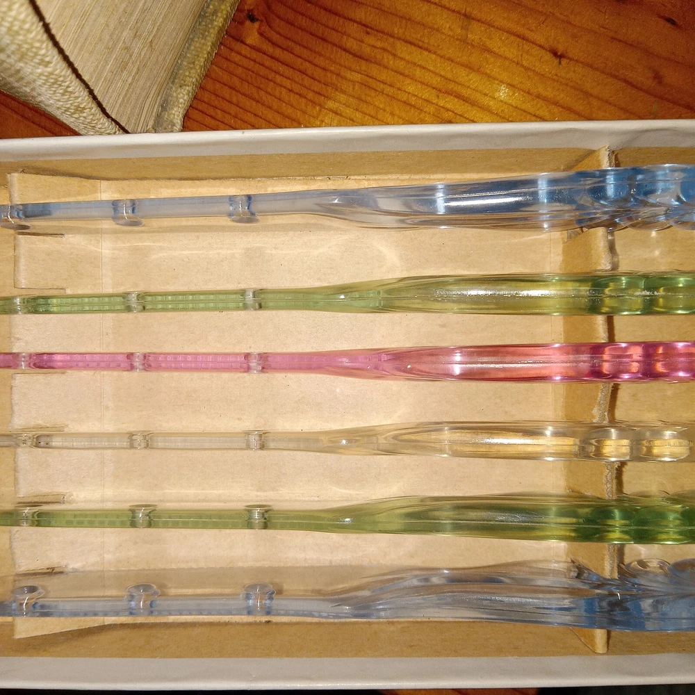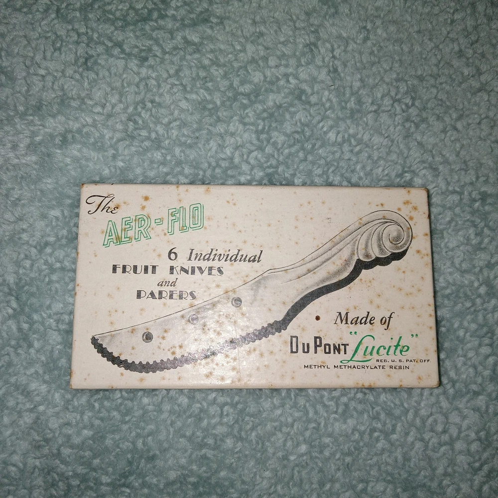 MCM vintage DuPonte "Lucite" AER-FLO, set of 6 pastel colored Fruit or pare knives, or soft cheese, great for Charcuterie, in original box. Box shows signs of age, knives are in great condition; see last photo for edging on 1 green knife.