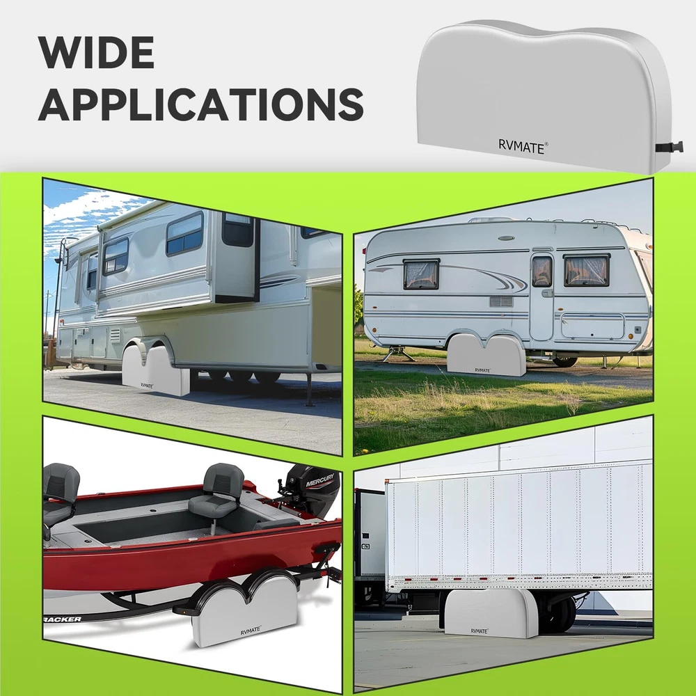 RV Tire Covers, Dual Axle Wheel Cover (2 Pack) Fits 27"-30" Diameter Tires, Waterproof Anti-UV 420D Oxford Silver Dual Tire Covers RV Accessories for RV/Truck/Trailer 【Function】Double wheel tire cover is made of heavy-duty 420D Oxford fabric with silver coating that is waterproof, UV-resistant and provides strong shading. This protects your tires from sunlight, snow, rust and dirt, ensuring they remain in good condition even in harsh weather. 【Size】The covers fit a wide variety of dual-axle wheels ranging from 27" to 30" in diameter, suitable for RV, trailer, truck. Please check the specs of your dual-axle wheel before ordering. 【Easy to Use】It can be easily installed by yourself without any additional tools. Just put the cover on your wheel and fasten the rope. 【Firmly Fit】The fixed rope keeps the cover stable on the tire, preventing it from slipping off. 【What You Get】Double axle tire cover*2, durable 420D oxford storage bag*1. Dual Tire Covers Shipping We offer FREE shipping on all orders! We ship within Three business days of payment, usually sooner. We use a selection of shipping services such as UPS, FedEx, USPS etc. We only ship to the lower 48 states, no APO/FPO addresses or PO Boxes allowed. Local pickups and combined shipping options are not provided at this time. Return You can return a product for up to 30 days from the date you purchased it. Any product you return must be in the same condition you received it and in the original packaging. Please keep the receipt. Payment We accept payment by any of the following methods: PayPal Please pay as soon as possible after winning an auction, as that will allow us to post your item to you sooner! Feedback Customer satisfaction is very important to us. If you have any problem with your order, please contact us and we will do our best to make you satisfied. Contact Us If you have any queries, please contact us via ebay. We usually respond within 24 hours on weekdays. Please visit our eBay store to check out other items for sale! Thank you for shopping at our store.
