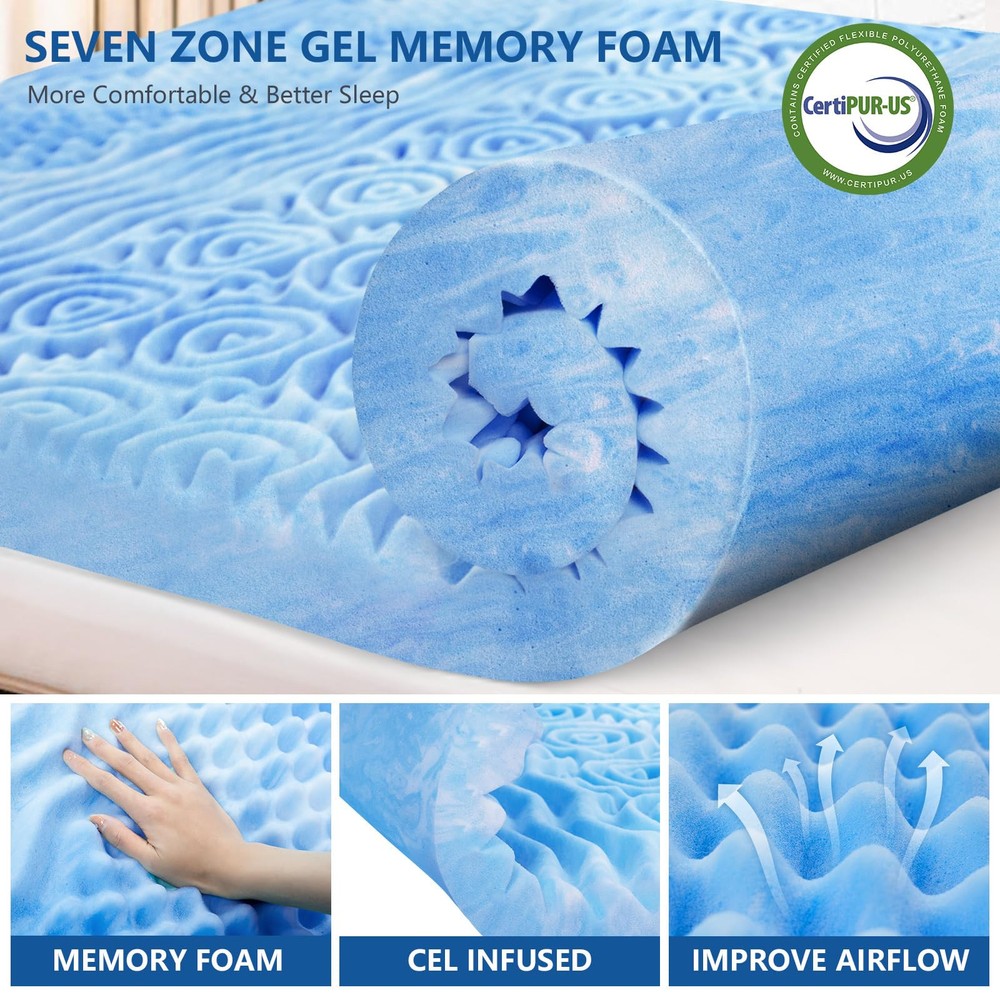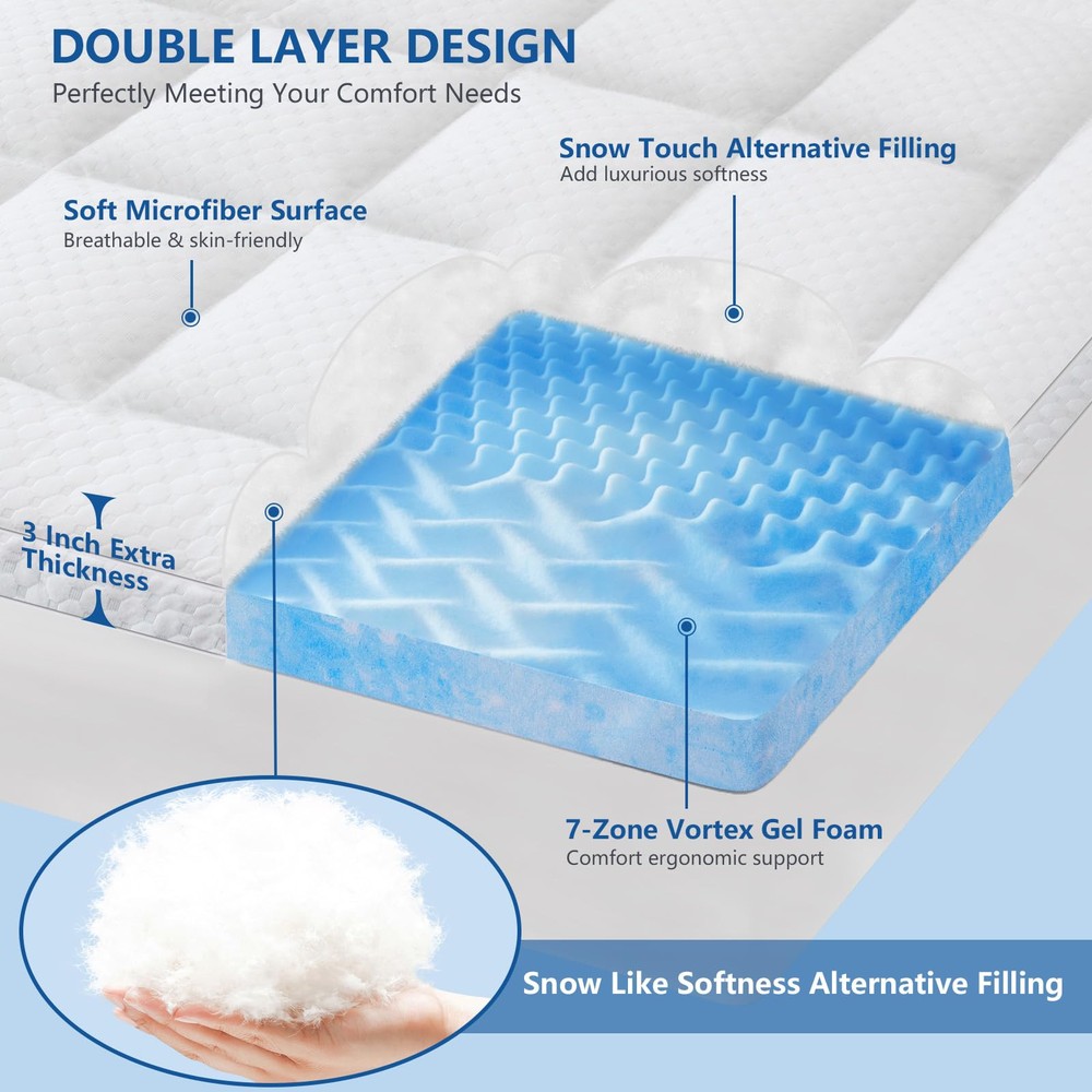 【Upgrade 2 In 1 Dual Layer Design 】memory foam mattress topper is dedicated to bring you the top sleep experience, the perfect fusion of 2 inch vortex gel memory sponge and 1 inch air layer quilted snow pile filled mattress. Double layer design, could provides comfort and stress-relieving support at the same time, then you can get a sleep experience like sleeping in the cloud 【Relieve Pain & Improve Sleep】The memory foam has 7 zones, different zones have different effects, perfectly ergonomic. It will evenly distribute your weight to relieve pressure points, keep your spine naturally aligned and reduce hip, back and neck pain, thus increasing your deep sleep by 30% 【Cooling and Breathability 】The cooling mattress surface is designed with a 3D breathable mesh for superior breathability. This gel-infused foam memory cover carries away heat, creating a cool sleeping surface that can regulate your body temperature throughout the night. Enjoy a peaceful, heat-free night's sleep 【Safe and Skin-Friendly 】The pillow top mattress topper uses ultra-soft 3D+7D snow velvet instead of fiber, which protects the skin of the body. And through the OEKO-TEX STANDARD 100 and CertiPUR US certification, can ensure hypoallergenic and skin-friendly, to give you a safe and comfortable sleeping environment 【Thoughtful Deep Pocket 】We include an 8-21 inch stretchable deep pocket which wraps perfectly around your mattress. You don't have to worry about your mattress shifting even if you roll over during the night.In addition, the pillow top is machine washable with a gentle cycle of cold water and low temperature drying for easy maintenance 【Packaging and Service 】Due to vacuum packaging, it may appear thin after opening the package. Please place it in a well-ventilated place for 24-48 hours to restore its shape and thickness. We will provide 10 years after-sale service. You can contact us directly for a satisfactory solution