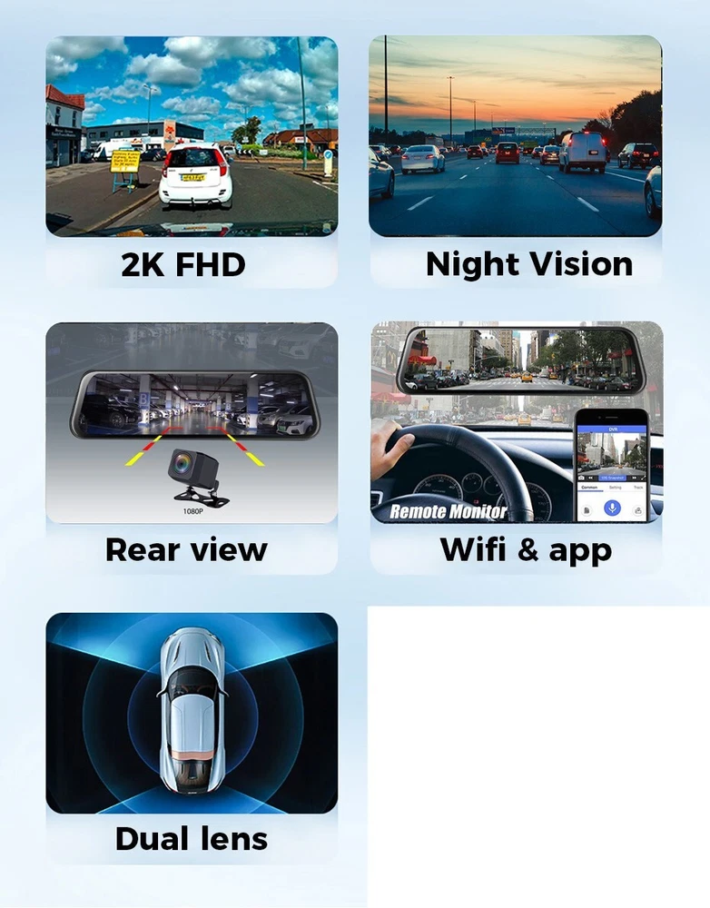 Product Description 10 Inch 2K 1440P Car DVR Mirror Dash Cam Dual Lens Dashcam Full Hd Drive Recorder Stream Dash Car Camera RearView Mirror Add our listing to Watchlist Or Add to Cart , you will get more discount 10in Car Rearview Camera Stream Media DVR Mirror Touch Screen FHD 2K 1080P Dash Cam Recorder DVR Dashcam Specifications Screen Size:10 InchStream Media display Chipset:Original chip FHD recording Super Night Vision Camera Resolution:Front Camera:12MP, 1920*1440P; Back Camera: 8.0MP,1080P Camera View Angle:Front Camera: 170 Degree;Back Camera:140 Degree Camera Aperture:F2.2 Large Aperture(Front Camara) Video Code:AVI OSD Languages:Russian English Japanese Korean Danish French Czech Polish Portuguese Dutch Turkish Thai Chinese(If you want other languages,tell us,we will help you add it) Features:G-Sensor,Digital Zoom,Motion Detection,Cycle Recording,Time&Data Display,With Rearview Mirror 2 Camera Lens:Front And Rear Camera Lens Can Record Simultaneously,support picture in picture display Front Camera Lens:Full 6 Glasses Camera Lens Night Vision Rearview Camera Lens:Give a rear view camera cable (about 6 meters) Recording:automatic records when car power is on, auto power off when car off . Parking Monitor:Support,suggest buy a transformer line for 24 hours Parking control(not inclued ) Features 2K FHD-clear screen 2560*1440P ultra-clear picture, whether it is day or night, you can shoot clear videos without missing every detail Easy installation The body is small and exquisite, easy to install, and does not block the line of sight, just like being integrated with the car Watch the video on the phone You can control the DVR by connected mobile phone via WiFi, like recording video, the file recorded video from the overwriting.taking photo, playback preview,parameter settings, etc. 10 inch Streaming The large screen and waterproof lens make it possible to see the situation behind the car clearly even in heavy rain, ensuring driving safety Package List 1. Recorder 2. Charger 3. Rear camera (including cable) Payment Returns Contact Us Shipping We accept payment by PayPal only ! Payment should be completed within 5 days after buyer places the order,or else an unpaid case will be opened in order to cancel the transaction. If you can not pay in time, please contact us. e-check from PayPal will only be processed once the payment clears. All of the items will be shipped to buyer's EBAY address,please confirm your address on Ebay before you buy.Your order will be usually shipped out the same or next business days once the payment is made and cleared. 30-day Warranty with Exchange for defective, malfunctioned, incorrect or parts-missing items. Please notify us and return the item with all parts and accessories packed and marked "FOR EXCHANGE" within 14 days of receipt. If defective, malfunctioned or parts-missing items are no longer available, a refund may be issued. All returning postage costs will be the responsibility of the buyers under all circumstances. If you encounter any problems about anything, please feel free to contact us and we will do our best to assist you solve the issue. If you are not satisfied in anyway, please feel free to let us know and give us a second chance to correct it before you decide to leave any neutral or negative feedback. Please contact us through eBay link if you have any questions. We will reply you within 24- 48 hours. Please check you spam mail if no response for 48 hours. All items will be checked before packing. All items are new and of high quality. Item will be shipped within 1 business days upon receipt of payment, excluding weekends and public holidays. If to USA,we will ship your order by USPS,it will take about 8-12 working days to you,and you can track it on line. If to other country,we will ship your order by China Post or Singapore Registered Air Mail,it will take about 14-21 working days to you,you aslo can track it on line. Delivery time is about 14-28 business days and it may take up to 8 weeks . Payment We accept payment by PayPal only ! Payment should be completed within 7 days after buyer places the order,or else an unpaid case will be opened in order to cancel the transaction. If you can not pay in time, please contact us. eCHECK from PayPal will only be processed once the payment clears. All of the items will be shipped to buyer's EBAY address,please confirm your address on Ebay before you buy.Your order will be usually shipped out the same or next business days once the payment is made and cleared. Returns 30-day Warranty with Exchange for defective, malfunctioned, incorrect or parts-missing items. Please notify us and return the item with all parts and accessories packed and marked "FOR EXCHANGE" within 14 days of receipt. If defective, malfunctioned or parts-missing items are no longer available, a refund may be issued. All returning postage costs will be the responsibility of the buyers under all circumstances. Contact Us If you encounter any problems about anything, please feel free to contact us and we will do our best to assist you solve the issue. If you are not satisfied in anyway, please feel free to let us know and give us a second chance to correct it before you decide to leave any neutral or negative feedback. Please contact us through eBay link if you have any questions. We will reply you within 24- 48 hours. Please check you spam mail if no response for 48 hours. Shipping All items will be checked before packing. All items are new and of high quality. Item will be shipped within 1 business days upon receipt of payment, excluding weekends and public holidays. If to USA,we will ship your order by USPS,it will take about 7-10 working days to you,and you can track it on line. If to other country,we will ship your order by China Post or Singapore Registered Air Mail,it will take about 14-21 working days to you,you aslo can track it on line. Delivery time is about 14-28 business days and it may take up to 8 weeks . Welcome to