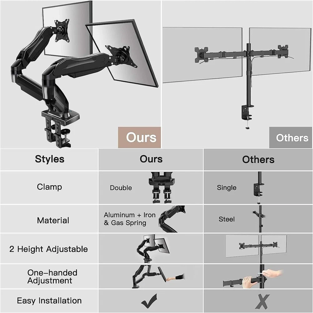 Product Description Dual Monitor Stand - Full Adjustable Monitor Desk Mount Swivel Vesa Bracket with C Clamp, Grommet Mounting Base for 13 to 30 Inch Computer Screens - Each Arm Holds 4.4 to 19.8lbs Fit Your Monitors and Desks- Each arm can fit 13 to 30 inches flat/curved monitors with Vesa pattern 75x75 and 100x100; Each arm holds 4.4lbs to 19.8lbs. About the desk, we recommend wooden desktops and the compatible desk thickness is 0.59"-3.54". Hold Your Monitor in Place - HNDS6 features a unique structural design that offers a more reasonable product structure compared to other hinge brackets, significantly improving stability. It also provides two desktop installation methods: C-clamp or grommet base. Both options ensure stable and secure fixation for your monitor. At , we have always been focused on improving the strength and stability of desktop dual monitor mounts. Optimize Your View and a Wide Range of Motion - No more bother rotating the angle by adjusting the screw! The gas elastic system desk arm makes it adjust with such smooth action. The monitor stand allows your monitor to swivel, tilt and rotate. Go and freely set your monitors to customized angle and position. Comfort Is Fundamental - Our dual monitor arm for desk raises monitors to eye level, improving posture, relieving strain on neck & shoulders while increasing productivity levels.Height adjustable, full motion design lets you work in a more comfortable ergonomic position. Easy to Install - Includes instruction manual and standard mounting hardware for installation. The dual monitor mount is also designed with a cable management function to route wires for a cleaner, more streamlined look. Mounting your monitors can free up an extra 50% of desktop space and reduce clutter. About Us We are a reputable seller with many years of experience selling on eBay. Our goal is to provide high-quality products and excellent customer service. Shipping Items will be shipped within 1-3 business days when we received payment. (Orders are not processed on weekends & holidays) Tracking information will be sent once item is shipped. Delivery time depends on destination and other factors Item is shipped to ebay address. Leaving correct address can minimize delay. For international shipping and shipping to Guam, Hawaii and Alaska, Please contact us before placing the order. International buyers please note: Import duties, taxes and charges are not included in the item price or shipping charges. These charges are buyer’s responsibility. We will try our best to reduce the risk of the custom duties. Local pick-up is unavailable at the moment. Contact Us We reply any email messages within 1 business / working days(off-duty at weekend). If you do not get a response from us, then please check your junk or spam mailbox. Our Business hours: Mon-Fri 9:00-18:00, UTC/GMT +8 hours. Please contact us either by clicking "contact seller" in the "purchase history" section or simply click "ask a question" at the bottom of this page. If you are unsatisfied with our item or service, please contact us before leaving any feedback. We are committed to resolve all issues in a friendly and satisfactory manner.