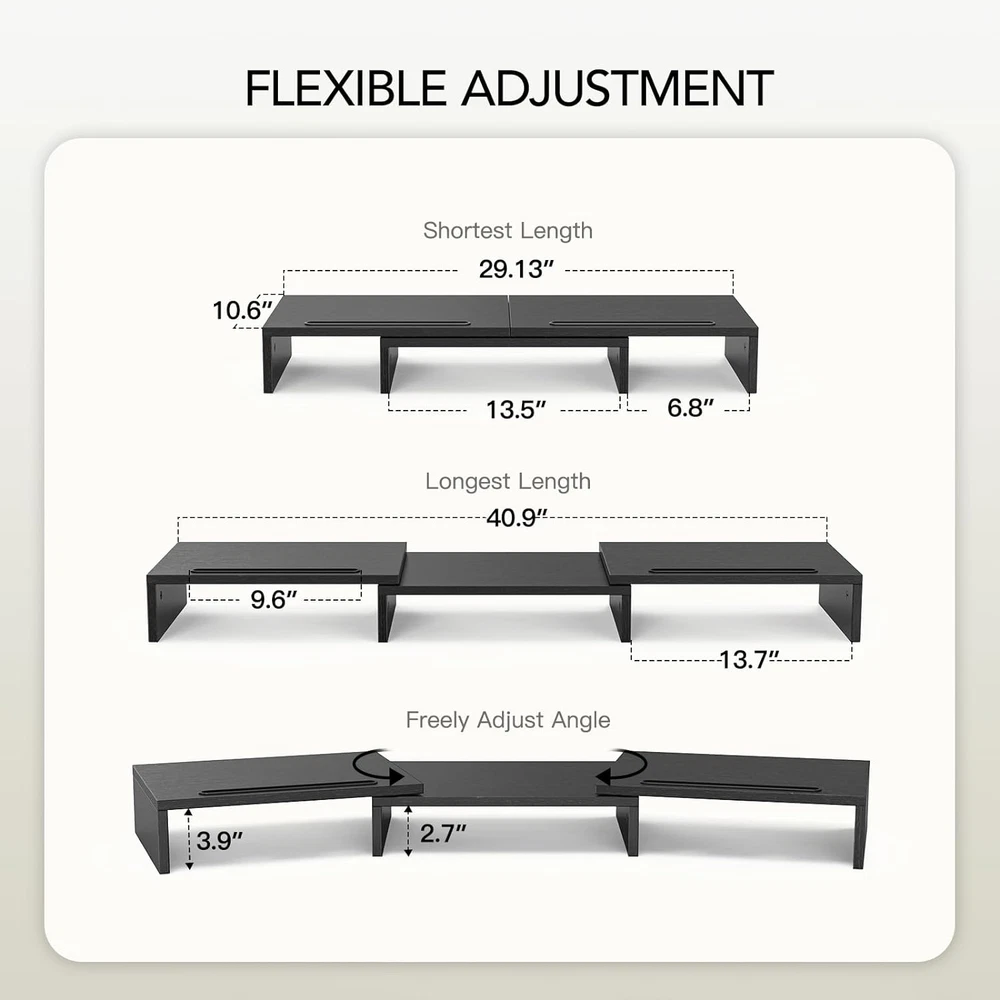 MONITOR STAND RISER FOR 2 MONITORS: This dual monitor stand can accommodate 2 monitors when you need multiple computers to work together. Unique slot design could hold tablet, cell phones and manage cables, pens, clips, and other office supplies. UPGRADED PRODUCT DIMENSION: This monitor stand riser maximum 40.9 inch in length, holds up to 55 lbs, both increased by 15%. This dual monitor riser brings you a more convenient home and office life. ADJUSTABLE LENGTH&ANGLE: Freely adjust the angle as you need. The length can be adjusted from the minimum 29.13 inch to the maximum 40.9 inch. This dual monitor riser could help you to form a comfortable sitting position and gain a better viewing experience. ERGONOMIC DOUBLE MONITOR RISER: Raise your monitor by 3.9", helping you to keep a good sitting posture and prevent the possible stress on neck, back and shoulder during your long time of work. LARGE DESK ORGANIZER: Lift your monitors by the desktop shelf, provides three storage spaces underneath to organize your office supplies and accessories like keyboards, office files, notebook, calculator. This dual monitor stand helps you to get rid of messy desk, and keep your working space tidy. Product Description Does your shoulder and back feel uncomfortable while you're staring at your screen? Are your eyes sore because of the inappropriate angle between the eyes and the monitor? Wanna find a practical tool to organize your desk? This 43" dual monitor stand riser might be helpful for you. AMERIERGO DUAL MONITOR STAND With the longest dimension of 43*10.6*3.5", you could put monitor on stand, with keyboard, mouse underneath, it is a perfect desk organizer for home & office use. And it could provide the comfortable working angles and sitting position 1 Coffee Bar 2 Pet Bowl Stand 3 Makeup Station 1 Easy to assemble 2 Premium MDF 3 Metal Pivot