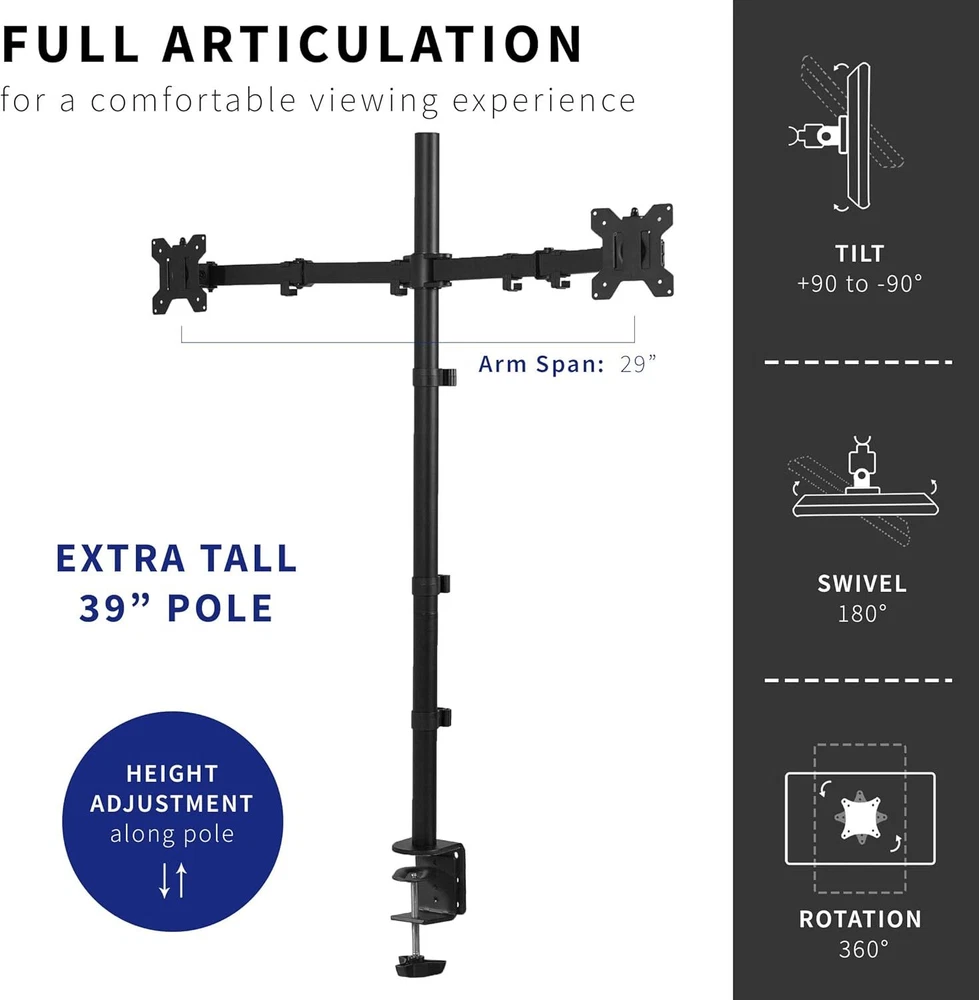 Product Description Dual Monitor Stand Up Desk Mount Extra Tall 39 Inch Pole, Fully Adjustable Stand For Up To 27 Inch Screens, Black, Stand-V012 Fits 13" To 27" Screens - Extra Tall Dual Monitor Mount Fitting Two Screens 13” To 27” In Size And 22 Lbs In Weight Each With 75X75Mm Or 100X100Mm Backside Mounting Holes. Mounts To Desks (Up To 3.5" Thick) With Heavy Duty C-Clamp Or Optional Grommet Mount. Extra Tall Pole - The 39” Center Pole Allows You To Adjust The Monitors Between Sitting And Standing Positions. Integrated Cable Management Is Included To Keep Av And Power Cords Clean And Organized Via Clips Along The Arm And Center Pole. Articulation & Height Adjustment - The Adjustable Mount Offers +90° To -90° Tilt, 180° Swivel, 360° Rotation, And Height Adjustment Along The Center Pole For Optimal Screen Positioning. Monitors Can Be Placed In Portrait Or Landscape Orientation. Easy Installation - Mounting Your Monitors Is A Simple Process With Detachable Vesa Bracket Plates. We Provide A Step-By-Step Manual And The Necessary Hardware For Assembly. We'Ve Got You Covered - Sturdy Steel Design Is Backed With A 3 Year Manufacturer Warranty And Friendly Tech Support To Help With Any Questions Or Concerns. About Us We are a reputable seller with many years of experience selling on eBay. Our goal is to provide high-quality products and excellent customer service. Shipping Items will be shipped within 1-3 business days when we received payment. (Orders are not processed on weekends & holidays) Tracking information will be sent once item is shipped. Delivery time depends on destination and other factors Item is shipped to ebay address. Leaving correct address can minimize delay. For international shipping and shipping to Guam, Hawaii and Alaska, Please contact us before placing the order. International buyers please note: Import duties, taxes and charges are not included in the item price or shipping charges. These charges are buyer’s responsibility. We will try our best to reduce the risk of the custom duties. Local pick-up is unavailable at the moment. Contact Us We reply any email messages within 1 business / working days(off-duty at weekend). If you do not get a response from us, then please check your junk or spam mailbox. Our Business hours: Mon-Fri 9:00-18:00, UTC/GMT +8 hours. Please contact us either by clicking "contact seller" in the "purchase history" section or simply click "ask a question" at the bottom of this page. If you are unsatisfied with our item or service, please contact us before leaving any feedback. We are committed to resolve all issues in a friendly and satisfactory manner.