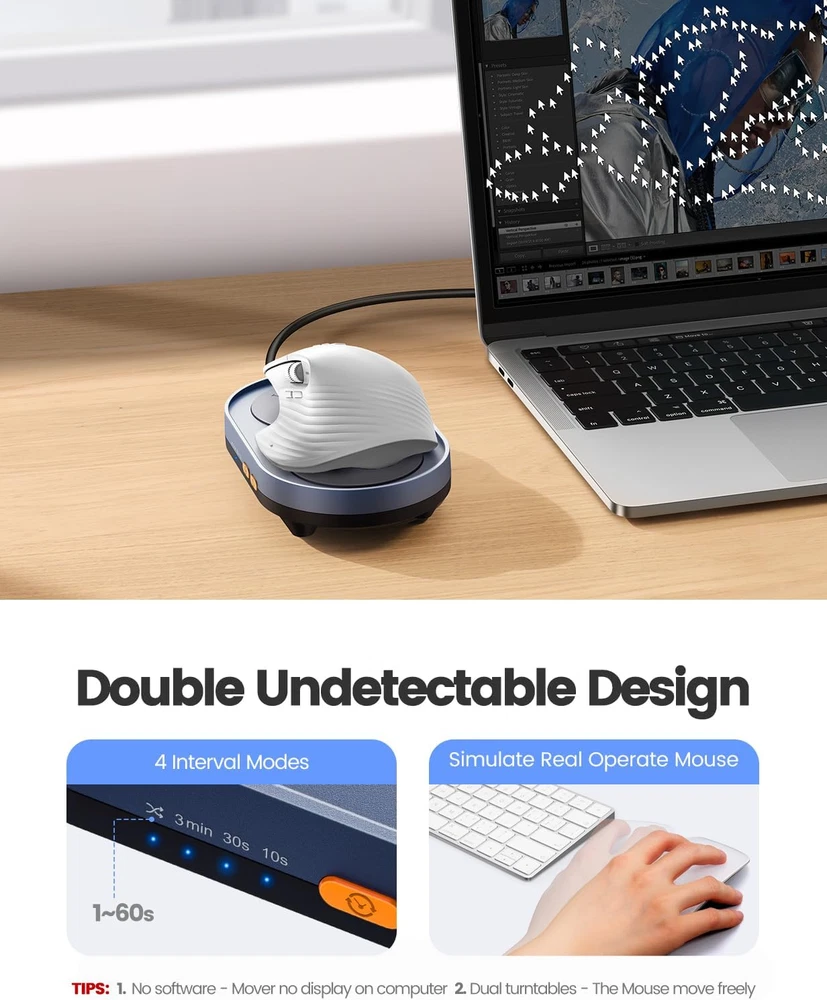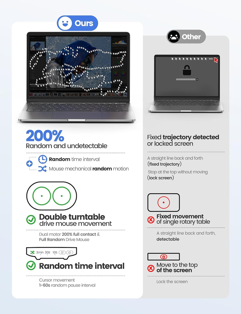 Store New Arrivals Add to Favorite View Feedback Contact Dual Turntable Mouse Jiggler Silent Mechanical Movement with Random Function Description Color Black Product Dimensions 5.91 x 3.56 x 0.1 inches Country of Origin China Item Weight 5.4 ounces Connectivity Technology USB Movement Detection Technology Optical Special Feature Dual Turntables Mover, Random Rotation, No need to align cursor Brand STARVIKY Manufacturer Starviky 【Twin Mover】The dual turntable undetectable mouse jiggler uses a Mix-physical design. When using It, the dual turntables run together at the best speed, which ensures the mouse fits on it completely at 360 degrees, so as to simulate mouse movement. Due to the different friction forces at different positions, a more realistic moving trajectory is generated. It uses more comprehensive physical contact with the mouse to drive the mouse to move more randomly, different from others. 【Trajectory Random 】Dual turntable mouse mover Make it happens - Both turntables rotate in the same direction at the same time. Follow the physical principle - when the direction and action of the force are the same, the greater the force is, the more significant the effect of the force is. The turntables will also change direction after each turn. Ensure the mouse moves completely free and with random movement. It is easy to operate without aiming at the cursor. 【Timer Adjustable】Twin turntables mechanical mouse mover has both a switch button ON/OFF and a button to adjust the interval time.No needed software, Plug in the power supply and press the ON/OFF button to start. To adjust the rotation interval, please press the interval button on the side, there are 4 modes that can be selected, namely 10S, the 30S, 3min and 1-60S random. 【Tranquil & 100% Undetectable】The dual turntable undetectable mouse jiggler adopts the principle of pure physics to automatically simulate the process when using a mouse. Because of the twin turntables, it makes a fully random trajectory. Quiet and noiseless during use,100% undetectable mouse mover device! 【Tremendous Compatible】The dual turntable undetectable mouse jiggler pad is applied to wireless mice and wired mice, almost all optical mice. With edge protection, there is no need to worry about the mouse dropping, giving you a new and good experience. Product Description What is the biggest difference and advantage between it and other mouse movers? The dual random mechanism is undetectable. 1. Movement - The raised design of the dual turntable ensures free random movement of the mouse. 2. Random interval option - The 1-60s random interval option ensures randomness in the movement time. This mouse jiggler has 2 turntables, how does it work? Its difference lies in this. Two raised turntable designs ensure 100% contact with the mouse. Then adjust the interval you are used to (4 interval modes). The mouse undergoes intermittent random movements as if you are operating the mouse. What is the difference between the 4 interval modes? There are 10s, 30s, 3min, and 1-60s random interval modes. The mouse jiggler will run for approximately 20 seconds and stop for the interval time you set. And then repeat Rotation and Interval. How long is the validity to contact for service? STARVIKY is responsible for the quality of products. If you have any questions, you can contact the service by email at any time for handling. No matter how long the product is purchased, we will care. The video showcases the product in use. The video guides you through product setup. The video compares multiple products. The video shows the product being unpacked. 1 X-Large 2 Turntables Raised 3 Ultra Quiet 4 Dual Buttons STARVIKY Mouse Jiggler Mover X-Large Size Larger size & Suitable for more mice of different sizes, especially those large. Ultra-Slim Size Slim Design & Fashionable and beautiful. Metal Mini Size Sturdy metal structure & Mini and easy to carry. Double Turntables Movement Random motion and the mouse is placed in any area without aligning the cursor. 100% Undetectable Pure physical drive mouse rotation, USB is only used to provide power. ON/OFF and Modes Switch Button Short press to switch modes, and long press to turn on and off. ABOUT US We offer the best prices around on high quality products. Our E-store includes media such as books, movies, music and games while offering electronics, toys, sporting apparel, clothing, tools, general home, garden items and more. SHIPPING We are always working hard to ensure your package arrives as soon as possible. Please understand that some factors like weather, high postal traffic, and the performance of shipping companies are outside of our control. We offer free shipping to the lower 48 states and ship within 2 business days of payment, usually sooner. We do not accept P.O. Boxes. Please provide a physical address. RETURNS We offer a 30-Day Return Policy on items which you are not completely satisfied with. You have the option for a full-refund or an exchange of the item. No returns are available on items shipped outside of the USA. PAYMENT We accept PayPal. CONTACT US This page content is yet to come Please ad us to your favorite seller and visit again later Thank You CUSTOMER SATISFACTION We try our very best to make sure every customer is completely satisfied. If there's a problem, message us! We're happy to help.
