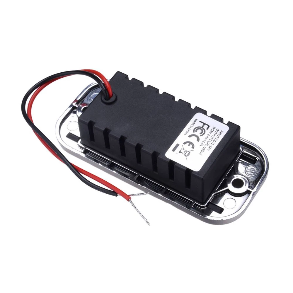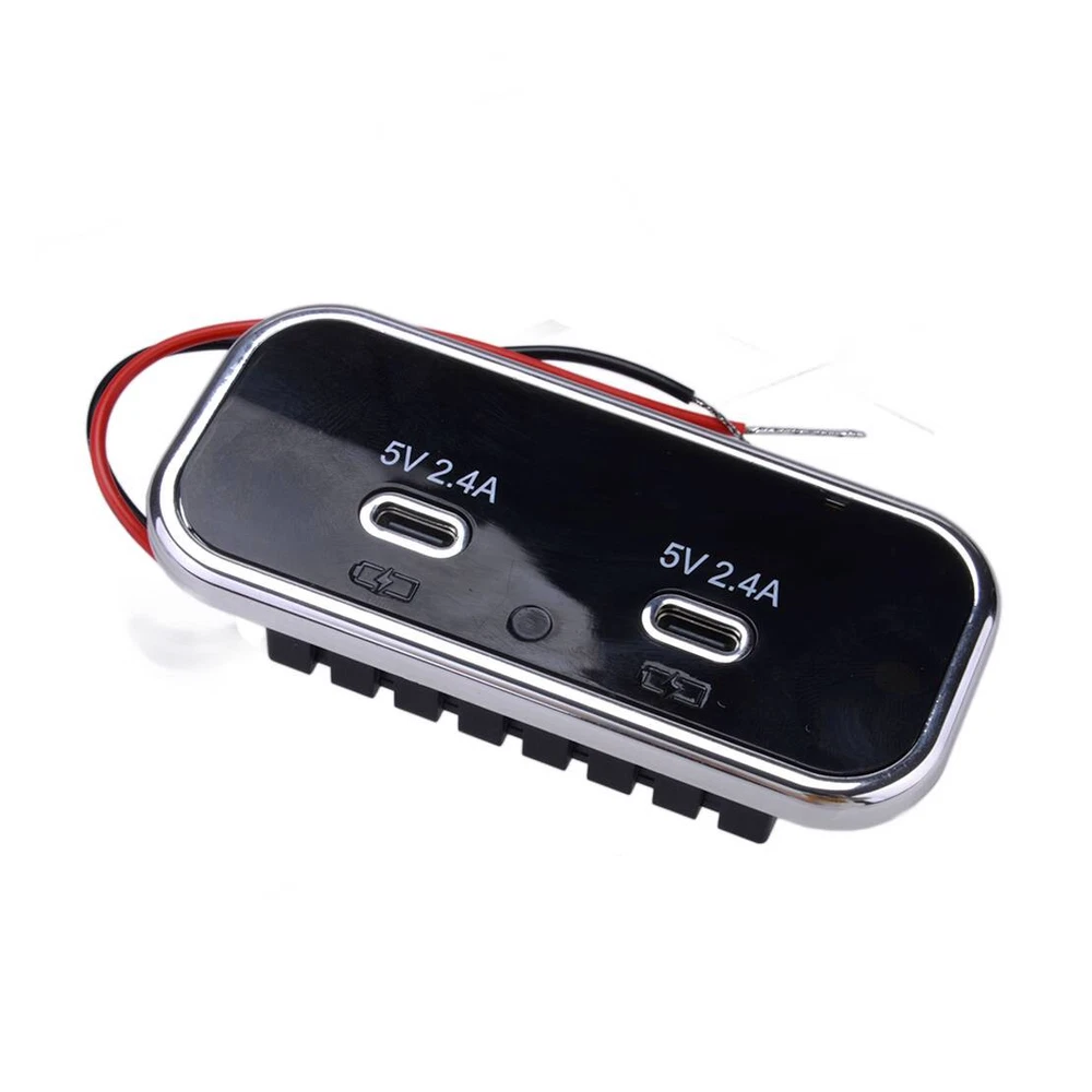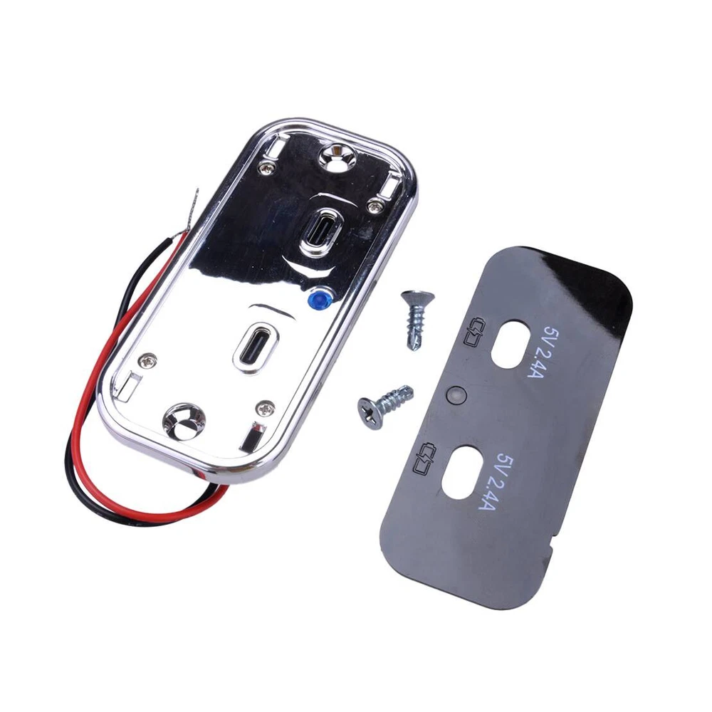 Chrome Caravan RV 12V 24V Dual USB Ports Type C Fast Charger Socket Power Outlet Panel Condition: 100% new Color: Chrome & Black Material: Metal & Plastic Size: approx. 9x4.2x2.2 cm(3.54x1.65x0.87 inch) (LxWxH) Input Voltage: DC 12V-24V Output: 2.4A+2.4A Item included: 1 x Car Fast Charge Socket 2 x Screws Compatible With: fit for most 12V/24V Vehicles, Cars, Motorcycles, Boats, RV, etc This Is Aftermarket Replacement Item But Not Genuine Note: 1) All dimensions are measured by hand, there may be small deviations. 2) Color may vary slightly due to the color setting of each individual monitor. Product Dimension: Feature: 1) 100% new with good quality. 2) No Need to Drill Large Holes + Dustproof, Nylon housing has effective scratch resistance and this product also design has Dustproof cap, this cap effectively protects the charger against sudden water splashes and dustproof. 3) Simply installation. It's surface mount installation. The device can be installed on a flat sur-face. 4) Universally suitable for most 12V/24V Vehicles, Cars, Motorcycles, Boats, RV. Input: 12V-24V/2.4A+2.4A