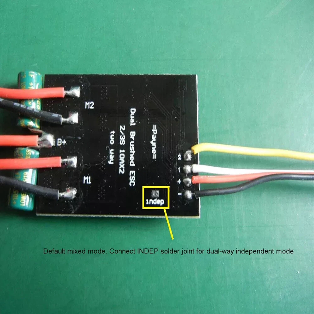 Product Detail: Note:If you have any questions, please contact us before open any case, we promise will solve the problem for you. Thanks! Description: l The midpoint of the remote controller is fixed at PWM 1500us (+50 -50), and the run is automatically adjusted from 900-1100 and 1900-2100. l Start with the midpoint, (one beep at power-on, and two beeps at midpoint 1500, ESC will start)) l With out-of-control protection (lost signal (in the accident, the signal line was disconnected)), for safety and motor protection, you need to return the throttle to the center and unlock again l With power-down protection: power supply voltage is lower than 4V, ESC restart protection (such as: high current discharge, poor performance battery voltage drop is too large, ESC protection, motor stops after protection, and battery voltage recovers after motor stops back to the midpoint, you hear the motor unlock again) l BEC output max 1.5 to meet your needs for receiving and steering gear power supply Note: The onboard MCU is also powered by 5V (connected with BEC), if you plug the 2S lithium battery (7.4V) directly into the receiver, the MCU will burn in seconds (maximum withstand voltage 6.5V) l With overheating protection (overheating 90 degrees, the ESC stops output, and recovers after cooling down) Key Points of Mixed Control Debugging: l First make sure the forward and backward motors are in the same direction. (If a motor is turning incorrectly, exchange the +-stage wires behind the motor) l Then adjust the direction, if it is not as expected, the remote control may be reversed, set it back The Dual-mix ESC Has the Following Modes: l Mixed control mode (both throttle / steering mode): 2 or 3 channels (2 channels are recommended because 2 channels automatically return to center) to control the throttle, 1 channel (or 4 channels) to control speed difference steering, throttle ratio 100%, steering ratio 100%, steering priority. Suitable for: tank (in this mode, gun control can play tanks), 4-wheel drive trolley (apm can be installed) l Two-way independent: it is equivalent to two independent ESCs (if you want to simulate a real tank, the white three wires on the input end are connected to the receiver throttle (3 channels), and the yellow single wire is connected to the receiver 2 channels) l Two-way synchronization: In mixed control mode, do not connect a single yellow wire, so that the two-way motor output is consistent Specification: l Voltage: 6-14V l Current: Single Way 18A, Dual Way 18Ax2 l Board size: Approx. 40x31mm (Include Capacitance: 46x31mm) l Weight: About 18g (Including Wire) l Applicable Motor: Suitable for 130 180 370 Motor Package: l 1x Brushed ESC Note: 1. Please allow minor deviation due to manual measurement. 2. Due to the difference between different monitors, the picture may not reflect the actual color of the item. 3. Communication is the best way to solve the problem. If you have any problems after purchasing, please contact us in time, before opening return or case. Payment: We accept PayPal ONLY currently. Payment must be made within 3 business days. Shipping: 1. Item will be shipped within 1-5 business days from CN Stock or US Stock according to the item location. 2. Sometimes the ship date will be delayed due to a shortage. We will inform you via message. 3. Please leave available address and phone # in delivery information. Seller are not responsible for wrong address. 4. Please indicate your personal requirement such as colors, packages, value of declaration etc. at PayPal's message when make payment. 5. We will NOT responsible for any delay during delivery including but not limited to customs postage checking, strike, force measure etc. Customs Declaration: Import duties, taxes and charges are not included in the item price or shipping charges. These charges are the buyer’s responsibility. Please check with your country’s customs office to determine what these additional costs will be prior to biddingying. Return & Refund: Returns are accepted within 30 days. Please read the item description and check the pictures carefully before bidding. Return or refund is available only if item DOA or there's error in item description causing the item not fitting your need. In such cases, seller pays for all related shipping cost if any. Returns are also acceptable if buyer purchased this by mistake and item still in good condition for reselling. Buyer is responsible for all related shipping cost. Feedback: As long as you are happy with your purchase, please kindly leave us for it is very important for our store performance. If there is any problem with your order, please contact us and give us a chance to resolve your problem Before leaving us a negative feedback.