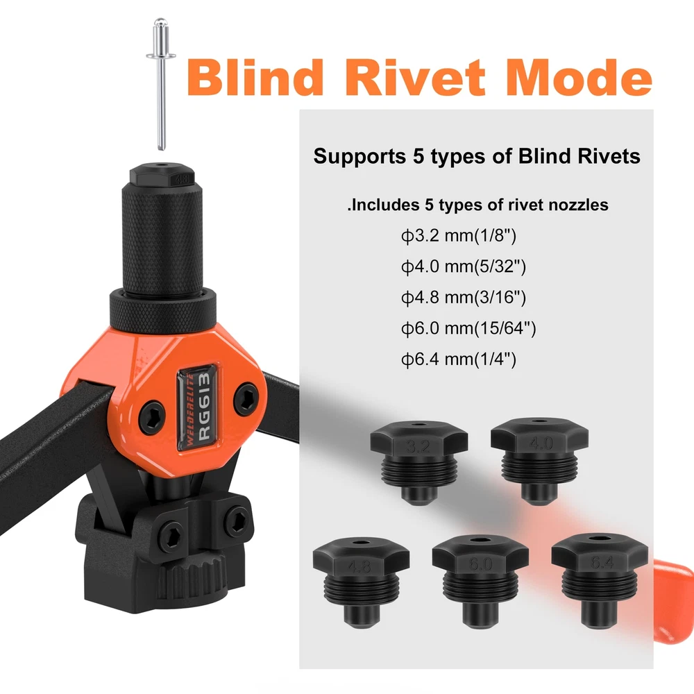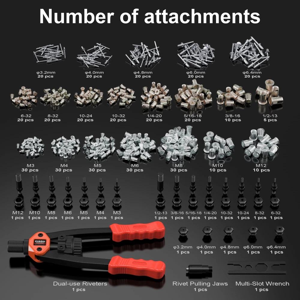 📦Dual-purpose rivet gun for riveting nails and nuts, with a length of 14 inches. 📦Includes 7 types of mandrels for rivet nuts (Metric sizes: M3, M4, M5, M6, M8, M10, M12). 📦Includes 8 types of mandrels for rivet nuts (Imperial sizes: 6-32, 8-32, 10-32, 10-24, 1/4-20, 5/16-18, 3/8-16, 1/2-13). 📦Includes 5 types of blind rivet nozzles for pulling rivets [ φ3.2 mm(1/8") , φ4.0 mm(5/32") , φ4.8 mm(3/16") , φ6.0 mm(15/64") , φ6.4 mm(1/4") ]. 📦Includes 7 types of metric nutserts (M3=30 pcs, M4=30 pcs, M5=30 pcs, M6=30 pcs, M8=30 pcs, M10=10 pcs, M12=10 pcs). 📦Includes 8 types of imperial nutserts (6-32=20 pcs, 8-32=20 pcs, 10-32=20 pcs, 10-24=20 pcs, 1/4-20=20 pcs, 5/16-18=20 pcs, 3/8-16=10 pcs, 1/2-13=5 pcs). 📦Includes 5 types of blind rivets [φ3.2 mm (1/8")=20 pcs, φ4.0 mm (5/32")=20 pcs, φ4.8 mm (3/16")=20 pcs, φ6.0 mm (15/64")=20 pcs, φ6.4 mm (1/4")=20 pcs].