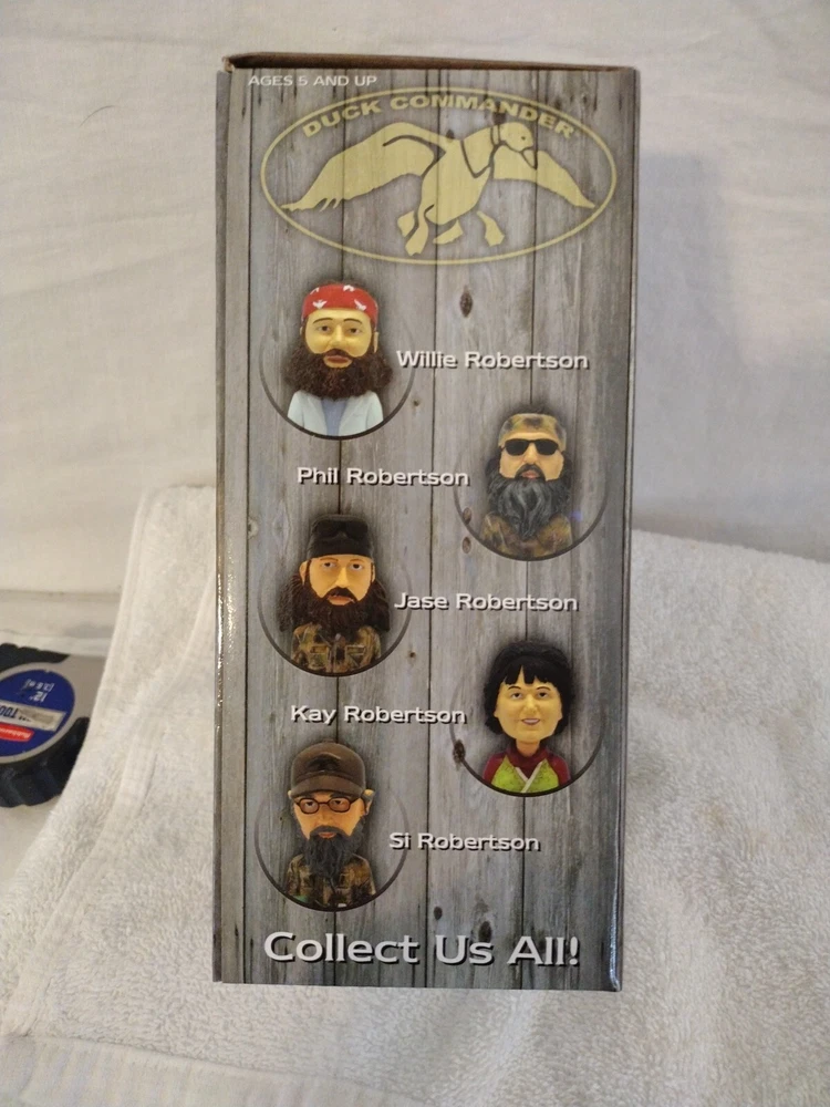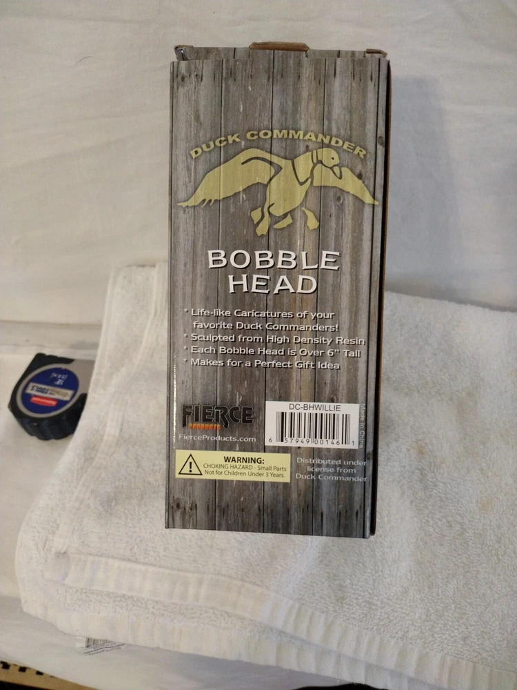 This Duck Commander Willie Robertson Bobble Head in Box is a must-have for any fan of the popular TV show Duck Dynasty. The multicolor resin figurine stands at 6.5 inches tall and features the iconic character Willie Robertson. The item is suitable for ages 3 and up and is part of the Fierce Products franchise. This collectible bobblehead is made in China and is perfect for display or as a gift. The Duck Commander brand is known for its high-quality products, and this item is no exception. Celebrate the fame of Willie Robertson with this unique and charming bobblehead.