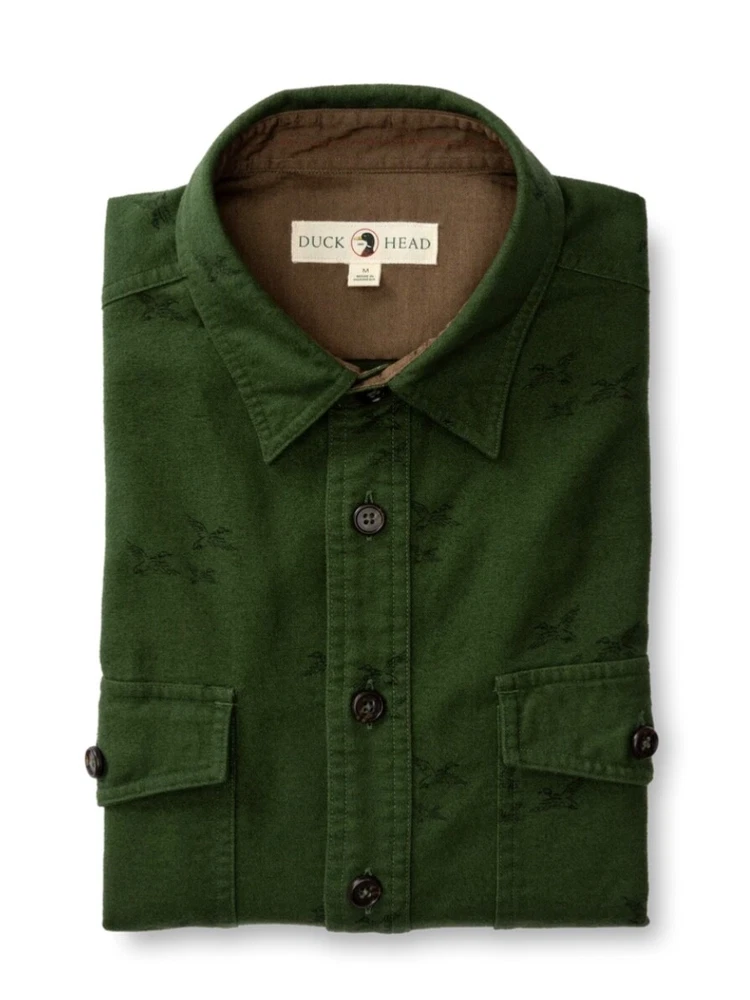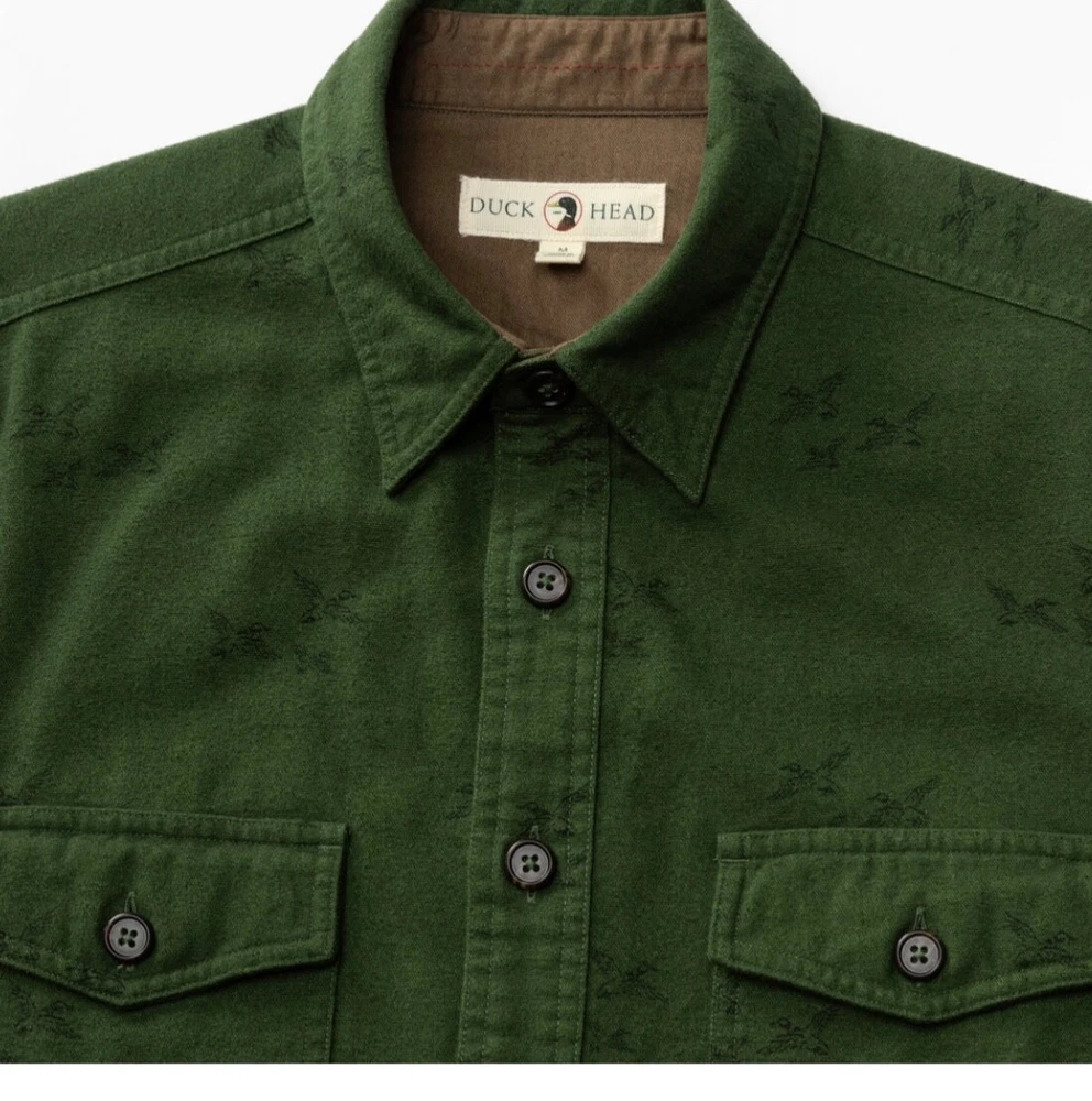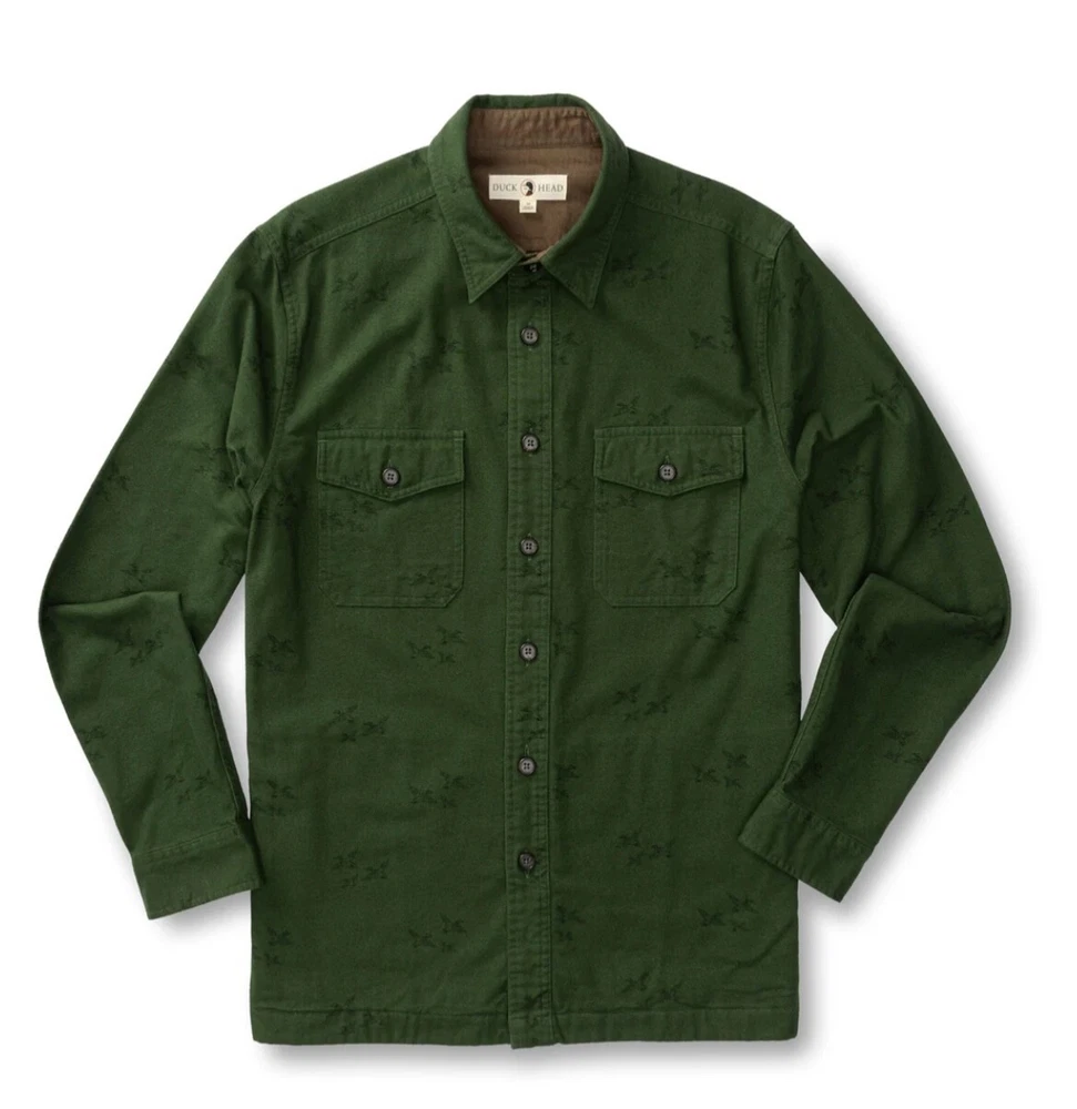Pine Green Print The Slater moleskin shirt epitomizes versatile comfort and rugged style, designed to be worn effortlessly on its own or as a sophisticated layering piece. Crafted from luxurious moleskin fabric, this shirt offers a unique blend of durability and softness. Moleskin fabric is characterized by its dense weave and brushed surface, which not only provides exceptional warmth but also a velvety smooth texture that feels incredibly comfortable against the skin. Ideal for transitioning between seasons or for adding a touch of timeless charm to any outfit, this shirt features a classic button-up design with carefully considered details like side entry pockets and genuine horn buttons Details 100% Cotton 6.8oz Canvas Solid and Printing Colorways Spread Collar Chest Pockets with Button Closure Side Seam Pockets Horn Buttons Contrast Herringbone Interior Collar Stand, Back Yoke, and Top Placket Signature “z” Stitched Interior Top Placket Locker Loop on Back Yoke Placket Label