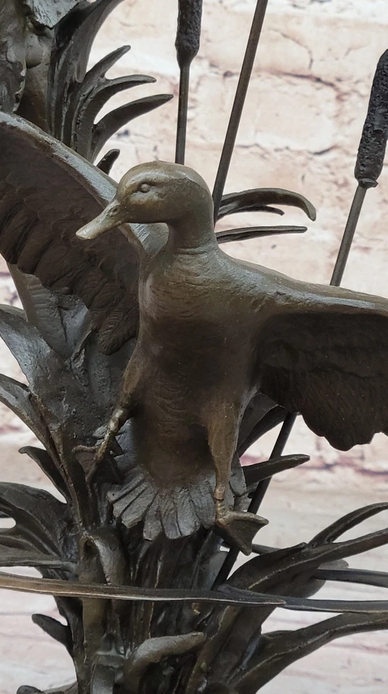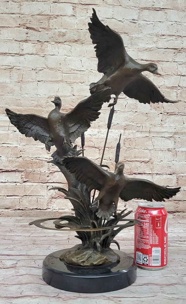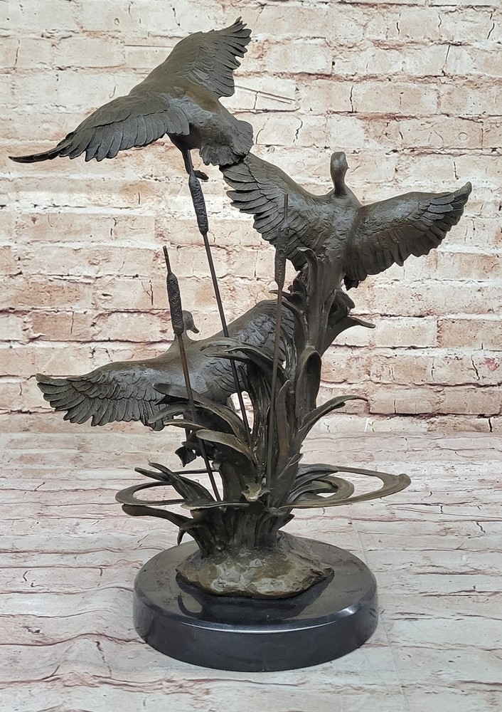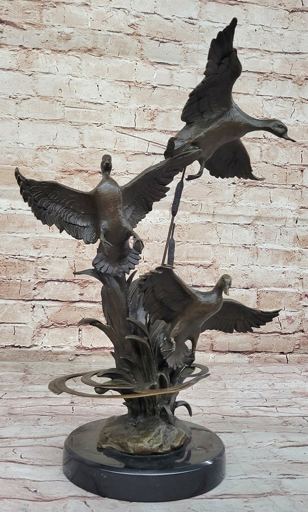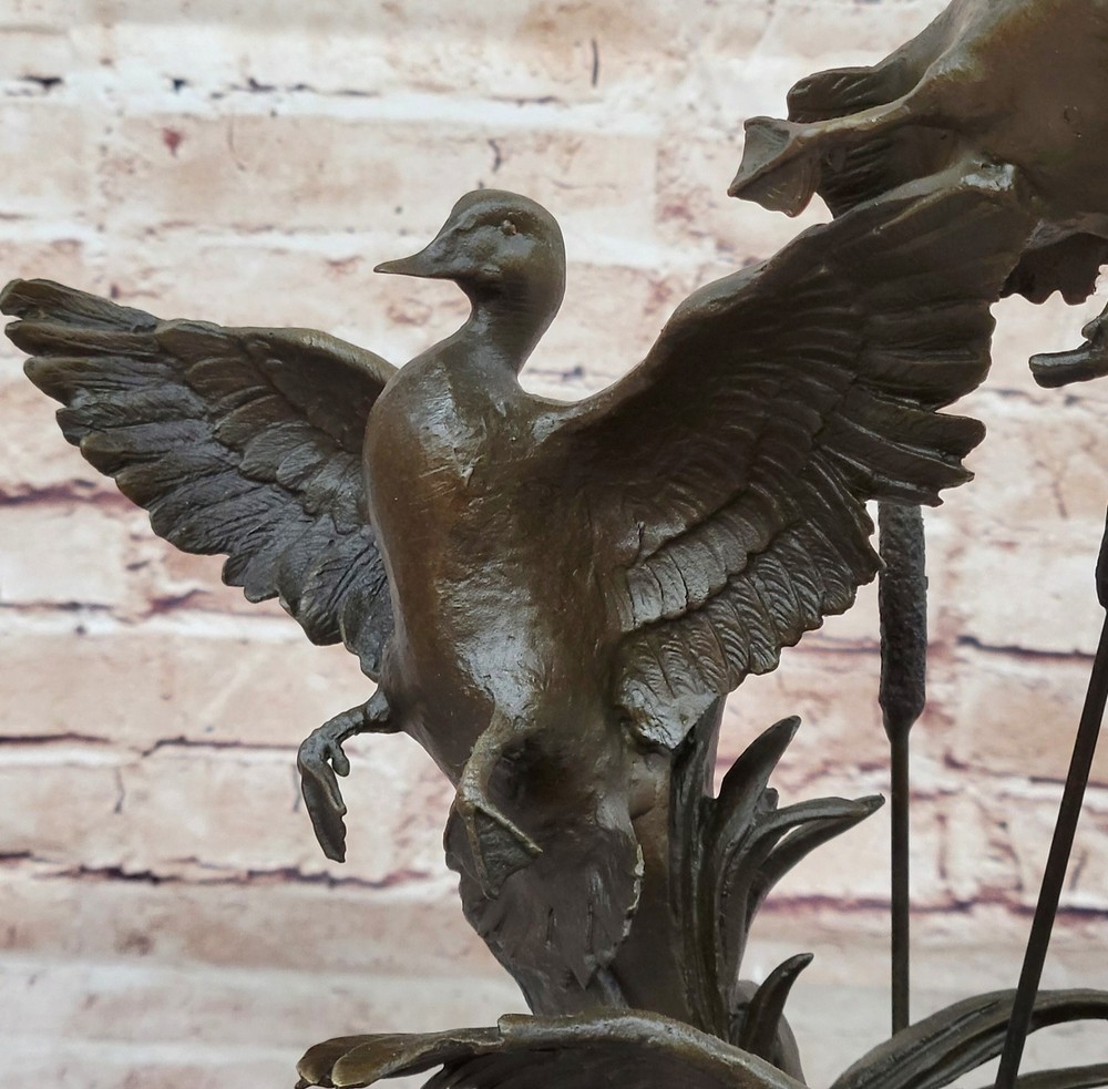 Condition : This sculpture is in perfect condition. Bronze Dimensions with Marble Base: Height 17" X Width 13" Marble Dimensions: Diameter 8" Height without base:12" Weight:15 LBS Inventory:67AL40114176 The bronze sculpture captures the essence of the majestic Ducks, celebrating their captivating mating dances and lifelong partnerships. Ducks hold symbolic significance across cultures, representing harmony, companionship, and the tranquility of nature. This exquisite artwork portrays two Ducks enjoying a peaceful day in the marsh, their feathers shining in the sunlight. One Duck grazes gracefully while the other remains vigilant, symbolizing the eternal bond and watchful care between partners. The sculpture is an ideal gift for nature enthusiasts, fishermen, hunters, or as a heartfelt gesture for couples celebrating their golden anniversary. Its lifelike details and meticulous craftsmanship showcase the beauty and symbolism of these magnificent birds. Crafted using the revered "Lost Wax Method," the sculpture is made from 100% bronze, ensuring durability and timeless elegance. The rich brown patina finish adds warmth and sophistication, accentuating the lifelike features of the Ducks. Mounted on a sleek black marble base and bearing the signature of the talented artist Williams, this sculpture is a testament to artistic excellence and a stunning addition to any space. Embrace the grace and serenity of the Ducks with this remarkable bronze masterpiece. Hot Cast Original by Williams American Artist Ducks Wildlife Bronze Sculpture Video will open in a new window Using the eBay App? Paste link into a browser window: [isdntekvideo]