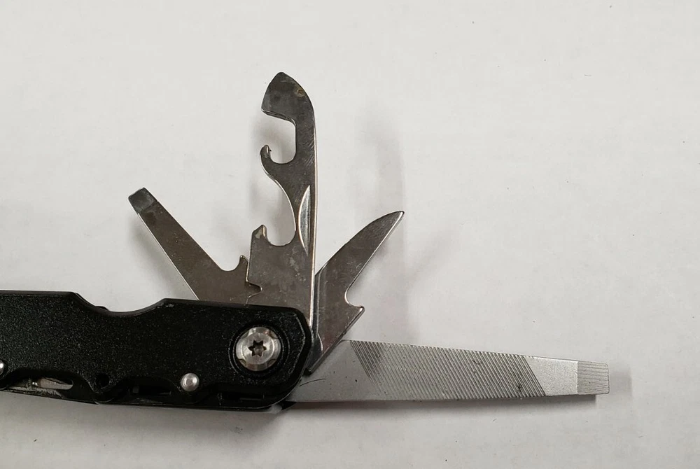 Bottle Opener, Can Opener, Knife, Phillips Screwdriver, Wire Cutter, Wire Stripper, Fish hook remover, Small flathead screwdriver, Large Flathead Screwdriver, Wood-Metal File, Awl, Saw, Traditional Pliers, Needle Nose Pliers