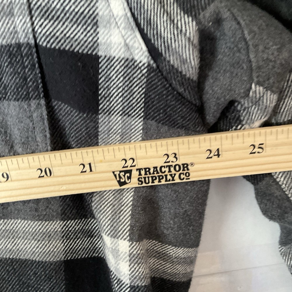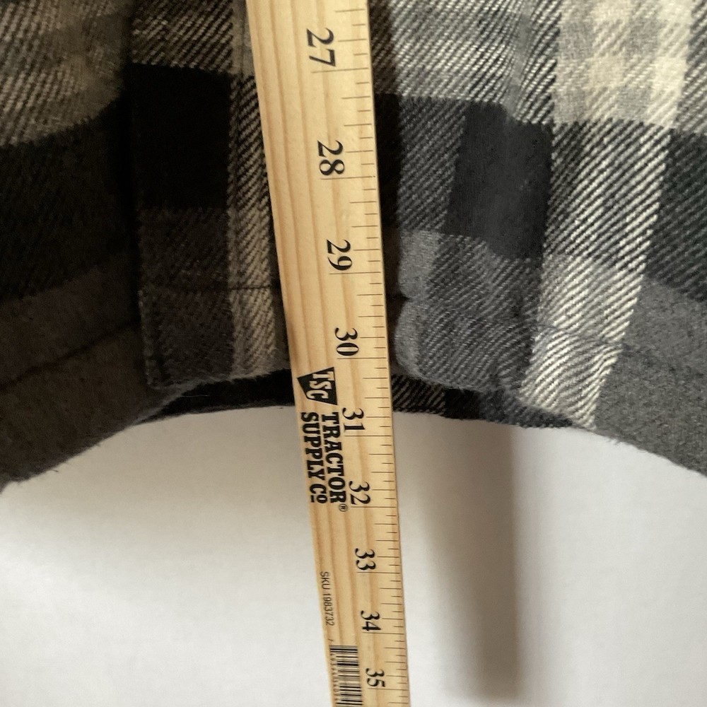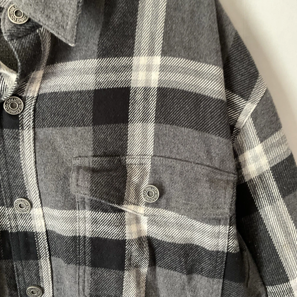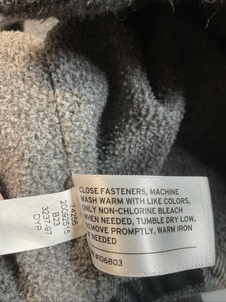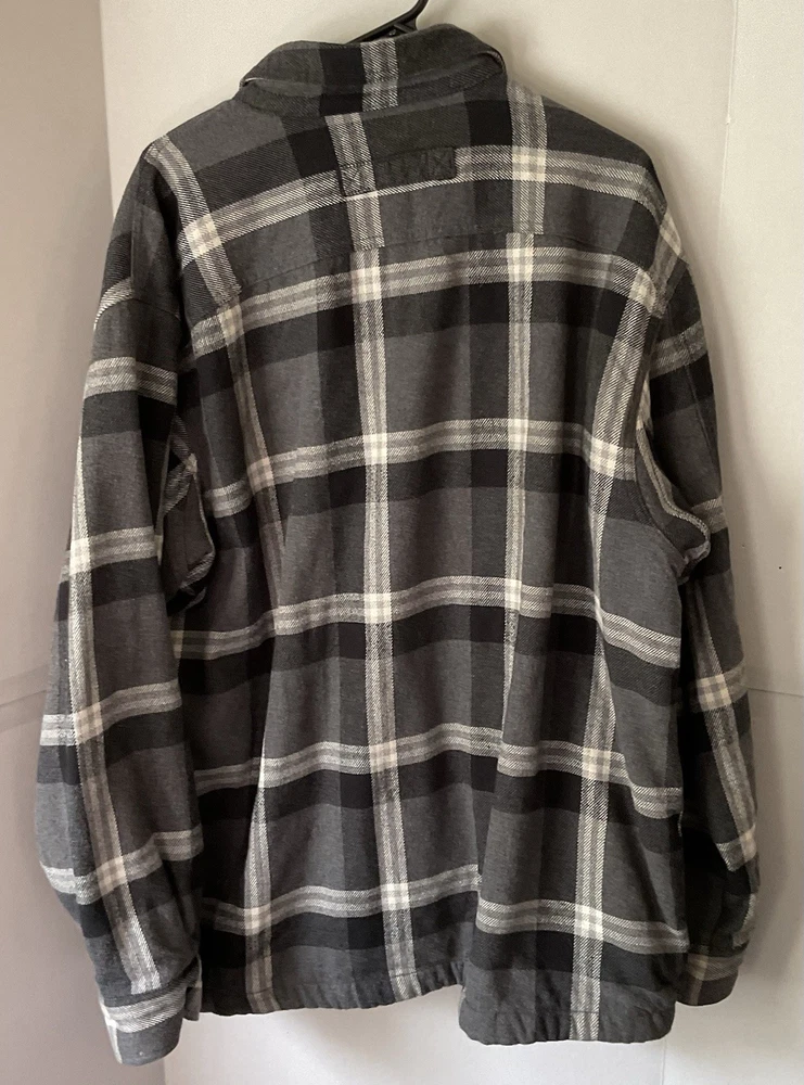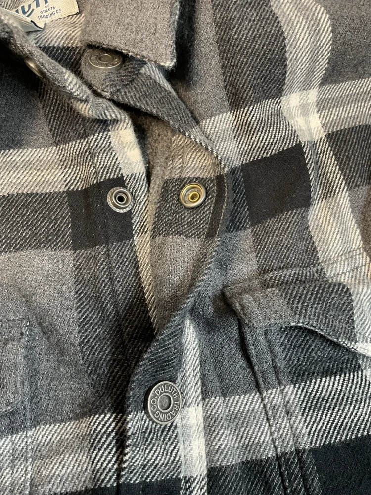 Black and white plaid flannel fleece lined 2 breast pockets 2 jacket pockets snap closure long sleeve naps on cuffs heavy machine wash outdoors good condition