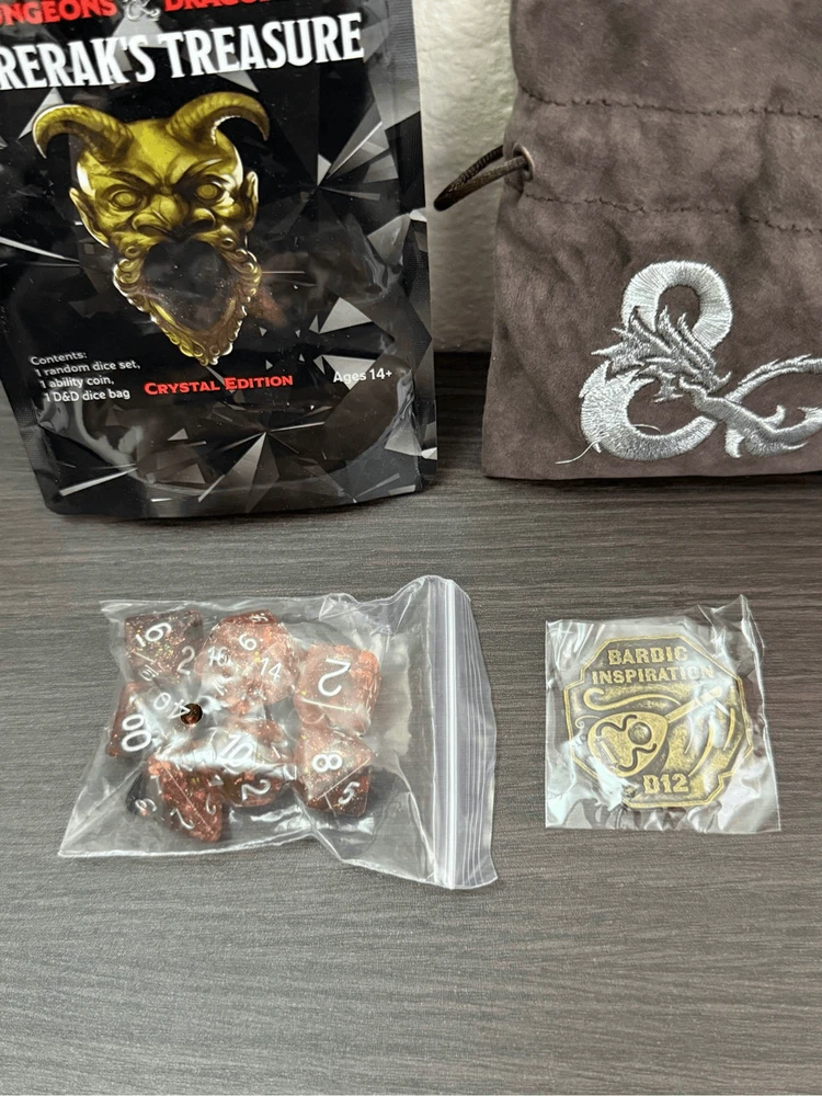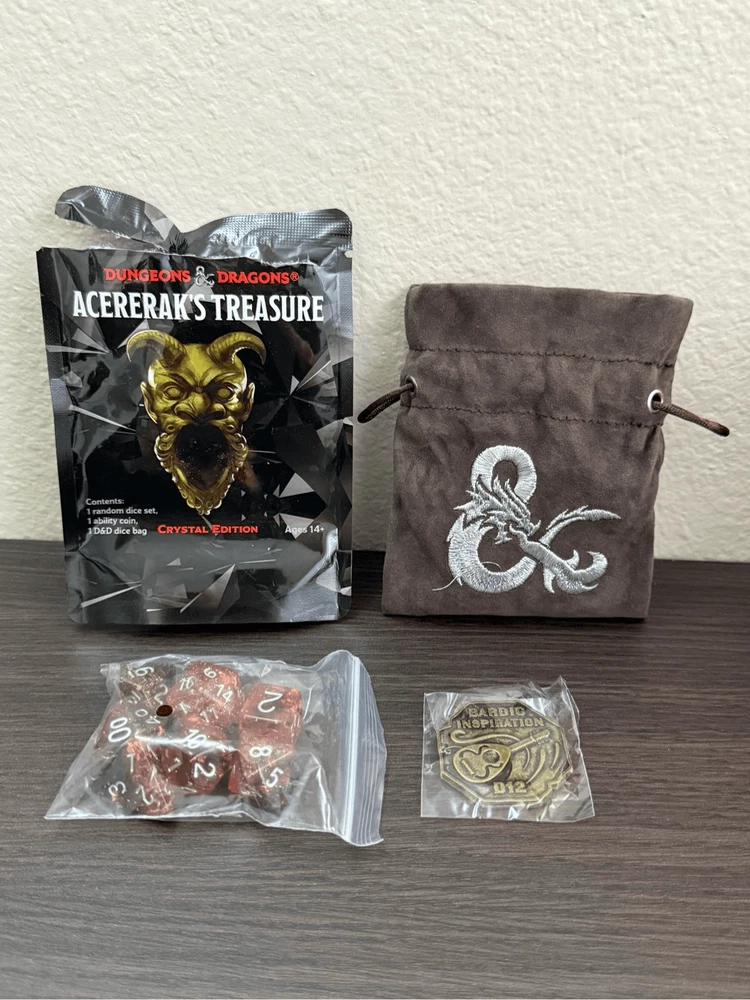 Dungeons & Dragons Acererak's Treasure Crystal Edition Dice Set + Bag + Coin Brand New. Never Used! *Please see pictures for details* Details: 1 dice set 1 dice bag 1 coin I will not responsible for shipment handling or by the carriers. However, I will pack your item with care. :) NO CANCELLATION OR RETURN. ALL SALES ARE FINAL!