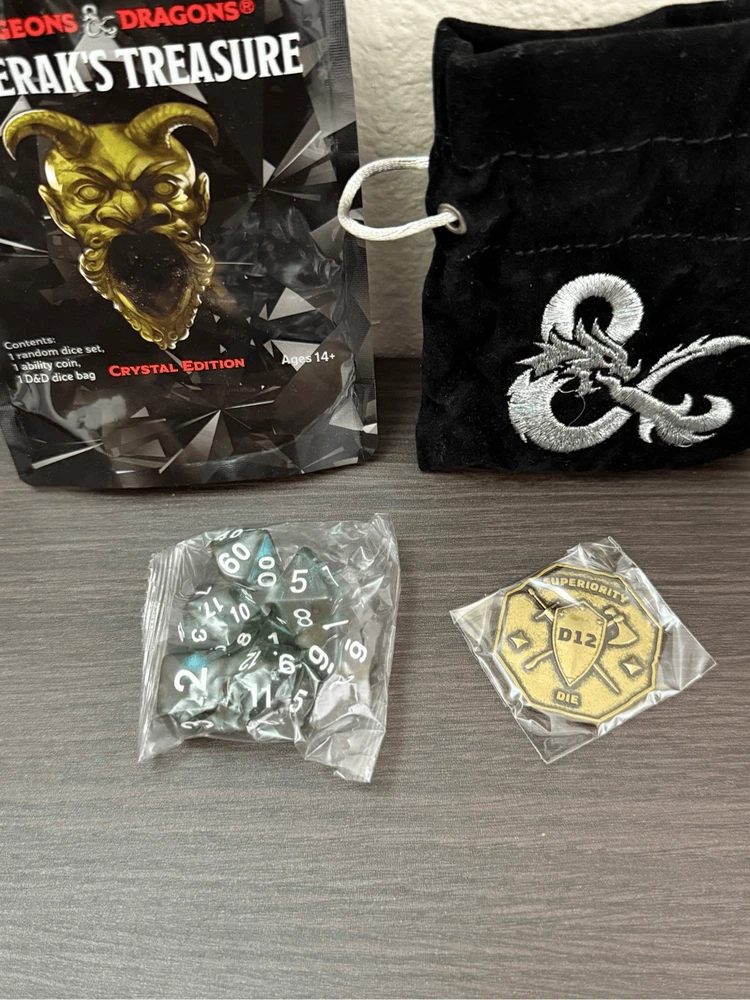 Dungeons & Dragons Acererak's Treasure Crystal Edition Dice Set + Bag + Coin Brand New. Never Used! *Please see pictures for details* Details: 1 dice set 1 dice bag 1 coin I will not responsible for shipment handling or by the carriers. However, I will pack your item with care. :) NO CANCELLATION OR RETURN. ALL SALES ARE FINAL!