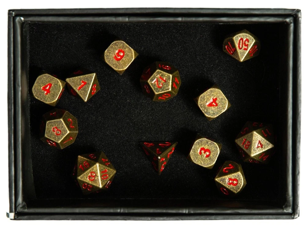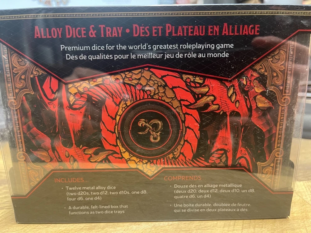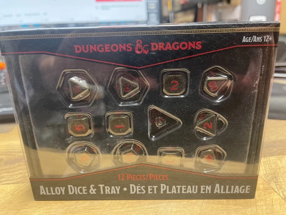 Dungeons and Dragons 12-piece Alloy Dice and Tray (unopened, original box) RARE! Features Includes dice and tray 12 dice total - one D4, four D6, one D8, two D10 (percentile), two D12, and two D20 Heavy metal dice Felt-lined tray Product Description This Dungeons and Dragons Dice and Tray Set consists of 12 dice and one tray. The dice are made from a heavy metal and a bronze finish. The tray is lined with felt to hold the dice. Please message me if you have any questions. Check out my other listings for more rare items. Find more than one item you like? Lets make a quantity discount :) Thanks for looking!