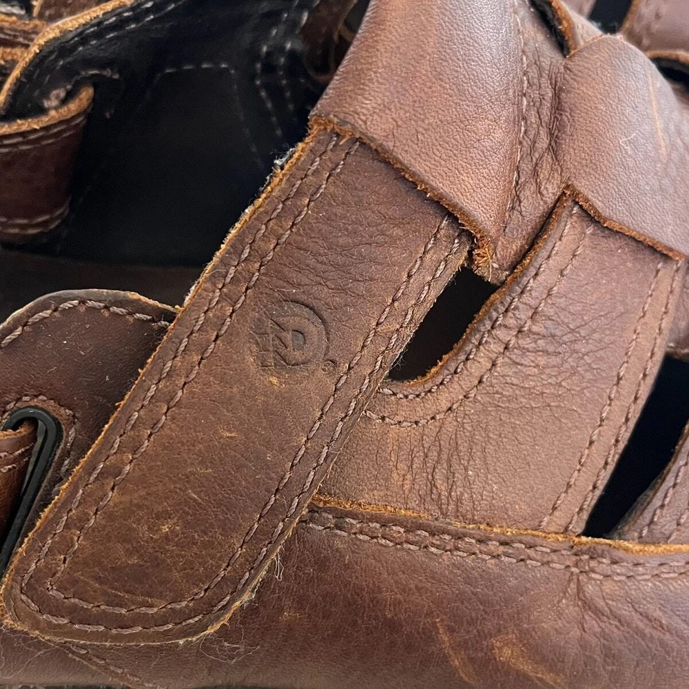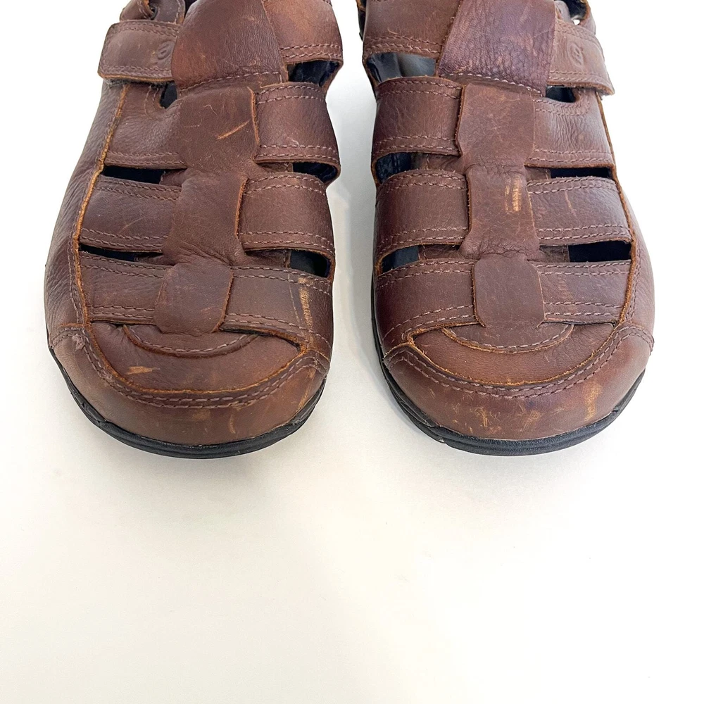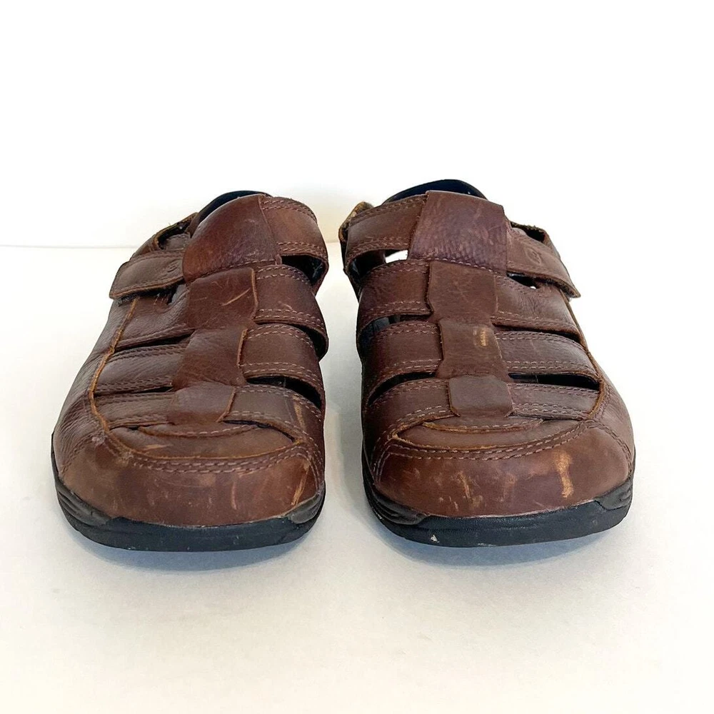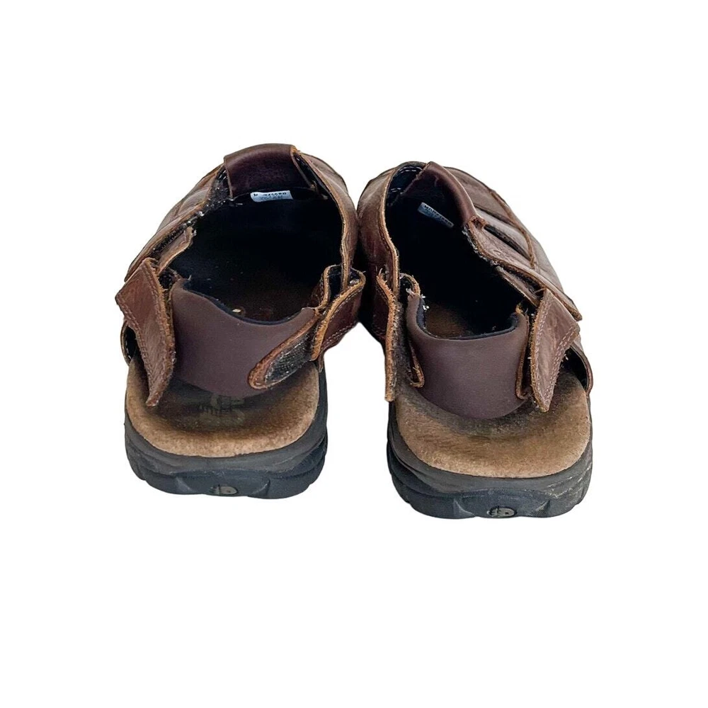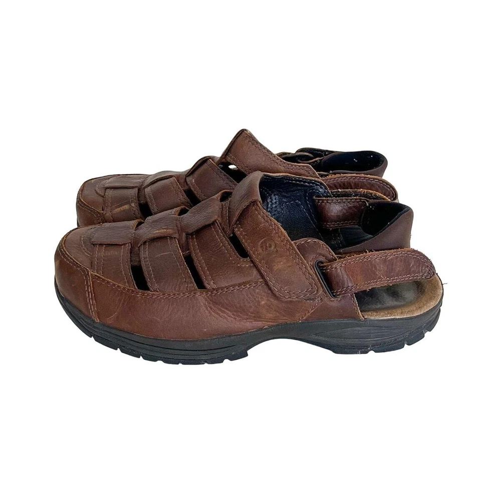 Brown Leather Closed Toe Chunky New Balance X Dunham Fisherman Sling Back Walking Hiking Camping Sandals Shoes Style #MCR456SB Adjustable removable back strap Rubber traction soles Leather upper Adjustable removable back ankle strap Hook and loop side closure Sz 10 platform 1" Good condition light distressing on leather see pics casual walking hiking camping