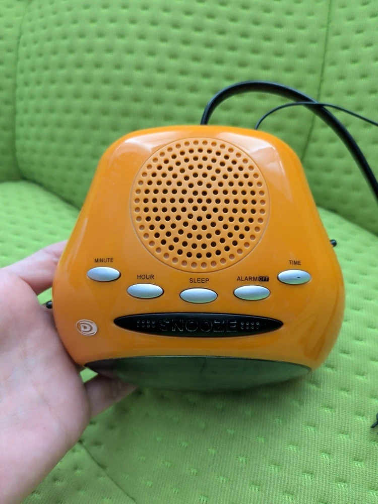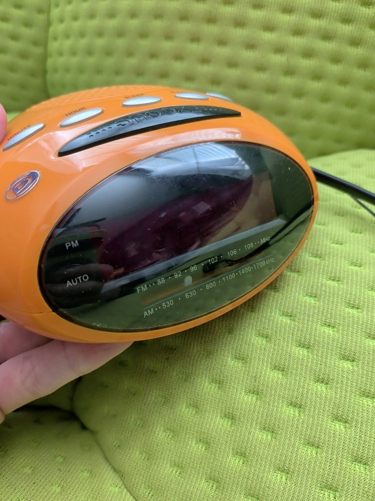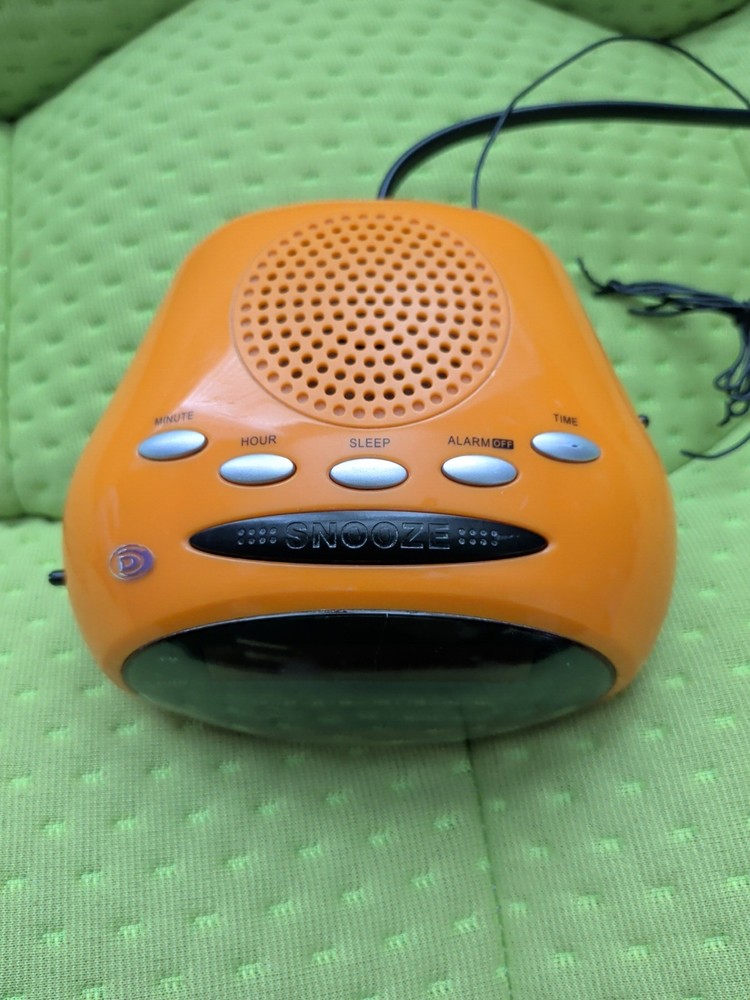 You are looking at a pre-owned Duraband AM/FM Digital Clock Radio Model CR-500 Orange TESTED 2005. This clock was tested and is fully functional. Cosmetically the clock is in good condition, there's a few minor scratches on the clear plastic part in front of the clock which will be shown in the photos - it appears to be just normal wear and tear to me but you he the judge. There's a small surface crack on that plastic as well, it's thin and your fingernail doesn't get caught in it when I was checking the severity of it, it's hardly noticeable.