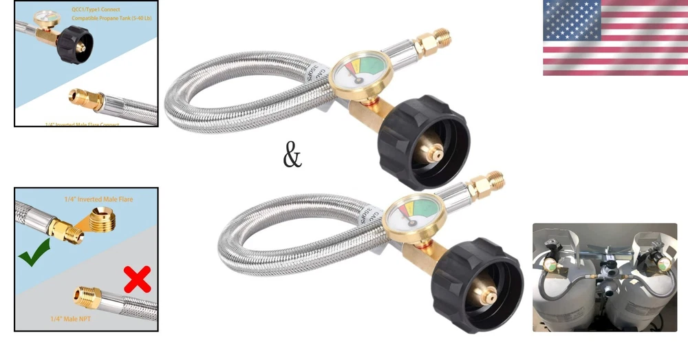Durable 12-Inch Propane Hose with Gauge – Perfect for RV & Camping Use ‹ › ‹ › ‹ › ‹ › ‹ › ‹ › ‹ › ‹ › ‹ › Durable 12-Inch Propane Hose with Gauge Your Ideal Companion for RV & Camping Adventures! Product Specifications: Length: 12 inches Includes: Propane tank gauge Compatible with: 2-Stage Regulator (2 PCS) Connection Method: QCC1/Type1 connector for 5 to 40 pounds of propane tanks. 1/4" inverted male flare connector compatible with RV or trailer propane regulators (NOT 1/4'' Male NPT). Practical Dial: The vibrant color dial allows you to easily monitor your liquid propane levels, eliminating the need for shaking or guesswork. Safety Performance: Engineered with overheat and flow protection for your peace of mind. High-quality rubber hose with a stainless steel braided protective belt shields you against irritations from small animals. Easy to Install: Intuitive handwheel tightening requires no toolbox, making setup a breeze! Perfect for BBQs, RVs, camping needs, and outdoor cooking expeditions. Why Choose Our 12-Inch Propane Hose? Are you in search of a reliable, user-friendly solution for your propane needs during camping or RV trips? Our Durable 12-Inch Propane Hose with Gauge boasts superior safety features and flexible compatibility to ensure you enjoy worry-free cooking experiences outdoors. The practical color dial lets you effortlessly monitor propane levels, while the rugged design offers robust protection against unexpected hazards. Embrace the luxury of convenience and safety on your adventures - order your 12-Inch Propane Hose today and experience the difference! Shipping Free & Fast Shipping - We offer free shipping to most of the USA with a normal delivery time of 3-7 days. However, due to the current situation, additional delivery time (up to 3 weeks) may be required for some items. Alternative Carriers - We may use alternative carriers (e.g. USPS, FedEx, UPS, etc.) to ensure your package arrives safely and on time. Due to the use of multiple carriers, we are unable to provide a tracking number automatically. Handling Time - Orders are processed and shipped within 1-2 business days of receiving cleared payment. Shipping Restrictions - Shipping to Alaska, Hawaii, Puerto Rico, Guam, and other US territories may incur shipping charges or delivery restrictions. Please contact us before ordering, or your order can be refunded/cancelled. State Restrictions - There may be restrictions based on your state of purchase. For example, certain items may not be shipped to California due to state regulations. Contact for Tracking Updates - If you require tracking updates or have any concerns about the delivery of your order, please feel free to contact us, and we will be happy to assist you. Return 30-Day Hassle-Free Returns - We want you to be completely satisfied with your purchase. If you are not, you can return the item within 30 days of receiving it for a full refund or exchange. Easy Return Process - To start a return, simply contact us and we will provide you with a prepaid return shipping label and detailed instructions. Restocking Fee - There are no restocking fees for returns. However, the buyer is responsible for return shipping costs if the return is not due to a seller's error. Refund Processing Time - Refunds will be processed within 5 business days of receiving the returned item in its original condition. Payment We accept all major credit cards, PayPal, and Apple Pay for your convenience. Your payment information is secure and encrypted to ensure a safe and seamless transaction. Please complete your payment within 3 days of purchase to avoid any delays in shipping. Feedback Your feedback is extremely important to us. We strive to provide the best products and customer service possible. If you are satisfied with your purchase, please take a moment to leave us a positive review. If you have any concerns or issues with your order, please contact us before leaving negative feedback. We are committed to resolving any problems and ensuring your satisfaction. Contact Us If you have any questions or concerns, please feel free to reach out to our customer support team. You can contact us through the eBay messaging system. We are available Monday to Friday, 9:00 am to 5:00 pm EST, and we will do our best to respond to your inquiry within 24 hours. Buy it now and enjoy a pleasant shopping experience! Manufacturer Part Number: RV Propane Hose with Gauge UPC: Not Set MPN: RV_Propane_Hose_with_Gauge Unit Quantity: 12 Brand: Unbranded Part Type: Accessories Country/Region of Manufacture: RV Propane Hose with Gauge Warranty: Unspecified Length Unit Type: Not Set