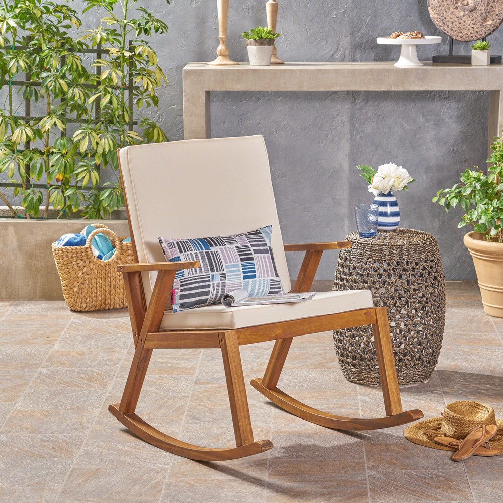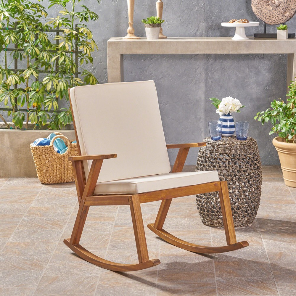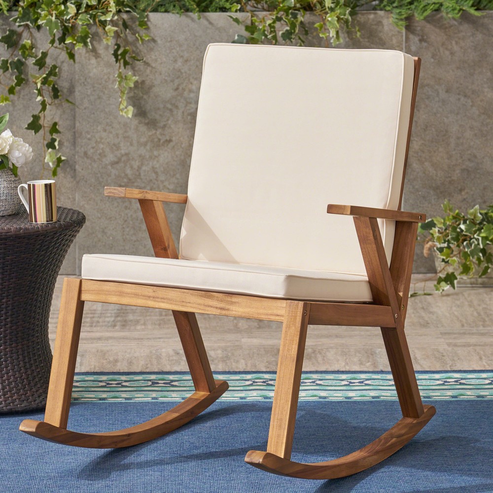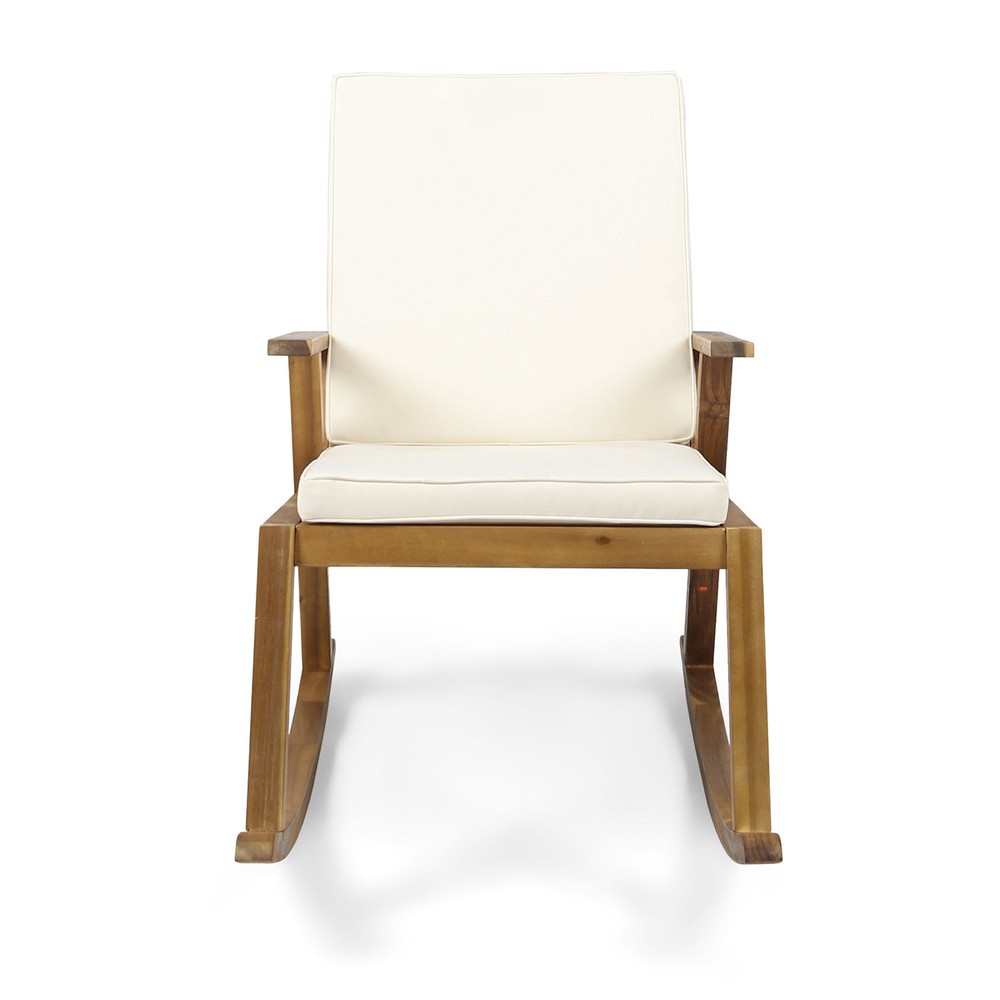 Specifications Place of Origin #originPlace# Main Color Cream Main Material Acacia Wood Dangerous Goods #dangerFlag# Dimensions & Weights Assembled Length (in.) 26.00 Assembled Width (in.) 35.75 Assembled Height (in.) 36.75 Weight (lbs) 24.25 Product Features Our rocking chair offers your outdoor space a place of ultimate relaxation with deep soothing rocking motions and cozy cushions. The cross-back design and weather-resistant cushions illuminate even the dullest and drab porch or patio area with a delightfully homey touch. Featuring a gorgeous acacia wood frame and slat seating, our rocking chair brings both incredible comfort and an intimate vibe to your outdoor space. MODERN WITH FARMHOUSE INFLUENCE: With clean, precise lines, our rocking chair is the ideal modern accessory for your interior space. Finished with a sleek wood frame and bold cushions, this rocker not only offers a chic, minimalistic look but also provides incredible structure. This is finished with an X-shaped back for a farmhouse influence. ACACIA WOOD: Made with acacia wood that brings a sleek and exotic look to your space, this durable hardwood naturally withstands outdoor elements and will not darken over time. Acacia wood is perfect as a solid, heavy frame that resists wear and tear. ROCKING FEATURE: This chair features long rockers that are ideal for deep, soothing rocking motions, excellent for relaxing out in the summer sun. DIMENSIONS: Choose an accessory that is the perfect size for you and your furniture. This rocking chair is 26.00” W x 35.75” D x 36.75” H. You will love how much your space can transform with the simple addition of this charming chair. ASSEMBLY REQUIRED: Some assembly is required for this set. All of the instructions and tools needed for assembly are included. Frame Material Details : Acacia Wood Leg Material Details : Acacia Wood Care Instructions : Spot Clean Description