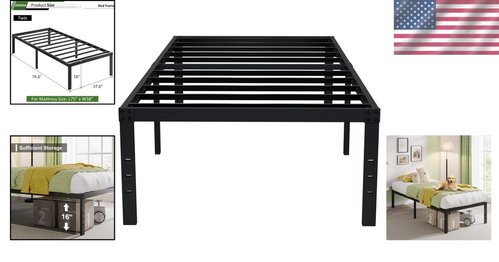 Item Weight: 80 lb Color: Black Personalized: No Item Type Name: Platform Furniture Finish: Metallic Item Height: 18 Inches Ground To Item Distance: 16.5 Inches Assembly Required: Yes Finish Types: Polished Maximum Weight Recommendation: 800 Pounds Shape: Rectangular Style Name: 18 Inch Features: Easy Assembly, Noise Free, Large Storage Space Item Dimensions L X W X H: 74.6"l X 37.6"w X 18"h Care Instructions: Wipe with damp cloth Mattress Included: No Country of Origin: China Frame Material: Metal Unit Count: 1.0 Count Brand: Unbranded Included Components: Headboard, Slat Style: 18 inch Type: Platform Bed UPC: Does Not Apply Additional Parts Required: No Room: Bedroom Other Special Features Of The Product: Fade Resistant, Squeak Resistant Material Type: Metal Department: Adults Compatible With Mattress Size: Twin, 75x38 Inch Product Care Instructions: Wipe With Damp Cloth Distance from Floor to Bottom: 16.5 inches Compatible Mattress Size: Twin Number of Drawers: 0 Finish: Polished Required Assembly: Yes gtin13: Does Not Apply