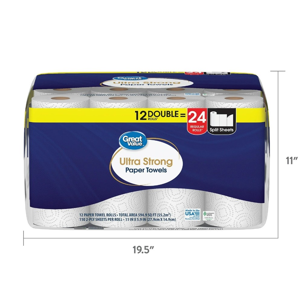 Product details Ultra Strong Paper Towels feature premium 2-ply paper towel sheets that are super strong and absorbent making them the ideal paper towel for your home. Our towel has the right combination of soft texture with durable strength that you've been looking for. This bulk paper towel pack contains 12 double rolls which gives you twice as many sheets as regular rolls, so you can tackle twice as many messes. The split sheets give you the option to choose the amount you need when cleaning up spills, dirt, grime, food waste, and more. The rolls are conveniently sized to easily fit in any kitchen, bathroom, workspace, etc. Each paper towel roll includes 110 sheets with a beautifully embossed pattern that enhances the look of your kitchen and home. Each pack includes 12 Double Rolls with 110 2-ply sheets per roll. Experience the difference with Ultra Strong Paper Towels. Ultra Strong Paper Towels, White, 12 Double Rolls This 12 double roll pack is equivalent to 24 regular rolls (when compared to regular-size rolls with 55 sheets) Each roll features 110 split size sheets, which gives you two size options for cleaning various messes Ultra paper towels are SFI? certified ? which supports sustainable forests and healthy habitat Our absorbent paper towels have soft texture with durable strength you can trust Total Area: 594.9 sq ft (55.2 m) Sheet Size: 11 in X 5.9 in (27.9 cm X 14.9 cm) Specifications Paper Towel Type Pick-a-Size Number of Rolls 12 Paper Towel Sheet Size Half Sheet Number of Sheets 12 Perforated Y Assembled Product Dimensions (L x W x H) 19.98 x 14.98 x 11.00 Inches