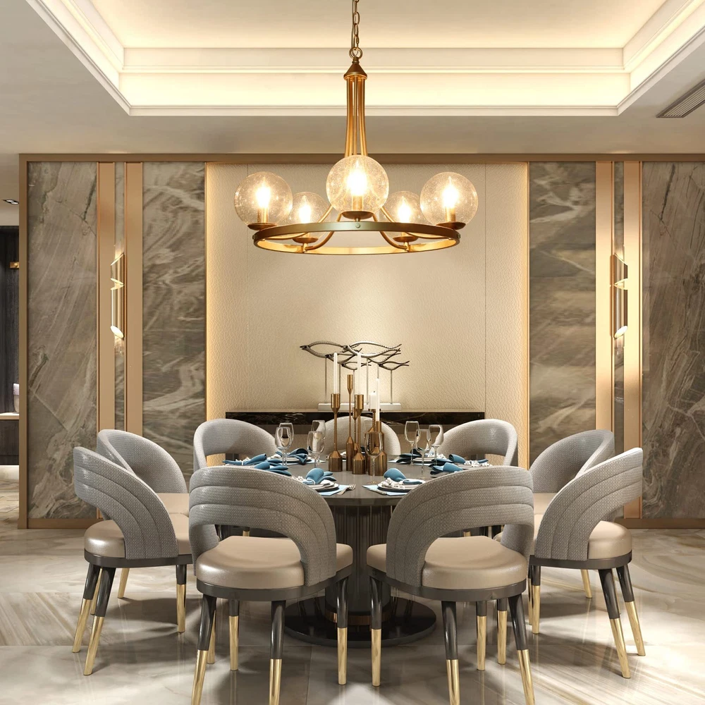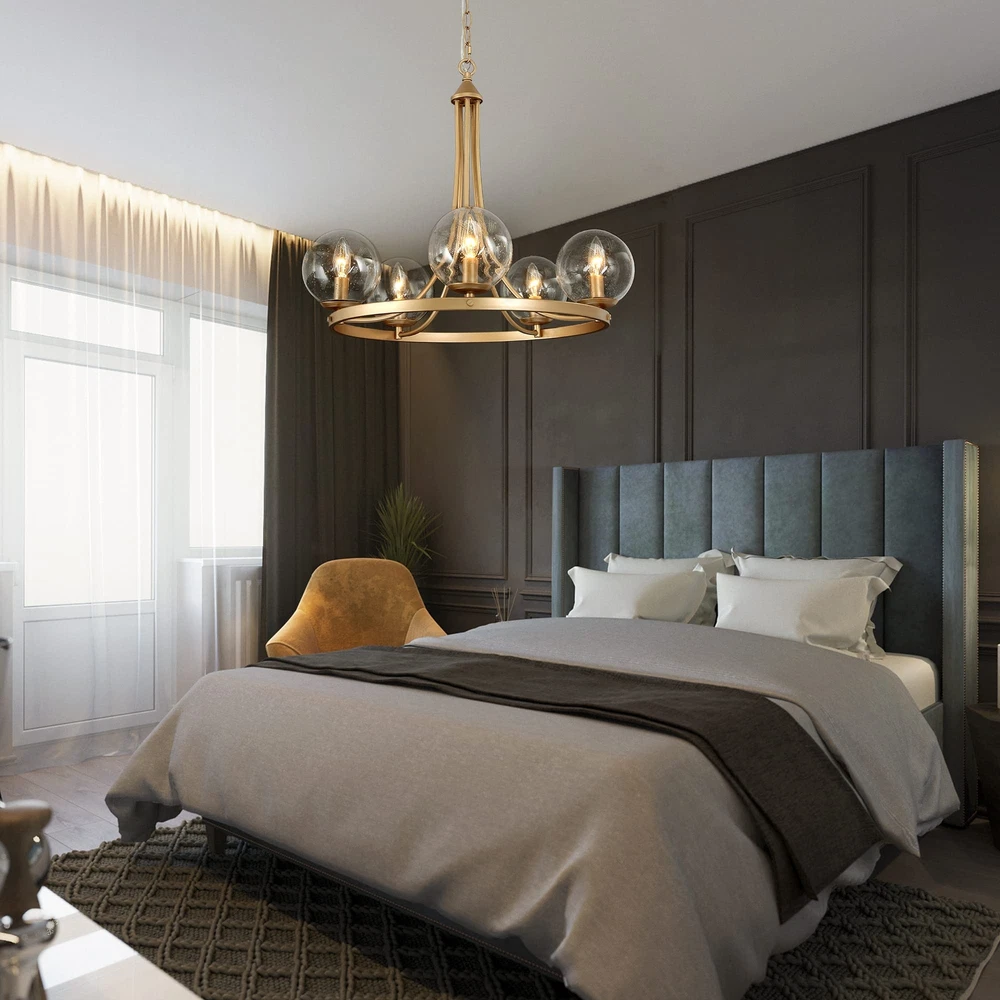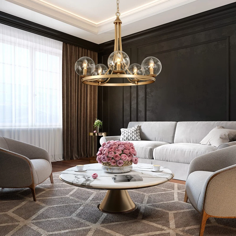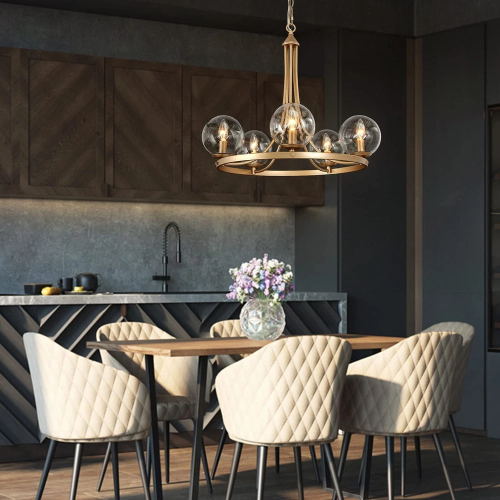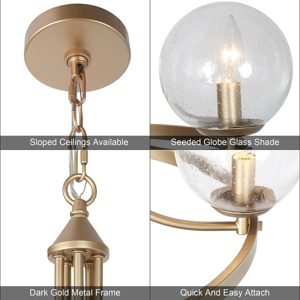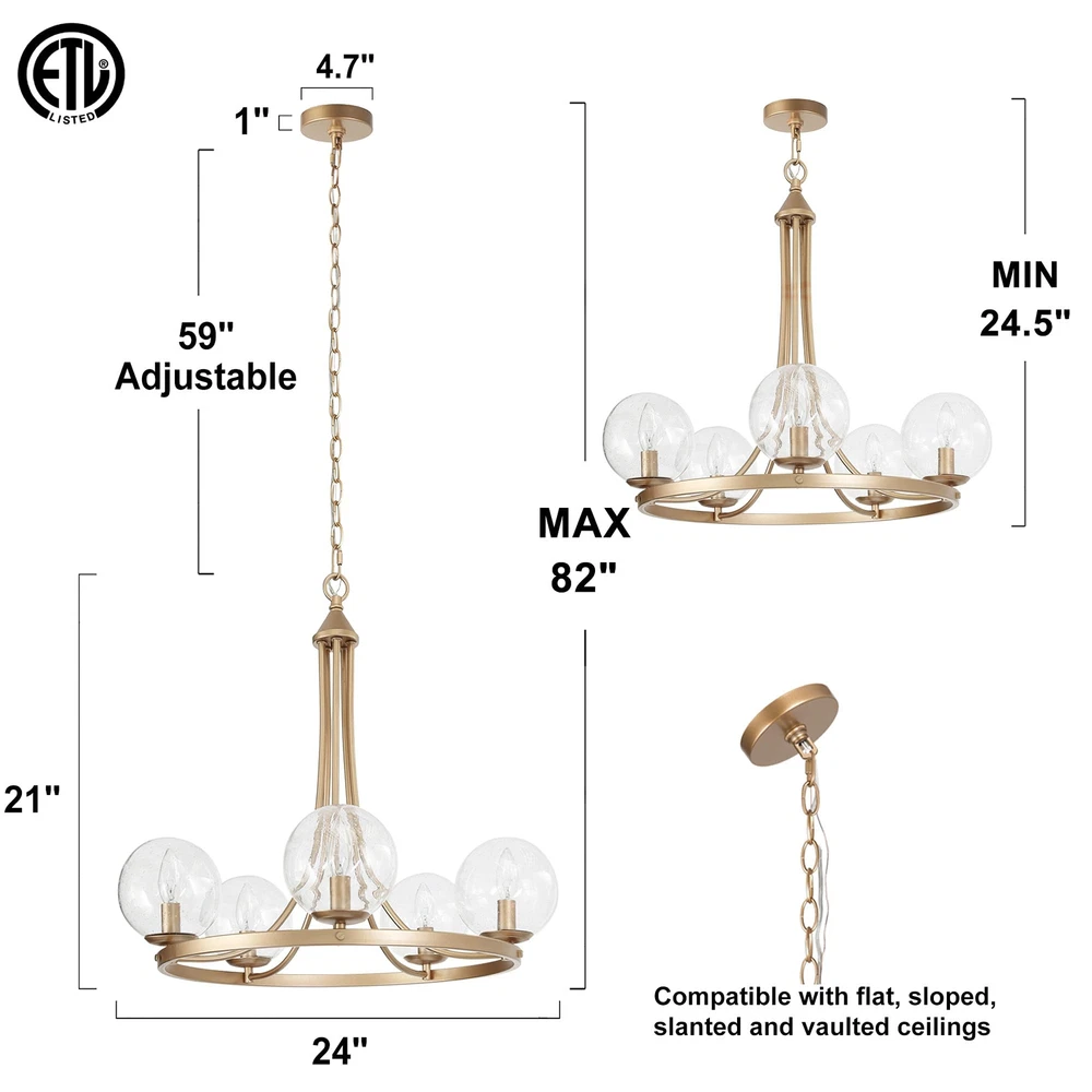 The modern gold chandelier comes with 5 seeded glass globe shades, which effectively protected the bulbs while emitting maximum light sources through the clear shades. The metal frame in a dark-gold finish is durable, solid, and very stable in thickness and shape. The pendant lighting fixture arrives part assembled with all the arms pre-wired for quick and easy assembly. All hardware and installation manual are included. 【Modern Globe Chandelier】- If you are looking for a stunning and modern chandelier that adds your dining or living rooms with a layer of chicness and personality, this glass ball pendant light will fit the bill. The large round metal frame is finished in dark gold, silently holding the 5 light sources, with seedy glass shades covered. The sleek and classic shape makes the chandelier an ideal option for any contemporary dining room, living room, bedroom, foyer, or hotel lobby. 【Ideal Dimensions】- Chandelier Size: 24"D x 21"H, highly recommend for a dining/living room, bedroom, or foyer. Canopy Size: 4.7"D x 1"H, designed to fully cover the junction box of standard size. 【Height Adjustable】- The gold pendant chandelier is equipped with a 59" chain, allowing you to adjust the overall height of the light from Min 24.5" to Max 82". Perfectly fits flat, sloped, slanted, vaulted, or high ceilings. 【Bulb Requirement】- 5 x e12/max 40w bulbs are required for this modern chandelier. Incandescent, led, CFL, vintage filament bulbs are compatible. Please note the diameter of the bulbs should be less than the opening of the glass ball (2.5"). 【Fully Dimmable】- The chandelier is compatible with a dimmer switch and dimmable bulbs, so that can satisfy your different brightness demands. 【Easy to Install】- The matte gold chandelier arrives part assembled, with all the arms pre-wired for quick and easy installation. The arms are rotatable, please adjust them to the appropriate positions. All hardware and user manual are included. Hardwired, professional installation recommended. 【Safe in Use】- The bulb sockets and electric wires of the globe chandelier are ETL listed for your safety. Please note the chandelier only works in dry locations. 【Buy with Confidence】- All of our products have passed strict inspection before shipping. And to ensure your 100% satisfaction, we put a 2-year limited warranty on our lighting products against any defects in quality and craftsmanship. Please feel free to contact us both pre-sales and after-sales if you have any questions.