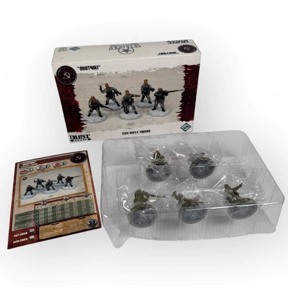 Step into a gritty, alternate history of World War II with Fantasy Flight Games' Dust Tactics. This SSU Ohotniki (Rifle Squad) miniature set is a must-have for enthusiasts and collectors alike, providing a touch of sci-fi to the familiar setting of the 1940s. The set comes fresh from its original packaging, ready to take its place in your collection or to spark the imagination of new players joining the Dust 1947 game.
