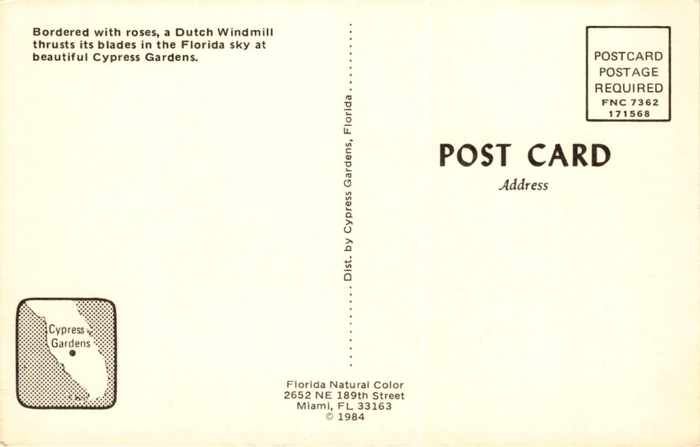 MAKE AN OFFER. THE MORE YOU BUY THE BETTER DEAL I WILL ACCEPT This postcard features a Dutch windmill surrounded by roses at Cypress Gardens in Florida. Cypress Gardens was a botanical garden and theme park located in Winter Haven, Florida. It was known for its beautiful gardens, water ski shows, and Southern Belle performances. The park opened in 1936 and was a popular tourist destination for many years.