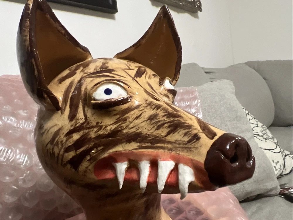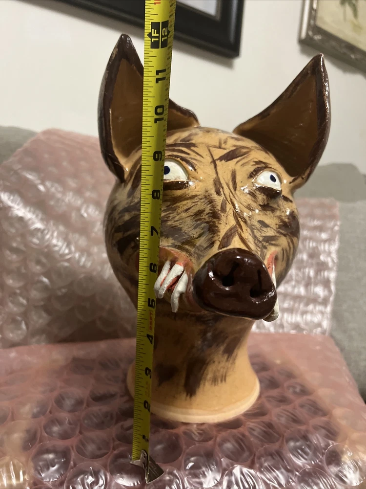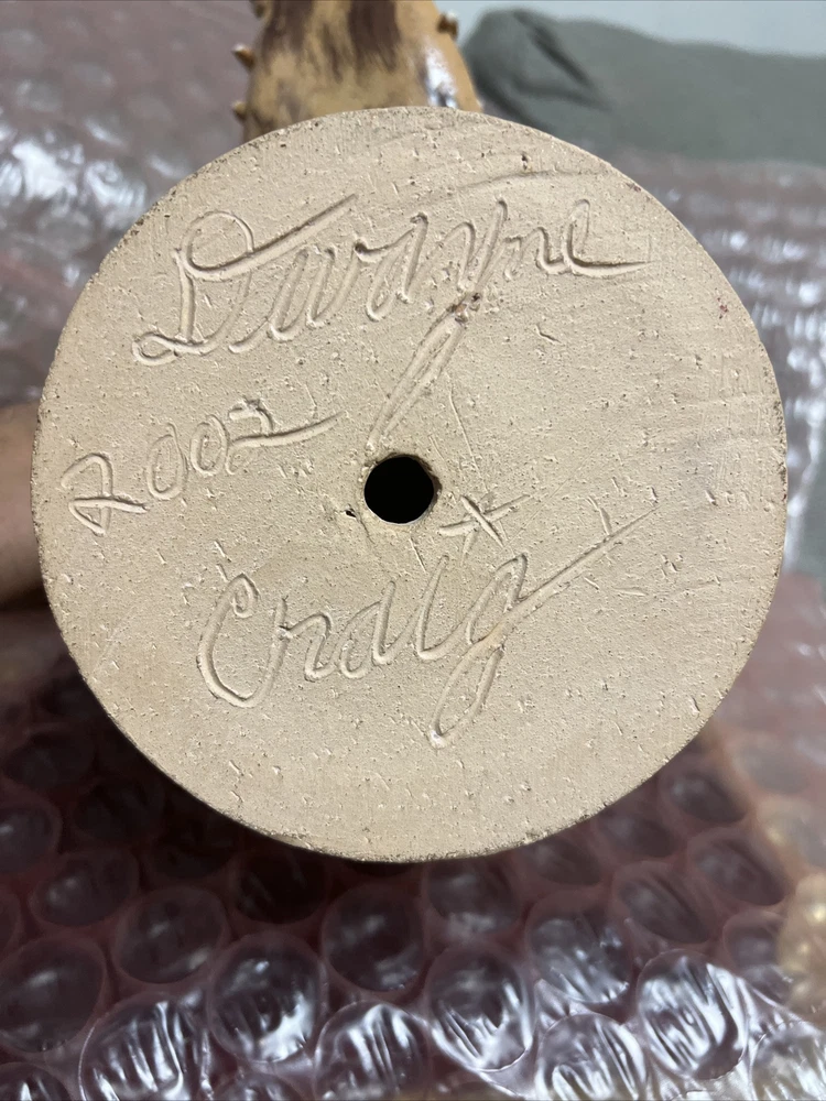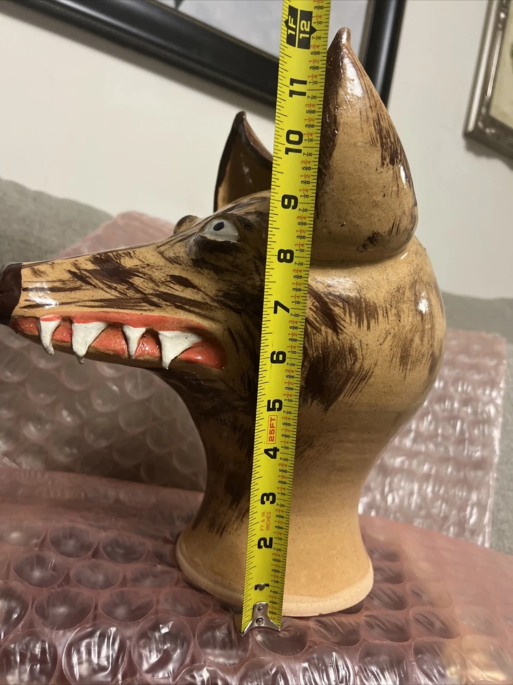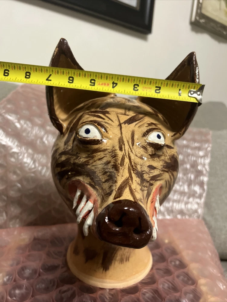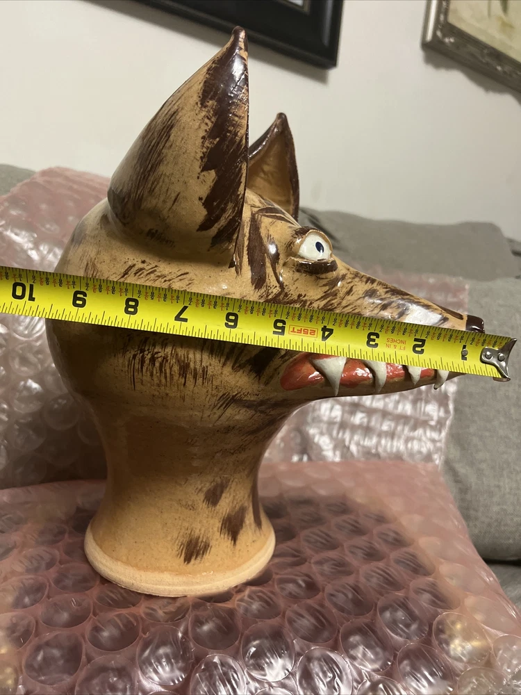 This unique and handmade jug is a must-have for collectors and art enthusiasts. Created by Dwayne Craig from Catawba, North Carolina, the jug features a stunning wolf face design that showcases Craig's exceptional pottery skills. Made of high-quality clay and crafted using traditional pottery techniques, this jug is a true work of art. The beige color and intricate details make it a beautiful decorative piece for any home or office. Perfect for serving beverages or as a conversation starter, this jug is a one-of-a-kind item that is sure to impress. New , used as a display only
