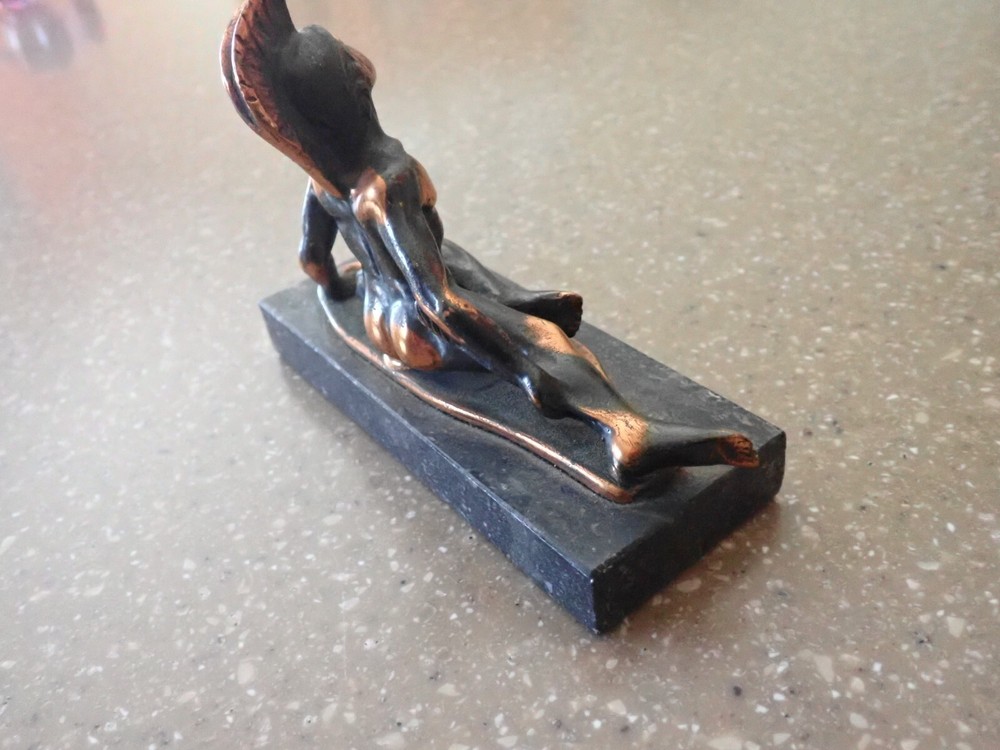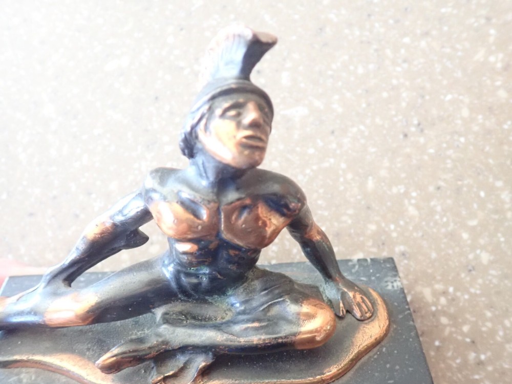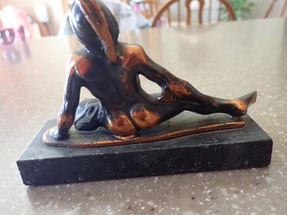 Picked this up at an estate sale. I know nothing about it. Weighs an ounce shy of 2 pounds. So metal figure is solid. No returns. Pictures are part of, if not most of, the description. We try to take clear pictures that expand upon viewing so there should never be an issue with what our items look like. If you would like more precise photos please ask for them prior to bidding or making offers. If dimensions are given, please compare to your similar item for fit. We combine shipping so check our other listings for more great stuff! If you buy more than one item please wait for an invoice for the adjusted shipping rate. We always ship as economically as possible. Our store is smoke and pet free.