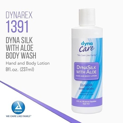 DynaSilk with Aloe Hand & Body Lotion is formulated with aloe vera to help moisturize dry skin. Quantity per Case: 48 Formulated with aloe vera gel to help soothe dry skin Non-greasy formula can be used on hands and body Fresh, clean scent Ideal for use in hospitals and long-term care Not made with natural rubber latex