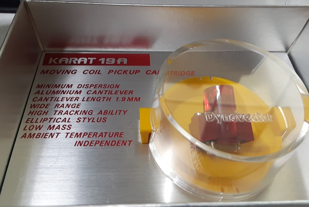 Dynavector Karat 19A rare phono cartridge for sale. This is low output moving coils type. The cartridge has tapered cantilever with super elliptical stylus. The cartridge is in very good operational and cosmetic condition. It has 250 hours and could be played for another 2000 with no issues. Specifications: Output:0.25 mV Tracks:1.5-2.0 g Loads:> 100 Ohm Unloads:32 Ohm Compliance:14 Sell: $525 Shipping inside USA is $6 Worldwide shipping is $23