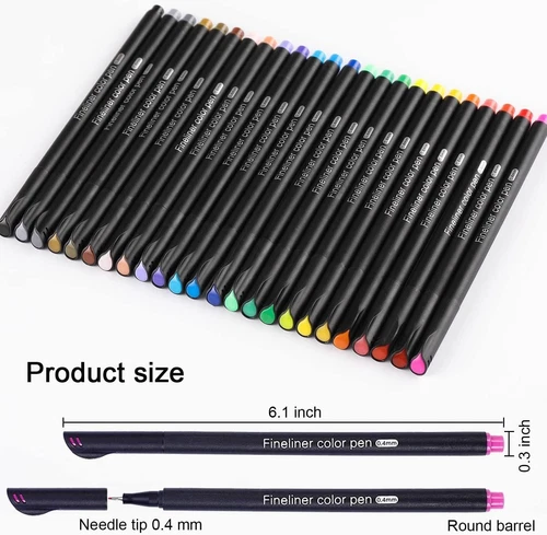 Dyvicl Fineliner Pens, 24 Colors 0.4mm Fineliner Color Pen Set Fine Point Markers Drawing Pens for Journaling, Note Taking, Calendar, Adult Coloring Product Details Manufacturer: Dyvicl Brand: Dyvicl Item Weight: 5 ounces Package Dimensions: 10 x 7.83 x 0.91 inches Item model number: VC-24FP Color: Multicolor Material Type: Plastic, Metal Number of Items: 24 Point Type: Fine Line Size: 0.4 Millimeters Ink Color: Multicolor Manufacturer Part Number: VC-24FP Brand: Dyvicl Ink Color: Multicolor Number of Items: 24 Point Type: Fine Recommended Uses For Product: Coloring,Drawing 24 Vibrant Colors - Fineliner color pen set contains 24 unique brilliant colors, 0.4 mm fine point colored pens. Assorted color fine tip pens for drawing lines & details, schedules, architecture, sketching, writing, signing, journals, calendars, agendas, notebooks, planners, adult coloring books, art supplies, school supplies, and office supplies Fine Point Pens - Ultra-thin 0.4 mm fine point markers colored pens with a superfine, metal-clad tip for precision & durability. Great for fine, detailed work with rulers & stencils, artists' fine-ink drawings, and coloring small intricate patterns Safe & Non-Toxic Color Ink - Colored art writing drawing porous point pens. Water-based ink, dry safe, minimal bleed thru (except very thin paper), acid-free, non-toxic ink, these fiber-tipped pens create fine lines and intense water-based colors. PP barrel and cap long service life. The fine line pens colored drawing pens conform to ASTM D-4236 & EN71 Portable Plastic Case Package - Colorful fine tip pens come in a nice plastic storage case that can be easily placed in backpacks. For use in school, travel, home, office, work, business, colleague, church, club, and organization activities Art Supplies for Everyone - Dyvicl fineliner pens fine point pens are making a present for art-loving children, students, artists, and friends. Please put on the cap after use to avoid dryness and blockage. If you have any concerns, please feel free to reach out to us