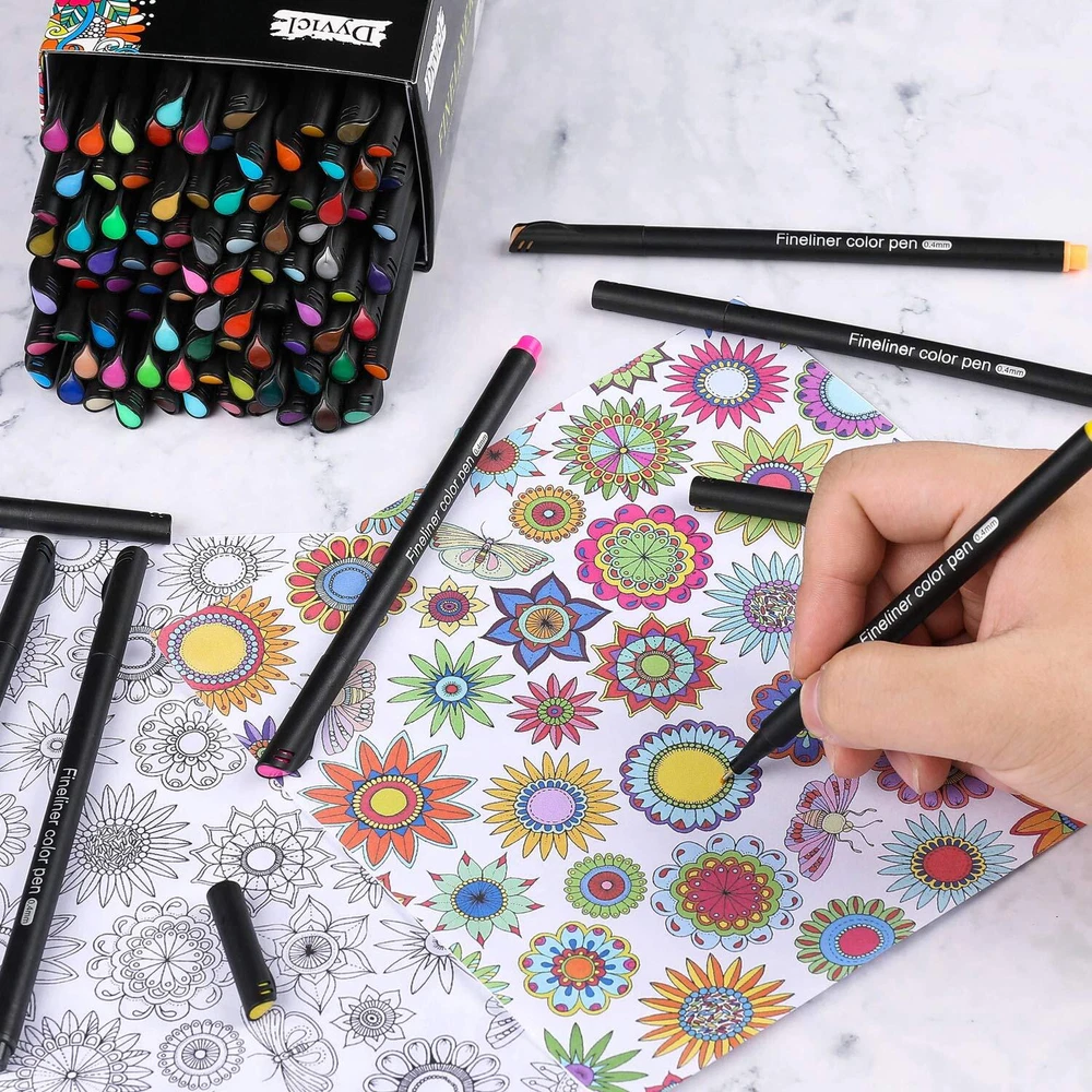 Dyvicl 100 Brilliant Colored Fine Liner Marker Pens Our fineliner color pen set contains 100 colors 0.4mm fine point colored pens, bonus 50 pcs stickers. Unlimited possibilities- never stop creating. Writes like a pen, bold like a marker! 0.4 mm fine tip art markers provides smooth, colorful precision. Clean, crisp writing, Water-based ink, bold colors that won't bleed through paper results could vary based on paper characteristics. Metal nib protects tip from wearing down. The dyvicl fine line pen set is perfect for drawing lines & details, painting, writing, sketch, marker, signing, manga, animation, graphic, design, planner, math book, homework, bills, calendar, illustration, included artists fine-ink drawings and coloring small intricate patterns. Great for home, office, work, business, colleague, church, club, and organazition activities.especially used by the designers of Architecutre, AD, Comic (Manga) and Animation for drawing lines and signing. They are specially designed for artists, designers, students. Quick-Drying, No-Bleed 100 pack assorted colors fineliner marker pens, no duplicates, minimal bleed thru, write almost effortlessly. Quick-drying, water-based ink is specifically designed to resist smearing and not bleed through paper for neat notes, doodles and adult coloring pages. Versatile 0.4 mm Fine Point Ultra-thin 0.4 mm fine point colored pens with superfine, durable metal-clad tip for precision & durability. Perfect for fine, detailed work with rulers & stencils, artists fine-ink drawings and coloring small intricate patterns. outstanding performance in all areas of writing, drawing, coloring. Ergonomically Designed The fashionable designer barrels are slender and nice to hold and work with. Color-coded caps for ease in organization and quick selection of the 100 colors. Keeping your well organized and serving as a perfect premium gift ideal for family, friends, co-workers. 100 Vibrant Colors - Fineliner color pen set contains 100 unique brilliant colors, 0.4 mm fine point colored pens. Assorted color fine tip pens for drawing lines & details, schedules, architecture, sketching, writing, signing, journals, calendars, agendas, notebooks, planners, adult coloring books, art supplies, school supplies, and office supplies Fine Point Pens - Ultra-thin 0.4 mm fine point markers colored pens with a superfine, metal-clad tip for precision & durability. Great for fine, detailed work with rulers & stencils, artists' fine-ink drawings, and coloring small intricate patterns Safe & Non-Toxic Color Ink - Colored art writing drawing porous point pens. Water-based ink, dry safe, minimal bleed thru (except very thin paper), acid-free, non-toxic ink, these fiber-tipped pens create fine lines and intense water-based colors. PP barrel and cap long service life. The fine line pens colored drawing pens conform to ASTM D-4236 & EN71 Bonus Cute Stickers - 50 pcs stickers are included that give you unlimited possibilities- never stop creating. Keeping you well organized and serving as a present for family, friends, neighbors, and co-workers. Colorful pen is great for school, travel, home, office, work, business, colleague, church, club, and organization activities Art Supplies For Everyone - Dyvicl fineliner pens fine point pens are making a present for art-loving children, students, artists, and friends. Please put on the cap after use to avoid dryness and blockage. If you have any concerns, please feel free to reach out to us