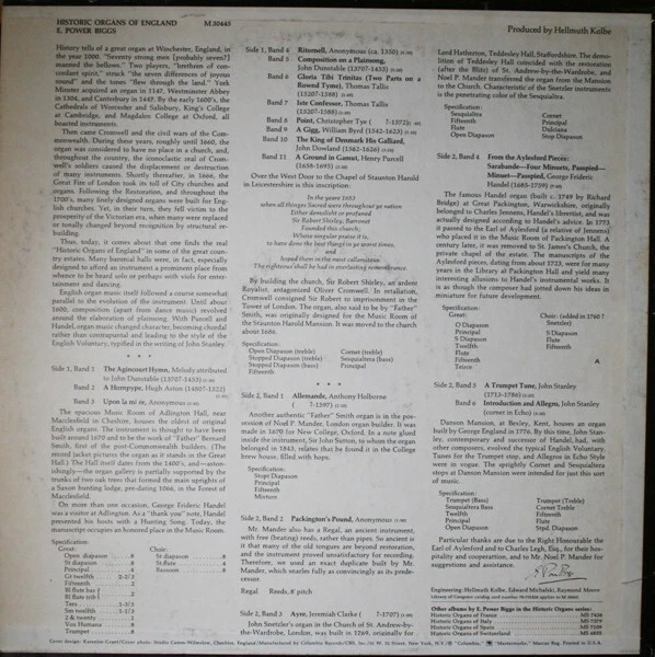 E. Power Biggs, Historic Organs Of England, LP, Album Comment(s) and Condition Notes specific to this listing: ***Carefully handled and properly stored. A very nice copy of this record.*** Media Condition: Near Mint (NM or M-) Based on visual inspection. Album Cover / 7" Picture Sleeve (GENERIC = NONE) / CD Insert Condition: Near Mint (NM or M-) STOCK PHOTOS HAVE BEEN USED WITH LISTING: Photos shown have been pulled from an online database. A picture / company sleeve / CD insert in the photo does not guarantee it is included. If a picture sleeve / insert is included, its Condition will be filled in above this line. SPECIFICATIONS ARE AUTO-FILLED: If there is something specific you require, please ask us to confirm. Thank you for having a look at our collection! Be sure to follow us so you're notified when we post new items. IMPORTANT NOTE: A picture sleeve in the stock photo of a vinyl record does not guarantee a picture sleeve is included with this item. If the vinyl record sleeve condition specifies "Generic" THERE IS NO PICTURE SLEEVE (item will come in a company sleeve or plain sleeve.) Track List : A1. The Agincourt Hymn 1:30 A2. A Hornpype 2:20 A3. Upon La Mi Re 2:45 A4. Ritornell 1:35 A5. Composition On A Plainsong 1:20 A6. Gloria Tibi Trinitas (Two Parts On A Rownd Tyme) 1:05 A7. Iste Confessor 1:20 A8. Point 0:45 A9. A Gigg 1:10 A10. The King Of Denmark His Galliard 3:15 A11. A Ground In Gamut 2:20 B1. Allemande 2:10 B2. Packington's Pound 1:00 B3. Ayre 1:05 . From The Aylesford Pieces 7:45 B5. A Trumpet Tune 2:25 B6. Introduction And Allegro 4:20 Catalog Number: M 30445 Notes on shipping: All items are packed carefully and shipped quickly. Domestic postage is included with the price. International customers buying multiple items: Please group items into a single order and hold payment until package weight/dimensions can be adjusted. Notes on Media Grading (visual inspection only): Mint: Only used for sealed items. Near Mint: As close to Mint condition as any used item can be. The media shows no obvious signs of wear. Part of an exceptional collection, curated with care, carefully handled, and properly stored. Very Good Plus: A minimal amount of storage or play wear, if present, will be superficial, difficult to see, and will not detract from sound quality. Very Good: Pronounced storage or play wear and, maybe, a few superficial scratches are present. There may be some noise during playback but no skips. Good Plus or Good: Significant noise can be expected on playback due to visible scratches and/or groove wear. LP Record Cover Grading: Mint: Only used for sealed items. Near Mint: Sharp spine with crisp edges. May have age-related (but minor) wear & tear. A very nice sleeve suitable for most collectors. Very Good Plus: Sleeve may have a small sticker or bit of writing but looks great. Minimal ring wear. Very Good: Acceptable cover but may have drill hole or cut corner. May have split sides, large sticker, or prominent ring wear. Good Plus: