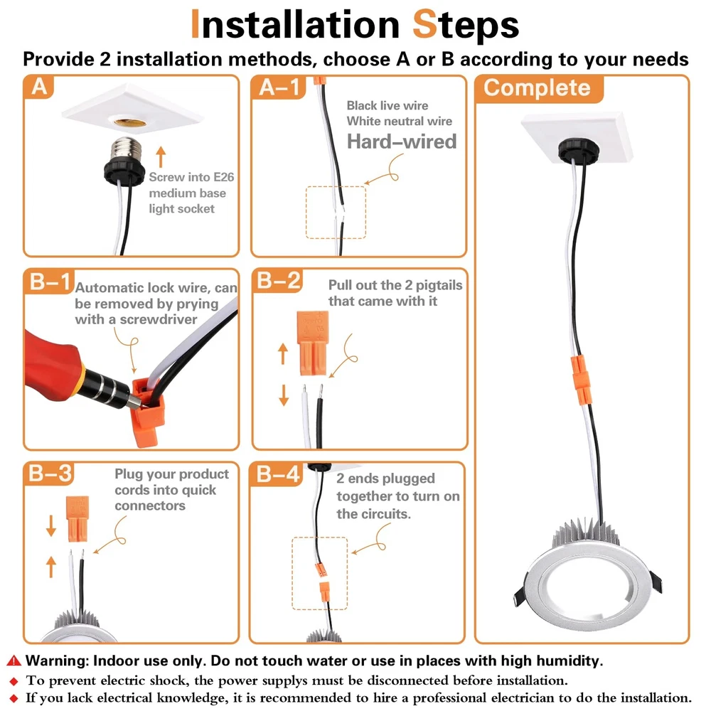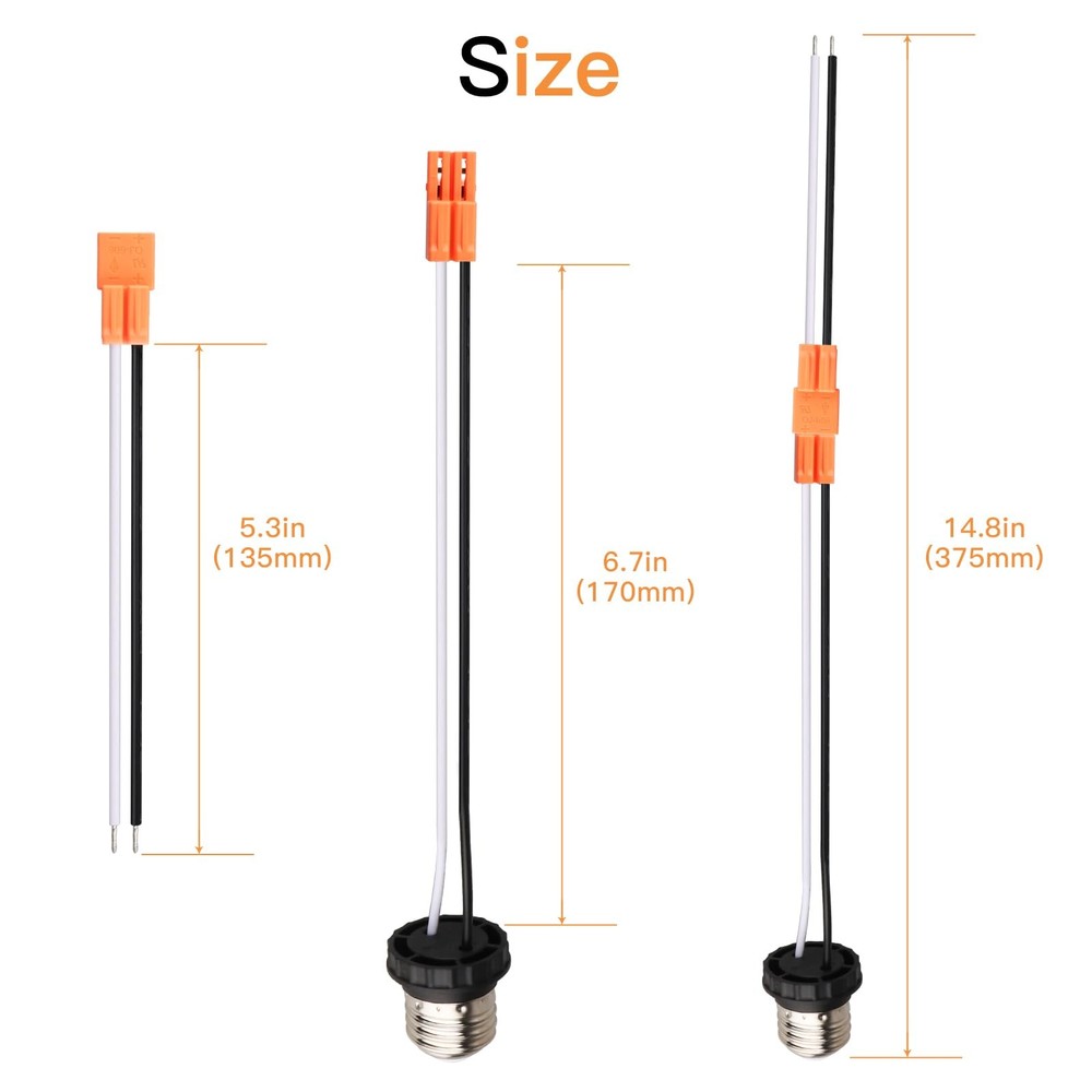 E26 Socket Adapter, 6 Pack Light Bulb Socket Pigtail, Screw in Male Light Safe and Durable: Our light bulb sockets pigtail meet North American electrical safety requirements, using 18AWG wire core, insulation flame retardant, heat resistant, and durable. Applicable: The E26 socket adapter converts traditional downlight ceiling E26 light bulb sockets to LED recessed ceiling light. Perfect for retrofitting recessed lights, downlights, chandeliers or other close to ceiling lights. E26 Socket Adapter: A great converter, Designed to convert an energized old E26 medium base light socket into an adapter connection for a new fixture, avoiding the need to rewire or remove ceiling circuits. Easy to Install: E26 standard base screw light socket with 2 electrical pigtails ready to connect, which provides two types of connections, hard-wiring and quick wire connectors.(Requires a screwdriver to remove the original pigtail) Specification: Pack of 6. The total length of the extension pigtail wire is 12 inches(30cm). Black live wire, white neutral wire. Outlet socket adapter rating: Max 660W 660V. medium E26 base converter adapter socket and male pigtail 1. It is a very convenient and practical E26 base converter socket to solve a need to plug in a socket. 2. E26 socket adapter to convert downlight ceiling light bulb sockets to LED recessed light. 3. No need to cut the wires of your installed light bulb socket, just screw this socket adapter base into your existing socket and wires ready to connect your ceiling light. Specifications Connector Base Type: E26 Outlet Socket Adapter Rating: Max 660W 660V. Overall Length: 30cm / 12 inches Package Included: 6 x E26 socket adapter 1 x Instruction manual Warning: For indoor use only! Not waterproof, do not use in a humid environment. The power must be turned off before installation to prevent electric shock. If you lack electrical knowledge, it is recommended to hire a professional electrician to do the installation. E26 Light Socket Adapter Replacing traditional E26 light bulb sockets with LED recessed lights takes only a few minutes to connect the pigtails, allowing the new lights to be energized and illuminated using the E26 light bulb sockets. Converts standard mid-size threaded sockets into basic wire connections No need for you to remodel the original ceiling wire wiring in your house! with the conversion of E26 socket adapter, you can change the individual E26 light bulb sockets to new lighting, you can install new LED ceiling fixtures, recessed light, chandelier, pendant lights, close to ceiling lights, island lights, ceiling fan light kits, to the ceiling and connect to the power source easily. Shipping We offer FREE shipping on all orders! We ship within Three business days of payment, usually sooner. We use a selection of shipping services such as UPS, FedEx, USPS etc. We only ship to the lower 48 states, no APO/FPO addresses or PO Boxes allowed. Local pickups and combined shipping options are not provided at this time. Return You can return a product for up to 30 days from the date you purchased it. Any product you return must be in the same condition you received it and in the original packaging. Please keep the receipt. Payment We accept payment by any of the following methods: PayPal Please pay as soon as possible after winning an auction, as that will allow us to post your item to you sooner! Feedback Customer satisfaction is very important to us. If you have any problem with your order, please contact us and we will do our best to make you satisfied. Contact Us If you have any queries, please contact us via ebay. We usually respond within 24 hours on weekdays. Please visit our eBay store to check out other items for sale! Thank you for shopping at our store.
