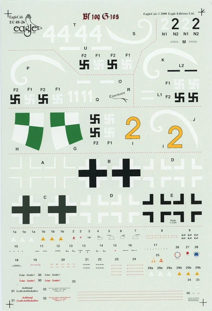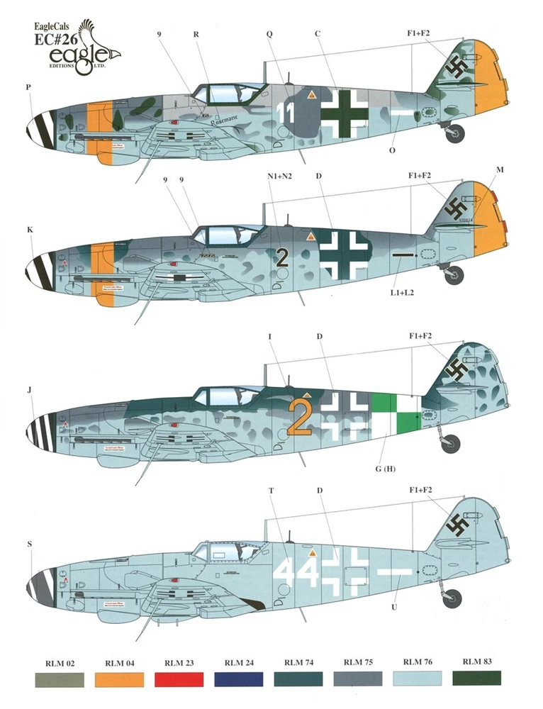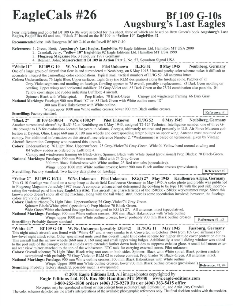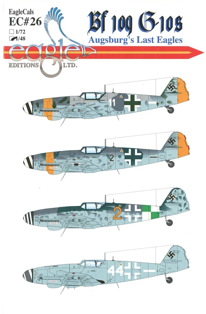 EAGLECALS DECALS EC#48-026 MESSERSCHMITT Bf109G-10 AUGSBURG'S LAST EAGLES WW2 JG EAGLECALS DECALS EC#48-026 MESSERSCHMITT Bf109G-10 AUGSBURG'S LAST EAGLES WW2 GERMAN LUFTWAFFE JG (includes STENCILS) Messerschmitt Bf 109 G-10 3R Wehrmacht Luftwaffe (German Air Force 1935-1945) 2./JG 52 White 11 May 1945 - Neubiberg 2./NJG 11 W.Nr.130342/White 44 May 1945 - Fassberg Messerschmitt Bf 109 G-10/U4 2./JG 52 W.Nr.610824/Black 2 May 1945 - Neubiberg KG(J) 27 Yellow 2 May 1945 - Kaufbeuren FREE scheduling, supersized images and templates. Get Vendio Sales Manager. Make your listings stand out with FREE Vendio custom templates! FREE scheduling, supersized images and templates. Get Vendio Sales Manager. Over 100,000,000 served. Get FREE counters from Vendio today!