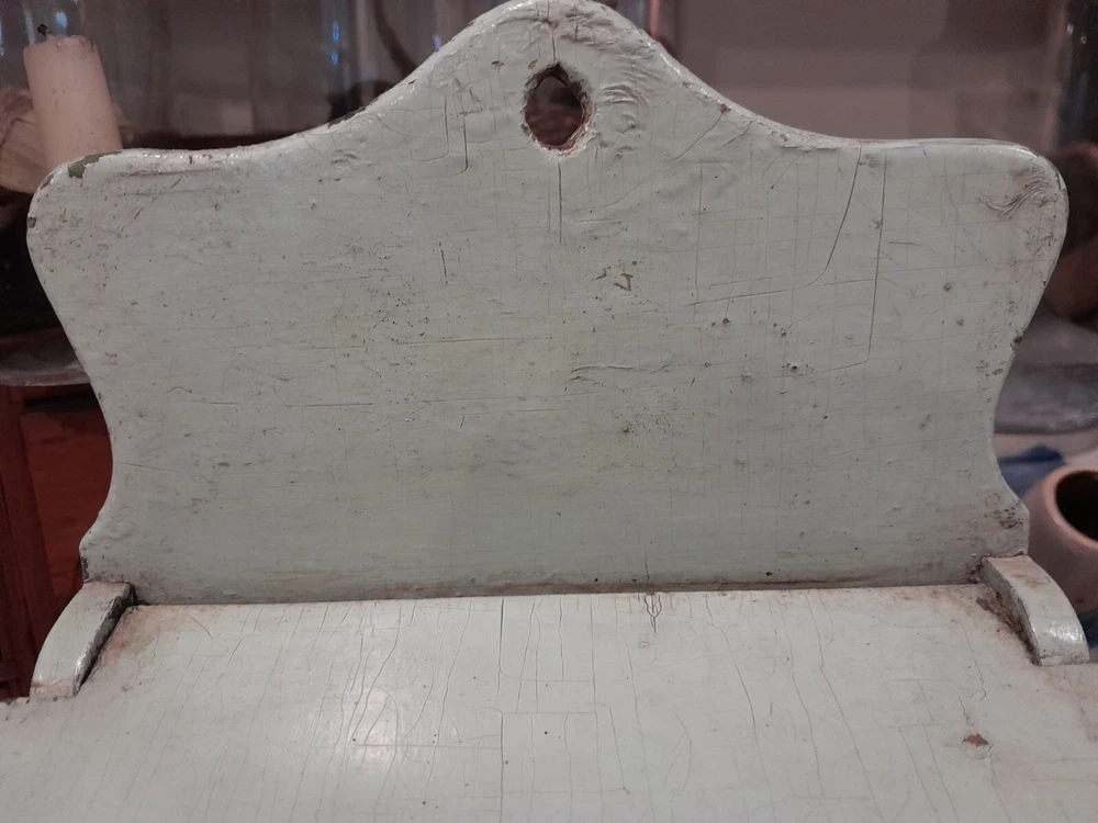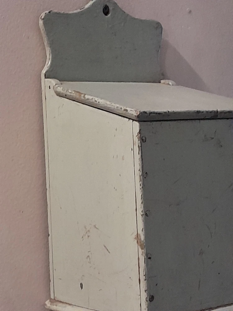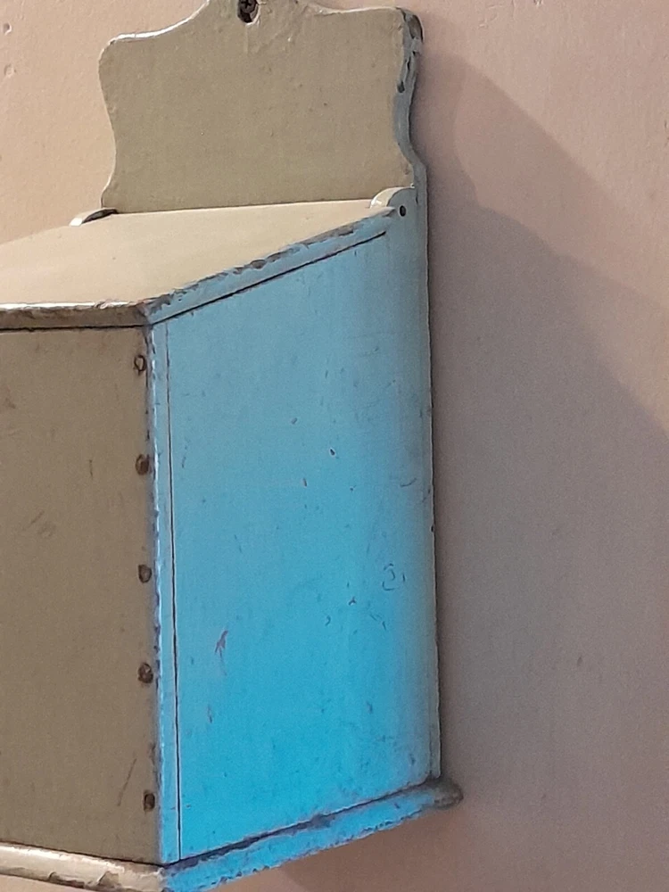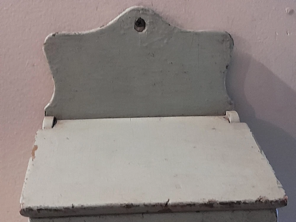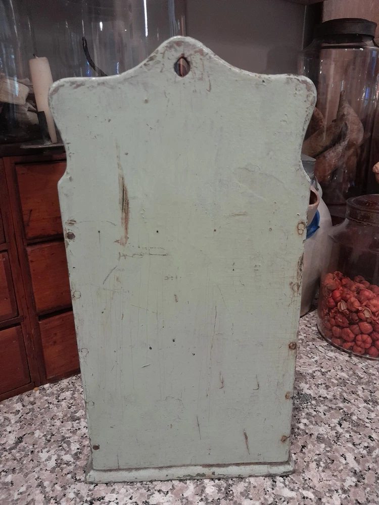 GREAT OLD FARMSTEAD ANTIQUE WALL COUNTER BOX. THIS PIECE HAS NICE DEEP POCKET THAT IS PERFECT FOR DISPLAYING YOUR PRIMITIVE WOODEN WARE OR EARLY CANDLES. THIS BOX CAN BE HUNG ON THE WALL OR SIT ON THE COUNTER. CONDITION IS GOOD EXHIBITING LOTS OF WEAR FROM AGE AND USE. THE PAINT IS CRACKLED AND MISSING IN AREAS AS SHOWN. WONDERFUL EARLY WALL COUNTER BOX FOR YOUR PRIMITIVE COUNTRY FARMHOUSE DECOR. MEASURES 13 1/2" HIGH X 7" WIDE X 7" DEEP. PLEASE EMAIL WITH QUESTIONS.