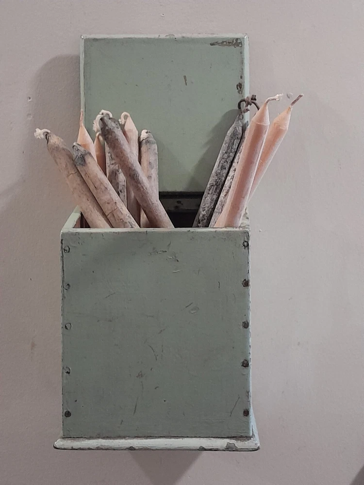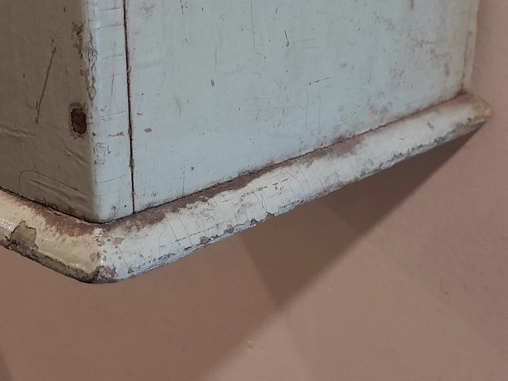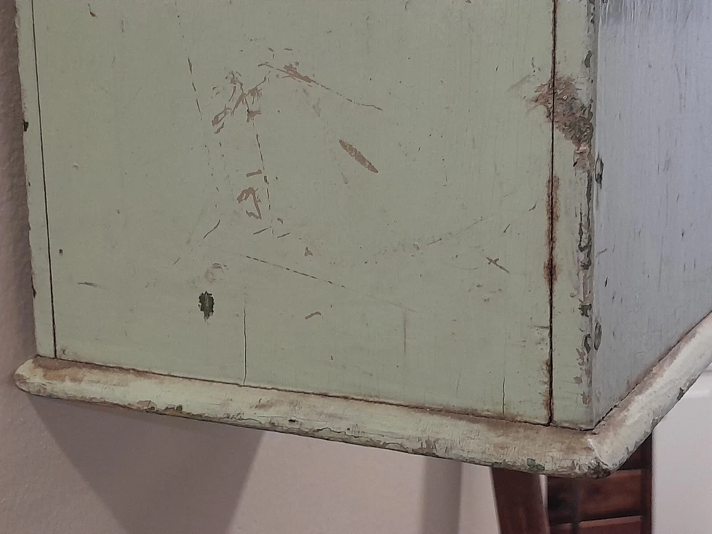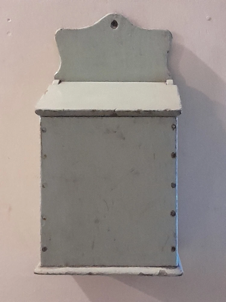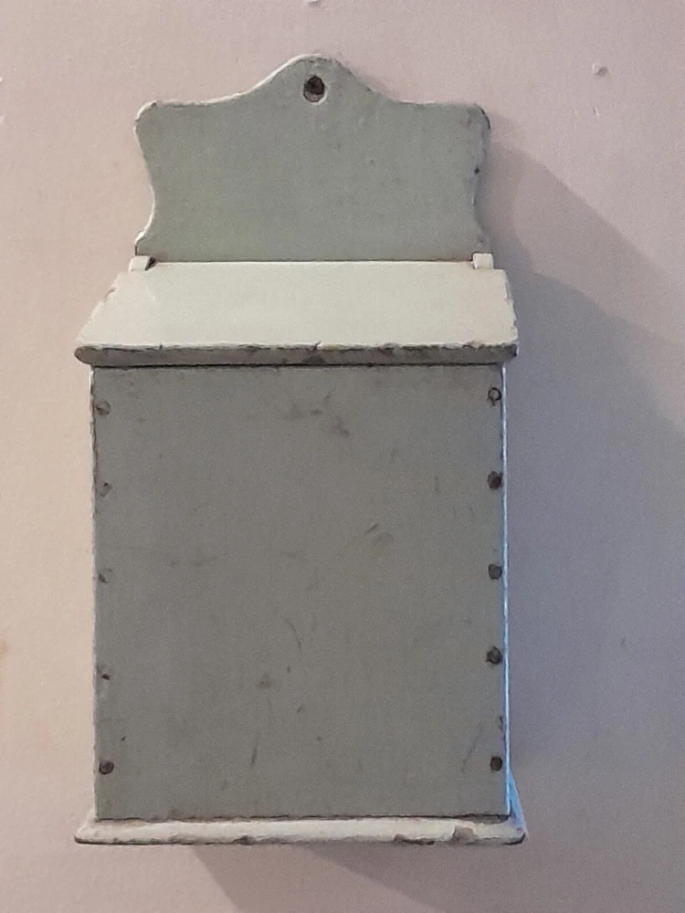 GREAT OLD FARMSTEAD ANTIQUE WALL COUNTER BOX. THIS PIECE HAS NICE DEEP POCKET THAT IS PERFECT FOR DISPLAYING YOUR PRIMITIVE WOODEN WARE OR EARLY CANDLES. THIS BOX CAN BE HUNG ON THE WALL OR SIT ON THE COUNTER. CONDITION IS GOOD EXHIBITING LOTS OF WEAR FROM AGE AND USE. THE PAINT IS CRACKLED AND MISSING IN AREAS AS SHOWN. WONDERFUL EARLY WALL COUNTER BOX FOR YOUR PRIMITIVE COUNTRY FARMHOUSE DECOR. MEASURES 13 1/2" HIGH X 7" WIDE X 7" DEEP. PLEASE EMAIL WITH QUESTIONS.
