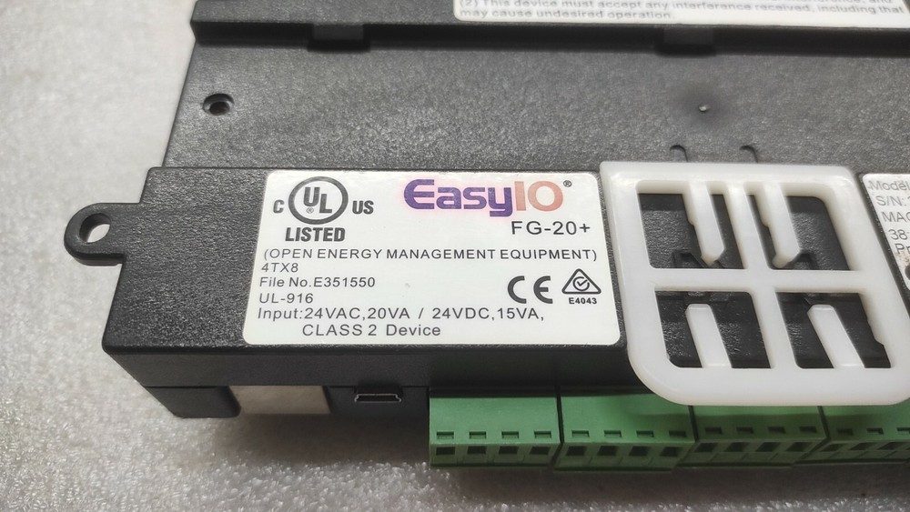 We are pleased to offer EASY IO FG-20+ BMS CONTROLLER Product Detail: EASY IO FG-20+ BMS CONTROLLER MODEL: FG-20+ TYPE: BMS CONTROLLER Shipment processing time: All orders are processed within 1-2 business days. Orders are not shipped or delivered on weekends or holidays. Shipment confirmation & Order tracking: You will receive a Shipment Confirmation email once your order has shipped containing your tracking number(s). The tracking number will be active within 24 hours. Customs, Duties and Taxes: We are not responsible for any customs and taxes applied to your order. All fees imposed during or after shipping are the responsibility of the customer (tariffs, taxes, etc.). Damages: In case of damage or lost of shipment during transit, We will investigate the matter and provide the satisfactory resolution. Returns Policy: We offer return or exchange of ordered item up to 30 days of receipt of goods in subject to certain condition. In case of damaged goods we shall offer the replacement or refund for the ordered item. If you require any more details, request you to send us the direct message through eBay for early resolution. Thanks
