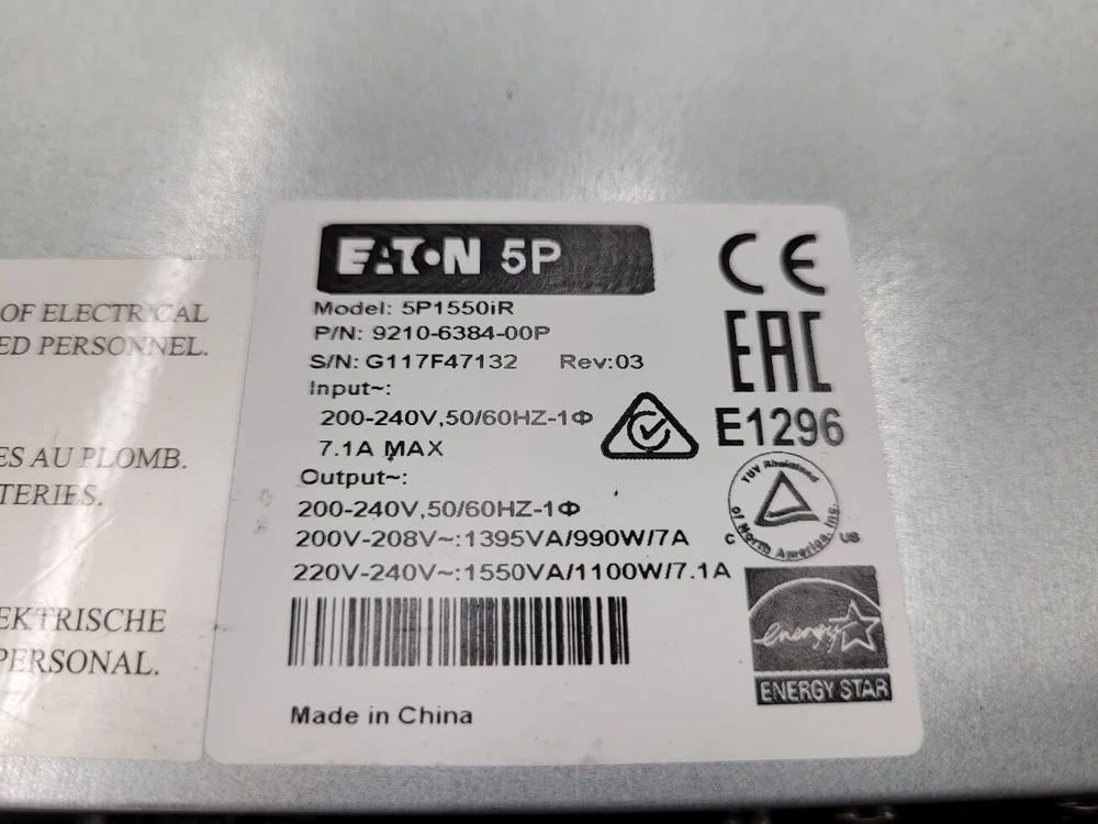 EATON INFINIDAT 5P1550iR 9210-6384-00P 1550VA 240VAC 1100W 7.1A UPS Load Tested Excellent used condition, power on load tested as pictured, units charge and discharge as they should, supported a 200W load for a reasonable time, display seemed to track power vs time accurately as used. That being said, this is a used backup battery and it will have some degraded performance vs new. This item is free shipping to the lower 48 States, contact us for a quote elsewhere. Feel free to contact us with any questions Thank you for your interest and have a great day! International buyers - please note: Import duties, taxes, and charges are not included in the item price or postage cost. These charges are the buyer's responsibility . Please check with your country's customs office to determine what these additional costs will be, prior to bidding or buying . If you are using an International freight-forwarding or mail redirection- You are not covered through the eBay money-back guarantee if your item was sent to another address after original delivery, unless you request to use the eBay Global Shipping Program or eBay International Standard Delivery. We are not responsible for any items after they have arrived at a third-party freight-forwarder or mail redirection service .