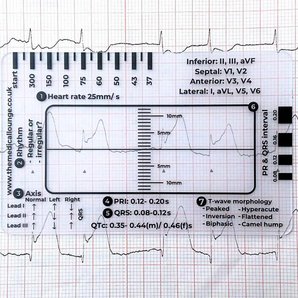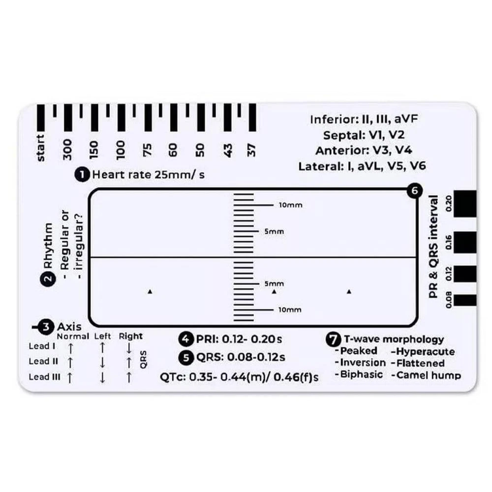 Description Description&Preview shipping&policy Description: Product name:ECG assessment tool Product size about :8.6*5.4cm/3.38*2.12in Product color: As shown in the figure Product material:PP product features: A transparent ID sized card making ECG interpretation easy. Whos it for? Anyone undertaking ECG/ EKG practise from a student up to an experienced clinician. Perfect sized to fit in your ID card holder for easy storage and access, specifically designed with the 7 step ECG interpretation method in mind. With a follow along step by step process with reference points along the way for those hard to remember key points! Heart rate- This will provide a quick but approximate heart rate. Rhythm- Assess whether the heart rate is regular or irregular Axis- A quick reference for normal, left or right axis deviation. The arrows pointing up indicate a positive deflection & arrows pointing down indicate a negative deflection. PR interval- This gives you a reference of the PRI range in milliseconds. Also to the right side, are blocks you can measure the PRI. QRS interval- As above this gives you the range of the QRS & QTc in milliseconds and again you can measure the QRS interval with the blocks. ST elevation/ depression- Place the straight back line along the isoelectric line to assess if there is either ST elevation or depression also there is a ruler so you can measure the degree of either in millimetres. T wave- Lastly, a quick reference for potential T wave abnormalities. Plus top right references the leads view of the heart which comes in handy when identifying the area of a myocardial infarction. Remember: V1-V4= Anteroseptal MI & V3-V6= Anterolateral MI Made in the UK from recycled plastics that is biodegradable. Laminated for extra durability -Note: This is not a diagnostic tool but an aide to help you read an ECG. If everything comes back normal from the 7 step plan this doesnt mean the ECG will be normal & will not provide a diagnosis. Please always refer to your local policies and training. -AFTER-SALES SUPPORT: If you have any questions or concerns about our products, please feel free to contact us. We will be happy to serve you and ensure your satisfaction. Precautions: 1. As we all know , the different computers display colors differently, the color of the actual item may vary slightly from the following images. 2. If you feel difficult to choose the size, you can contact us at any time. We will give you some suggestions, but for your reference only. Package Included: 1 pcs ECG 7 step ruler Preview: Thank you for your purchase Problems? You can follow below process to contact us. There is a time zone difference,but we will do our best to quickly response to your questions: Shipping ● We will arrange shipping for you within 24 Hours after payment cleared except the holidays. ● We always send the item to the address you give us on Payoneer to ensure the security of the item. If you have changed your address, or want us to ship to another address, please change to the new address when you pay us with Payoneer, otherwise we will not be responsible if the package is lost. Payments We accepts Payoneer only If you have any questions about the payment,please contact us through eBay message. Import Duties In case some duty is due Upon delivery, it is your responsibility to meet that expense and this may cause delays to delivery schedule and you may have to pickup goods at the customs office. Terms & Conditions By bidding on this item,the Buyer agrees to all of the terms and conditions as outlined in this listing .please ensure to read and agree to All eBay terms and Conditions before bidding. All pictures are for illustration purpose only and Colours may vary slightly. Our store obeys all eBay Rules and Policies. Returns Policy To Return an item you must contact us and take photos of your item to clearly show any damage or unusual aspects of it. Approved returns will be subject to inspection on arrival. Items must be returned in original condition with all original packaging. All shipping and handing charges are non-refundable Return delivery costs are the responsibility of the buyer. We will cover the cost if sending replacement/repaired items. Within 7 days after receiving your products, we offers a no-hassle 7 day exchange/replace only if your items are found to be defective by manufacturer.