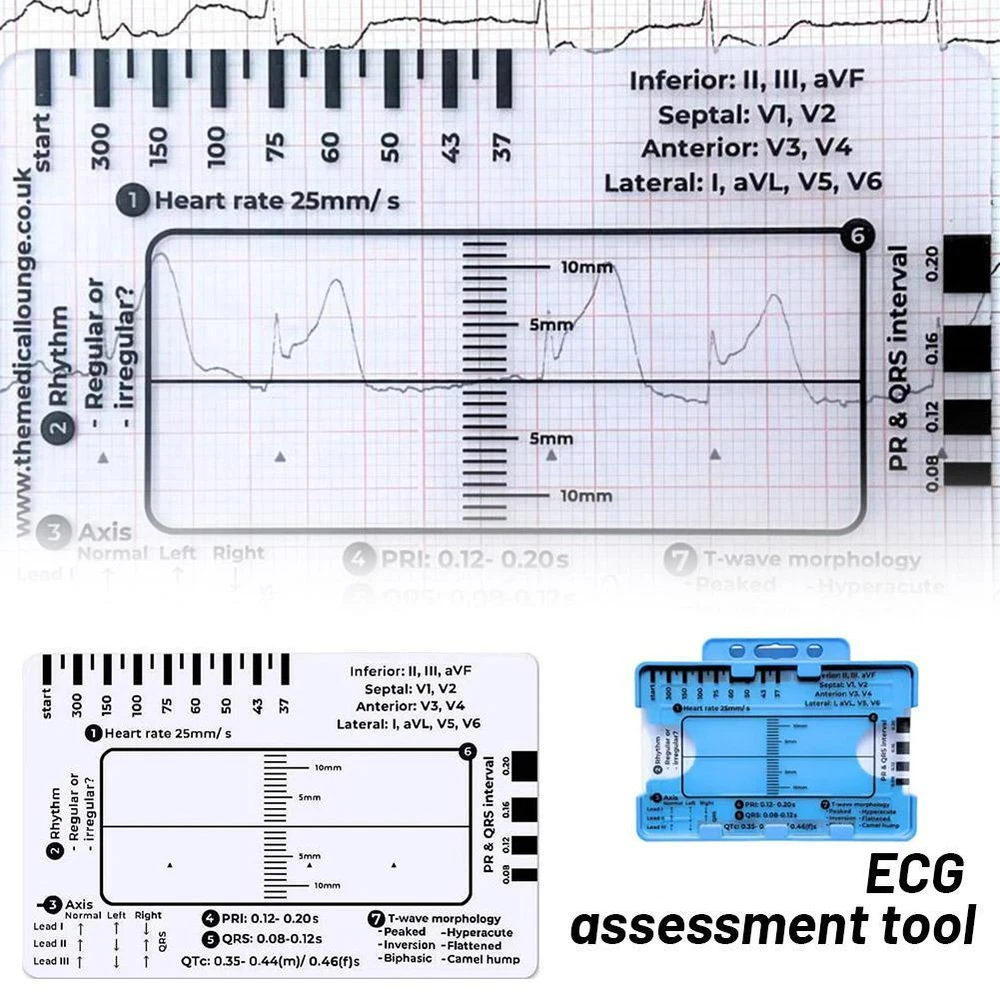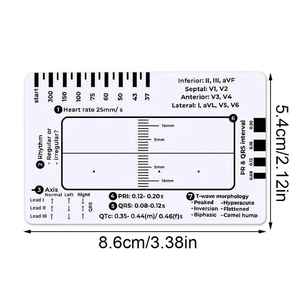 Description Description&Preview shipping&policy Description: Product name:ECG assessment tool Product size about :8.6*5.4cm/3.38*2.12in Product color: As shown in the figure Product material:PP product features: A transparent ID sized card making ECG interpretation easy. Whos it for? Anyone undertaking ECG/ EKG practise from a student up to an experienced clinician. Perfect sized to fit in your ID card holder for easy storage and access, specifically designed with the 7 step ECG interpretation method in mind. With a follow along step by step process with reference points along the way for those hard to remember key points! Heart rate- This will provide a quick but approximate heart rate. Rhythm- Assess whether the heart rate is regular or irregular Axis- A quick reference for normal, left or right axis deviation. The arrows pointing up indicate a positive deflection & arrows pointing down indicate a negative deflection. PR interval- This gives you a reference of the PRI range in milliseconds. Also to the right side, are blocks you can measure the PRI. QRS interval- As above this gives you the range of the QRS & QTc in milliseconds and again you can measure the QRS interval with the blocks. ST elevation/ depression- Place the straight back line along the isoelectric line to assess if there is either ST elevation or depression also there is a ruler so you can measure the degree of either in millimetres. T wave- Lastly, a quick reference for potential T wave abnormalities. Plus top right references the leads view of the heart which comes in handy when identifying the area of a myocardial infarction. Remember: V1-V4= Anteroseptal MI & V3-V6= Anterolateral MI Made in the UK from recycled plastics that is biodegradable. Laminated for extra durability -Note: This is not a diagnostic tool but an aide to help you read an ECG. If everything comes back normal from the 7 step plan this doesnt mean the ECG will be normal & will not provide a diagnosis. Please always refer to your local policies and training. -AFTER-SALES SUPPORT: If you have any questions or concerns about our products, please feel free to contact us. We will be happy to serve you and ensure your satisfaction. Precautions: 1. As we all know , the different computers display colors differently, the color of the actual item may vary slightly from the following images. 2. If you feel difficult to choose the size, you can contact us at any time. We will give you some suggestions, but for your reference only. Package Included: 1 pcs ECG 7 step ruler Preview: Thank you for your purchase Problems? You can follow below process to contact us. There is a time zone difference,but we will do our best to quickly response to your questions: Shipping ● We will arrange shipping for you within 24 Hours after payment cleared except the holidays. ● We always send the item to the address you give us on Payoneer to ensure the security of the item. If you have changed your address, or want us to ship to another address, please change to the new address when you pay us with Payoneer, otherwise we will not be responsible if the package is lost. Payments We accepts Payoneer only If you have any questions about the payment,please contact us through eBay message. Import Duties In case some duty is due Upon delivery, it is your responsibility to meet that expense and this may cause delays to delivery schedule and you may have to pickup goods at the customs office. Terms & Conditions By bidding on this item,the Buyer agrees to all of the terms and conditions as outlined in this listing .please ensure to read and agree to All eBay terms and Conditions before bidding. All pictures are for illustration purpose only and Colours may vary slightly. Our store obeys all eBay Rules and Policies. Returns Policy To Return an item you must contact us and take photos of your item to clearly show any damage or unusual aspects of it. Approved returns will be subject to inspection on arrival. Items must be returned in original condition with all original packaging. All shipping and handing charges are non-refundable Return delivery costs are the responsibility of the buyer. We will cover the cost if sending replacement/repaired items. Within 7 days after receiving your products, we offers a no-hassle 7 day exchange/replace only if your items are found to be defective by manufacturer.